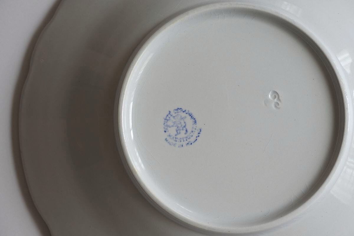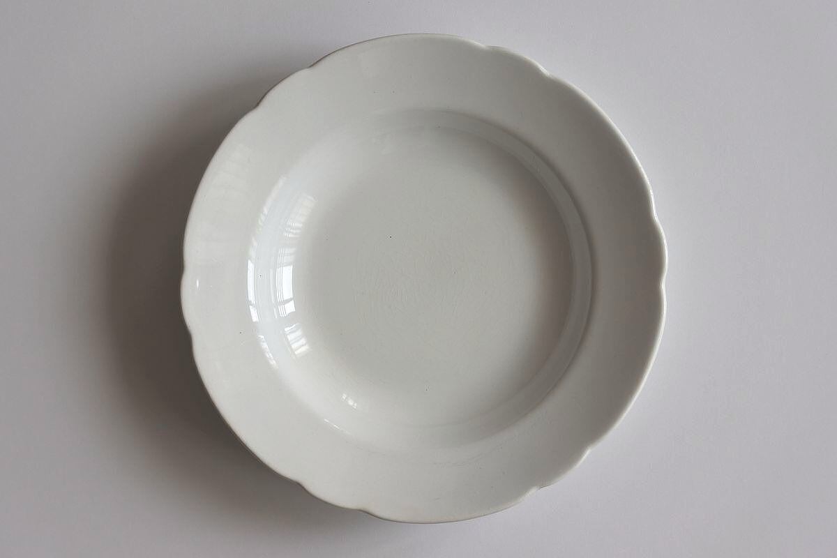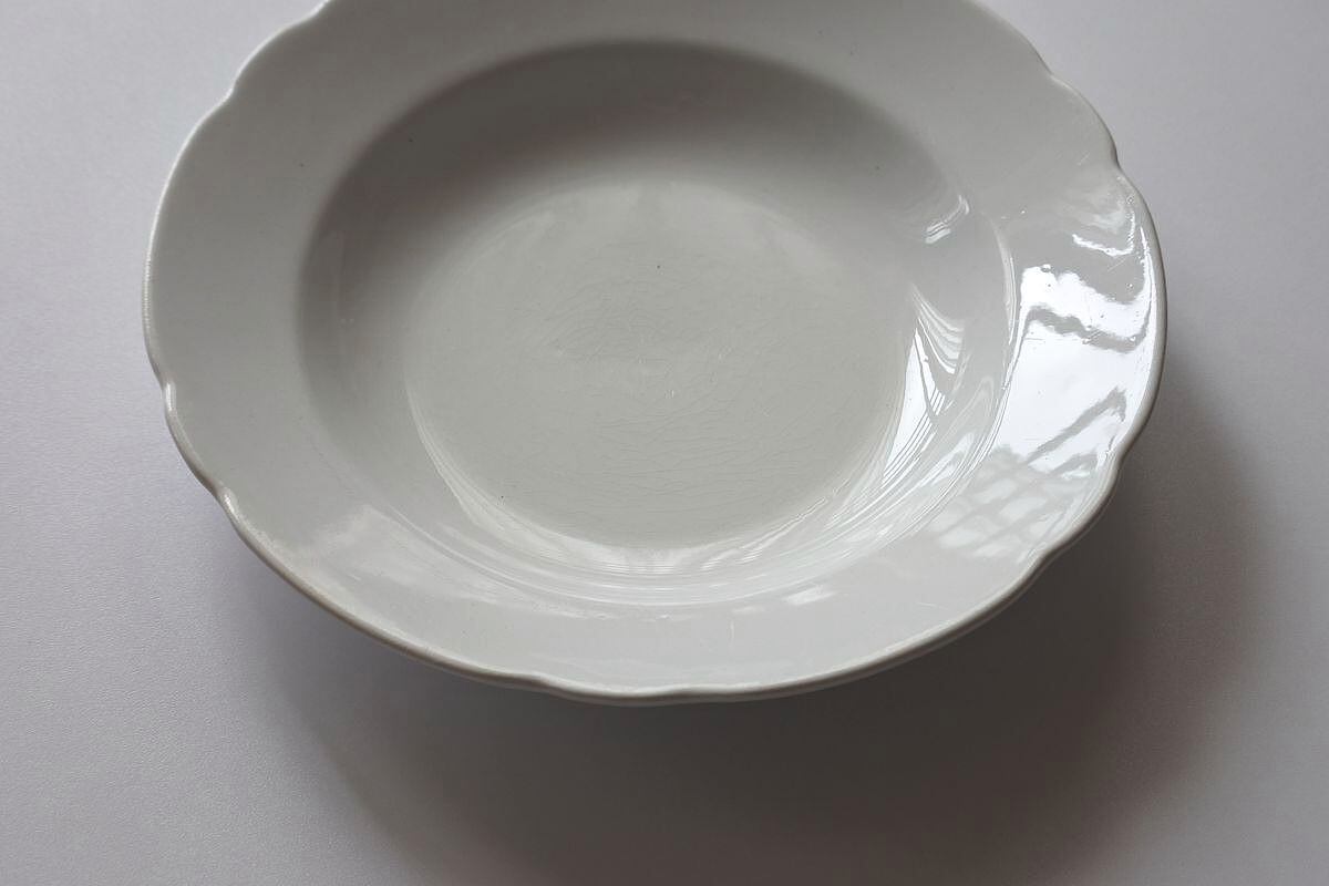 19世紀半ばから20世紀初め頃にかけて最盛期にあったMaastricht(マーストリヒト)窯 Societe Ceramique(ソシエテ・セラミック)社の深皿。夏空にもくもくわいた雲を思わせる白さとフォルムに惹かれ、マーケットなどで見かけると手に取ってしまいます。フランスの花リムに比べると大らか。厚みのある釉薬が、丸みを帯びた素朴な印象を醸し出しています。