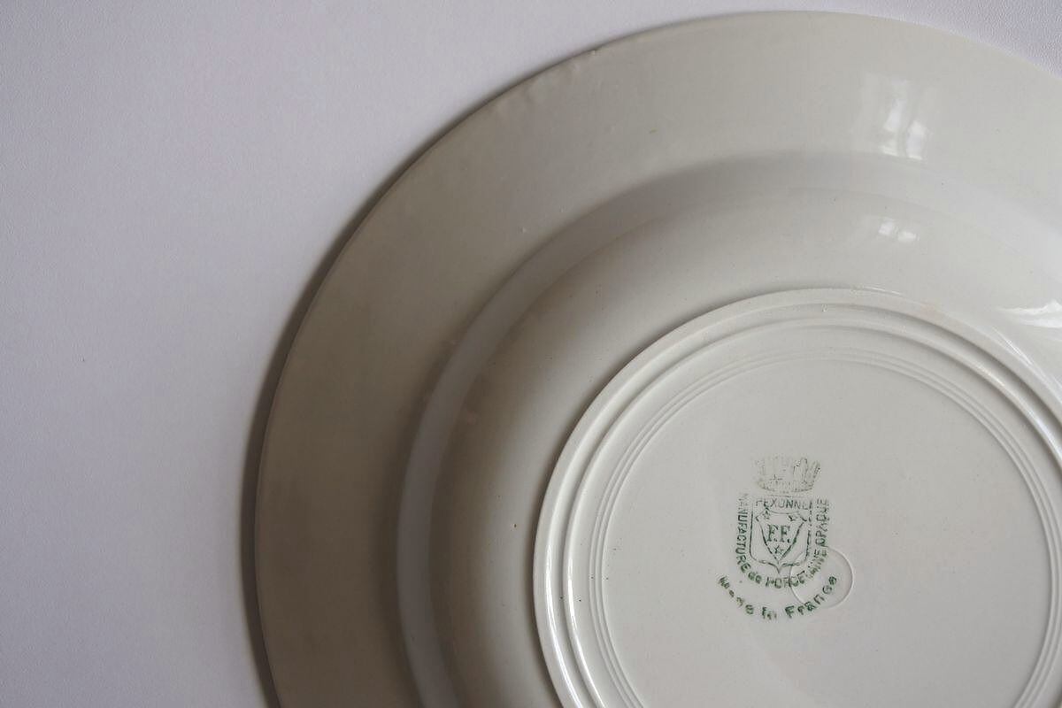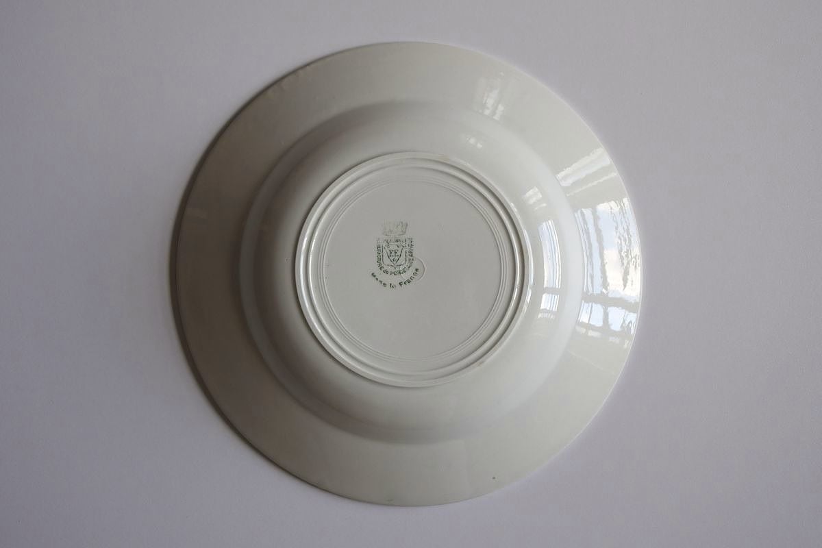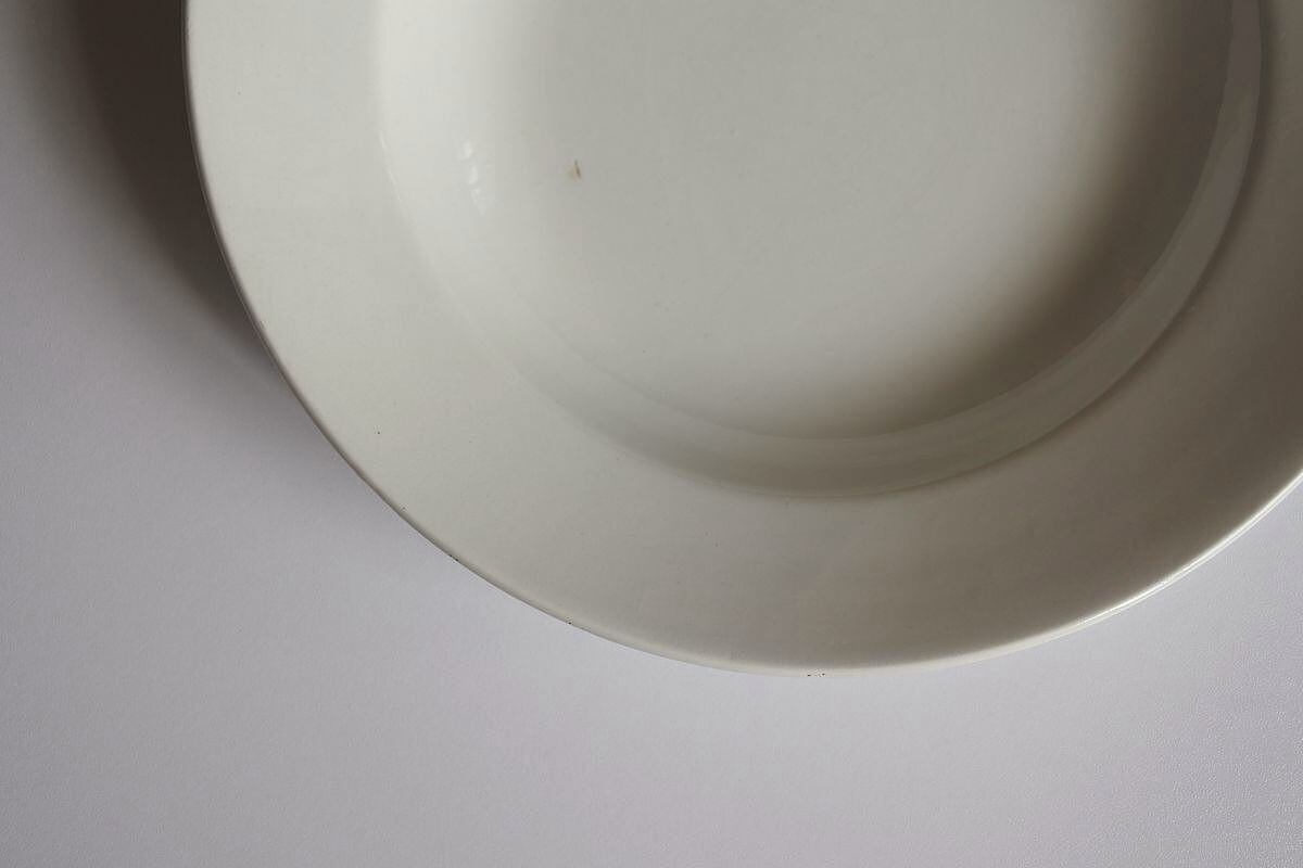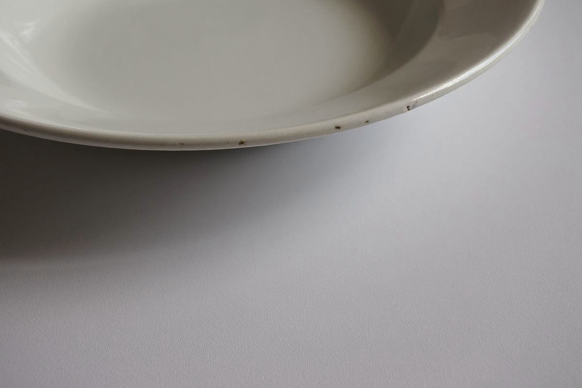 素朴でやわらかな白。フランス北東部ロレーヌ地方にあったPexonne (ペクソンヌ)窯の浅リム皿です。特別なものではありませんが、釉薬の質感、丸みのあるフォルム、手に持った時の軽さなど、古い時代の陶器ならではの味わいがあります。ロレーヌ地方は自然に恵まれ名窯が多いことで知られており、ペクソンヌ窯もそのひとつ。Made in Franceの印があるので、1900年代初めに輸出用につくられたものかと思います。いつもの食材やお料理が、ちょっと違った表情で楽しめるかもしれません。