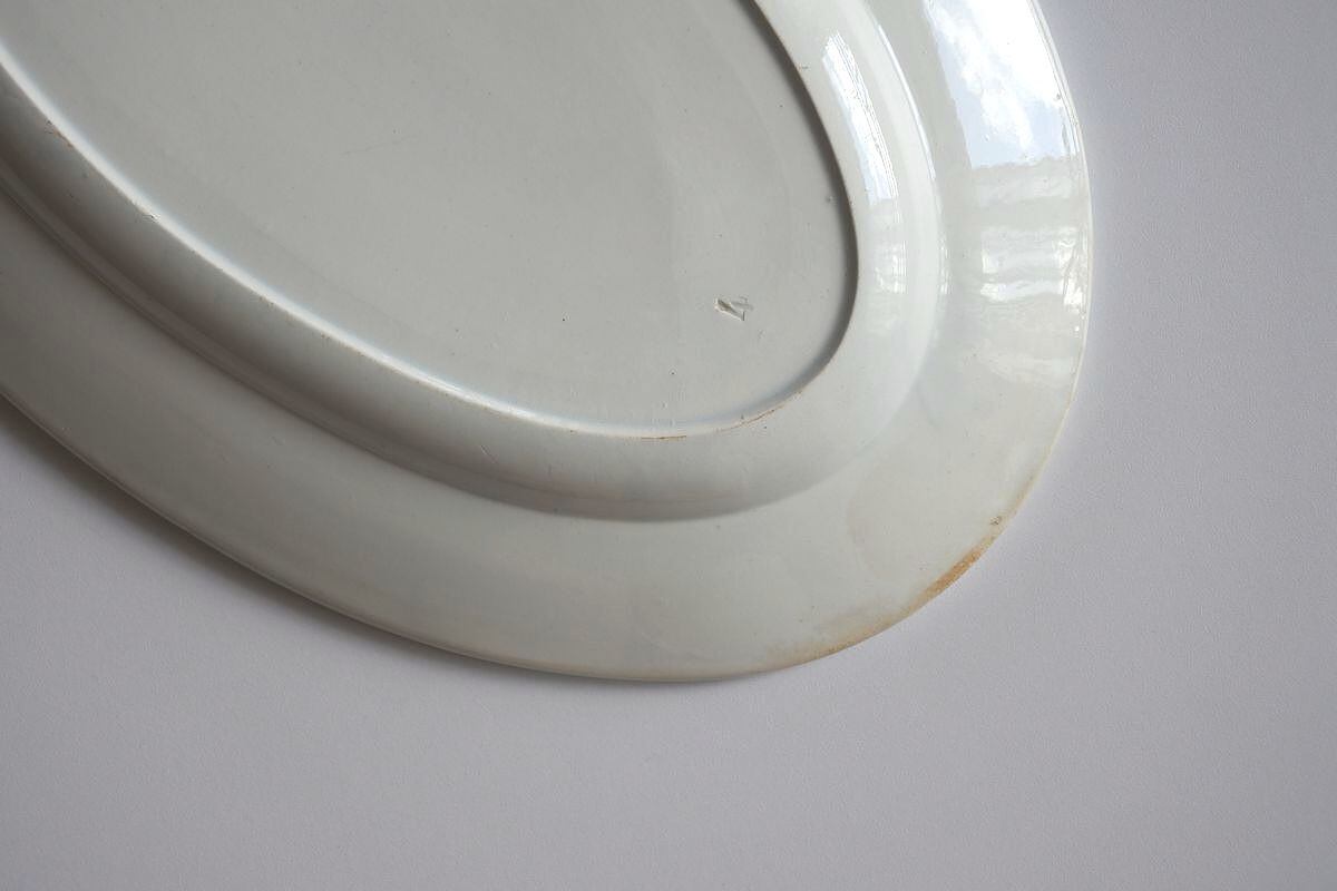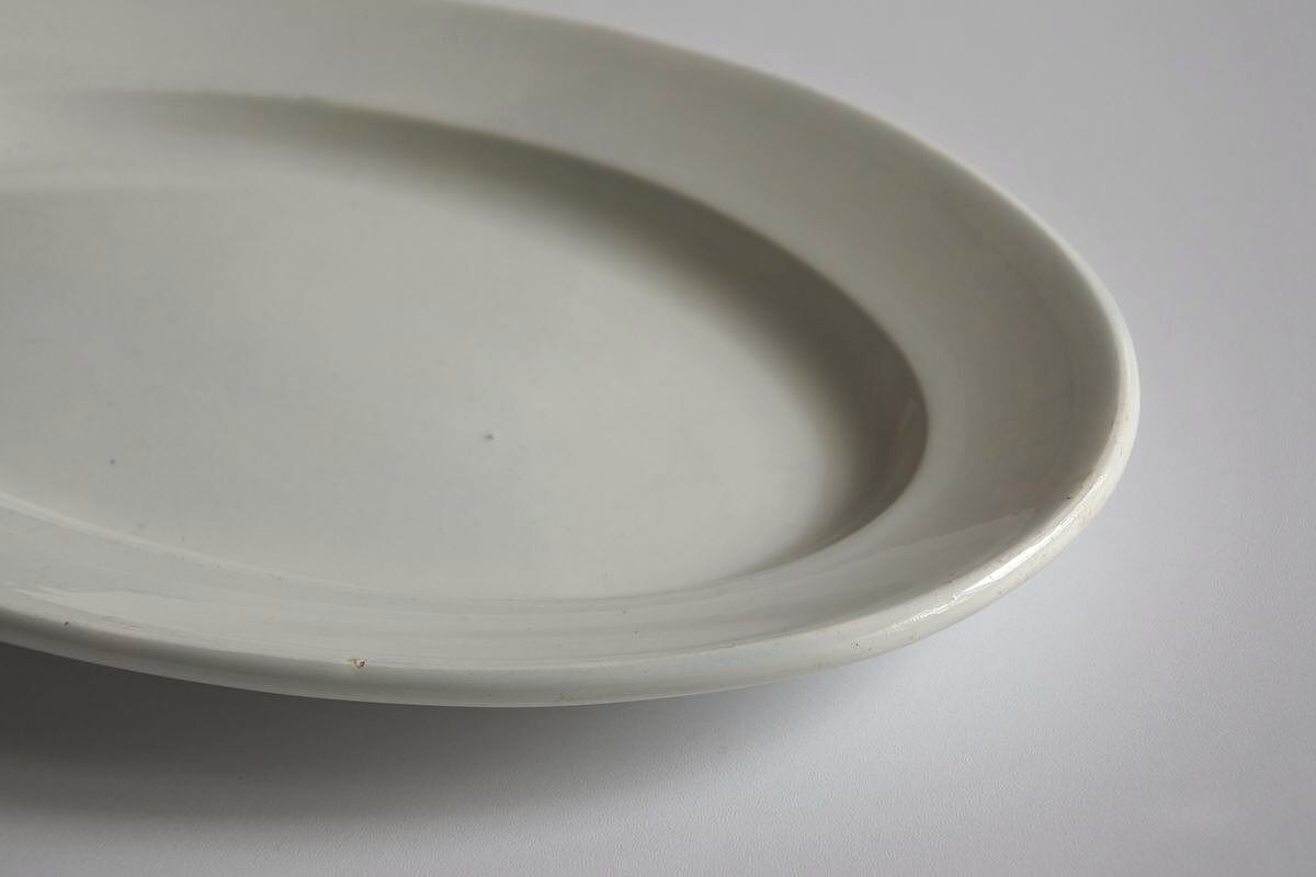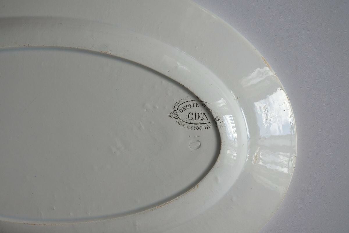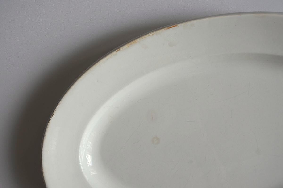 厚みのあるフォルムが、どこか親しみやすさを感じさせるGian(ジアン)窯のオーバル皿。すっきりした艶のある白さが涼し気です。細面で、やや小振りの使いやすそうなサイズ。Aの皿よりさらにぽってりと厚く重みがあり、染みやカトラリー跡などが目につきます。古いものの味わいとして楽しんでいただける方におすすめです。19世紀初めパリの南にあるロワール川流域で生まれ、現在も生産を続けているGien(ジアン)窯。ご紹介している皿の窯印は1871~1875年頃に使用されていたタイプのものです。