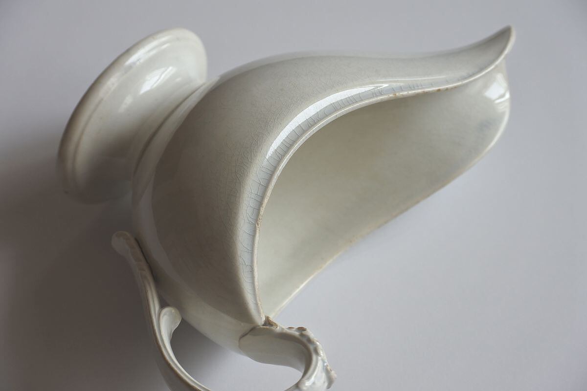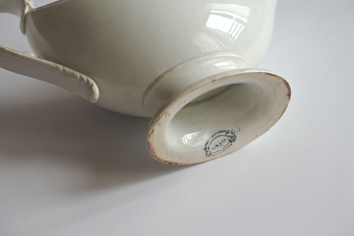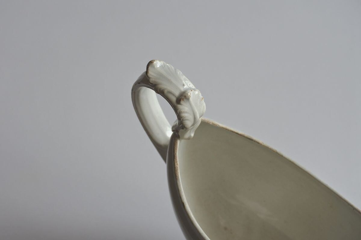 料理にかけるソースやフォン(出汁)を入れて食卓に出された容器。シンプルでエレガントなフォルムです。古い時代の陶器の質感も魅力。1840~1876年頃に使用されていた Creil et Montereau(クレイユ・モントロー)の窯印があります。お花をいけたり、小さなお菓子を入れたりしてディスプレイしても楽しめますが、ただ置いておくだけでも雰囲気あり。Creil et Montereau (クレイユ・モントロー)窯は、19世紀中頃、パリ北部にあったクレイユ窯と南東部にあったモントロー窯が一緒になり設立されました。変遷を辿り、1900年代半ばに閉鎖されましたが、アンティーク陶器の窯元として今も人気のあるひとつです。