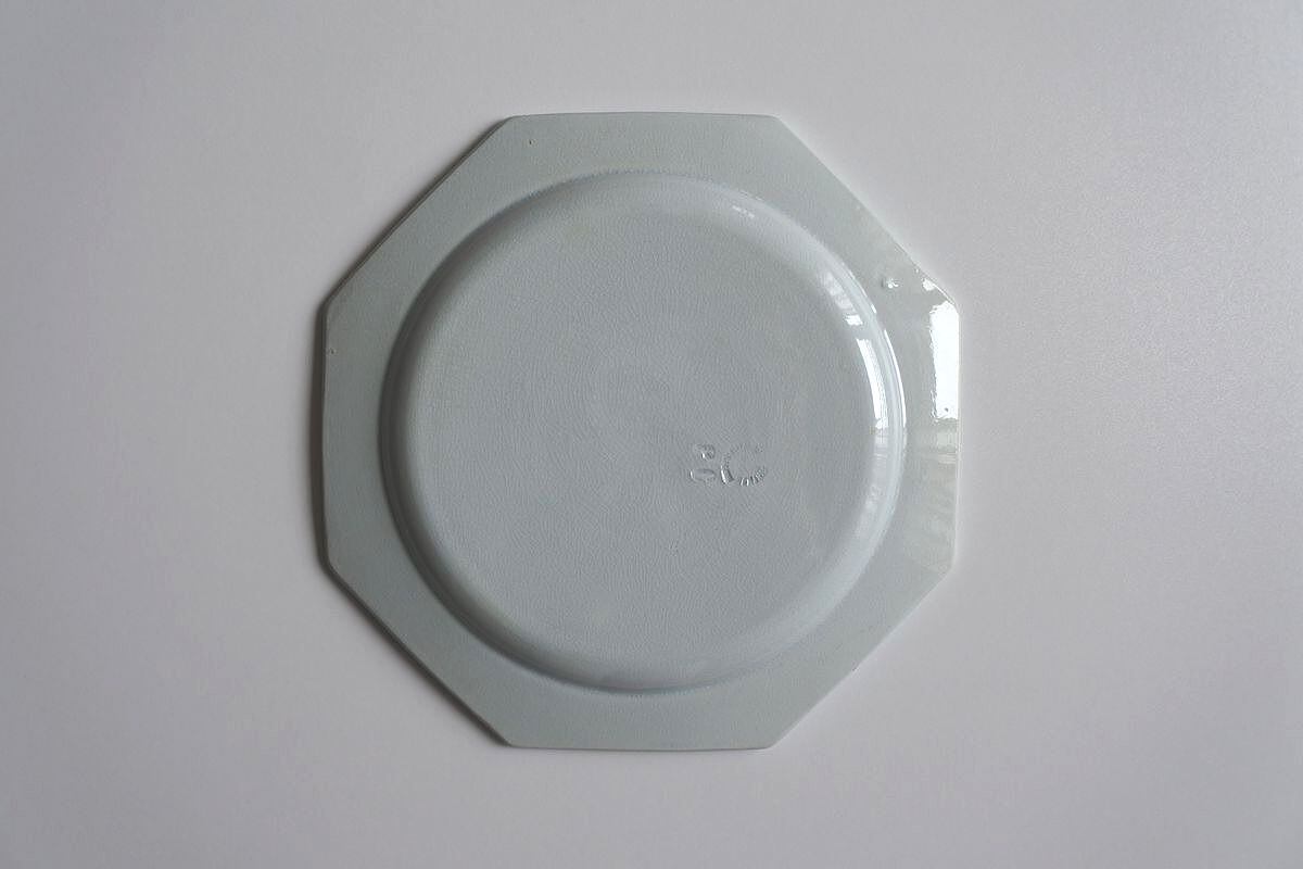Montereau(モントロー)の刻印のある、1920年頃のオクトゴナル平皿です。デザート用の可愛らしいサイズ。19世紀の質感とは異なりますが、当時の新しい技術で古いものを模した面白さがあり、さらにまた長い時間を経て、軽やかさのなかにも落ち着いた雰囲気を漂わせています。ニュアンスのあるペールカラーがどこかノスタルジックな味わい。色の組み合わせや載せるもの次第で、さまざまな印象が楽しめそうです。