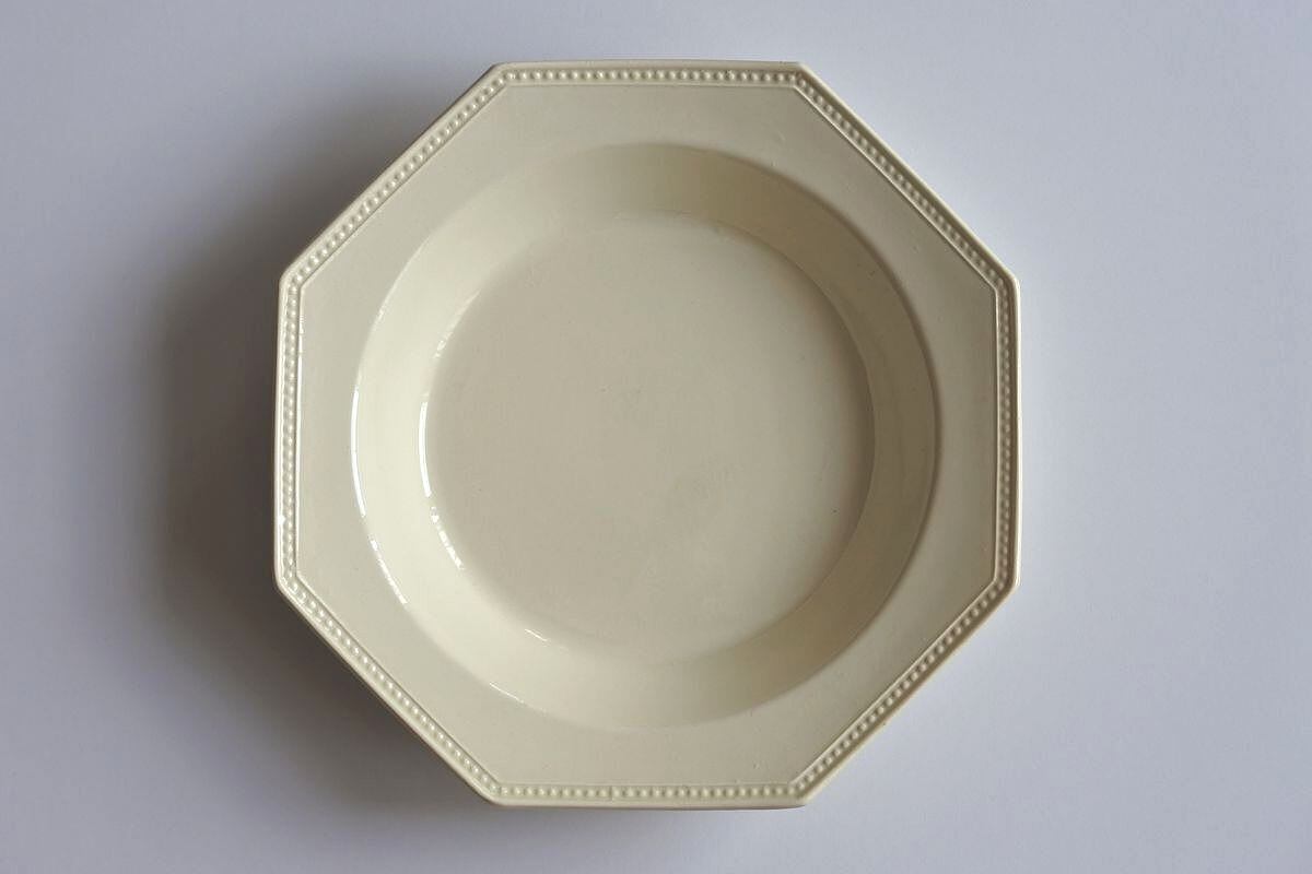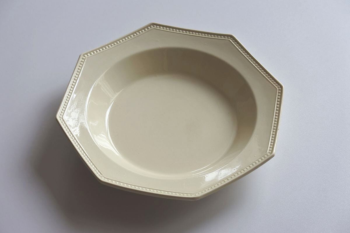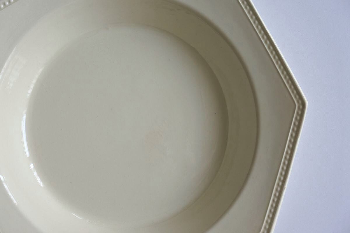 Montereau(モントロー)の刻印のある、1920年頃のオクトゴナル深皿です。19世紀のファイアンスフィーヌを思わせる、黄味がかったアイボリーのような色合い。質感は異なりますが、当時の新しい技術で古いものを模した面白さがあり、さらにまた長い時間を経て、軽やかさのなかにもクラシカルな雰囲気を漂わせています。深鉢としても使えそうな存在感のあるしっかりしたサイズ。さまざまな楽しみ方ができそうです。