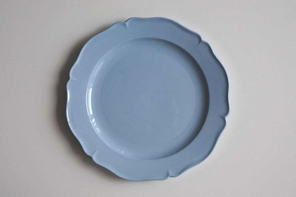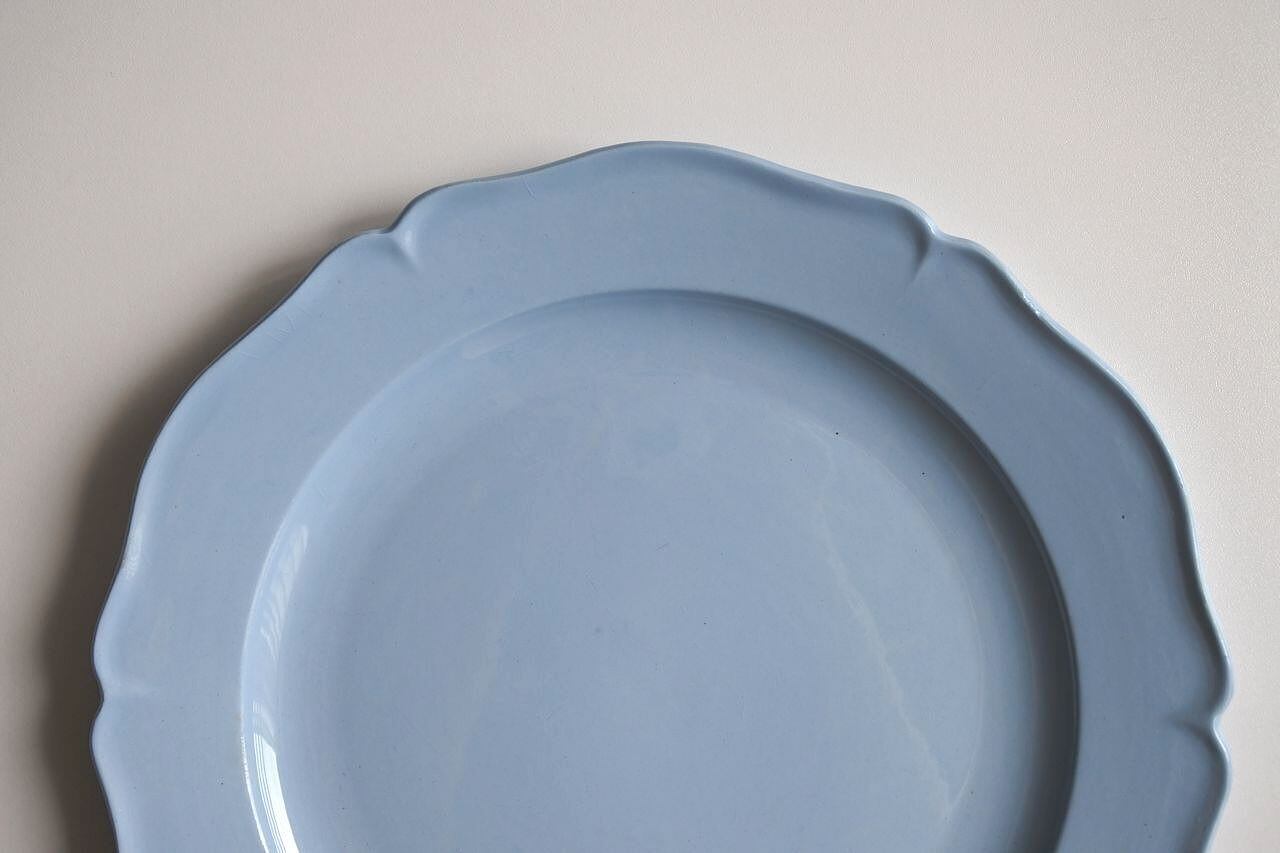Montereau(モントロー)の刻印のある、1920年頃の花リム平皿です。気取らないコテージの夏のテーブルをイメージさせるようなブルー。控えめな花リムが程よい甘さをプラスしています。カットフルーツやフレンチトーストなど、普段のシンプルな料理をホリデー気分で楽しめそうです。19世紀の質感とは異なりますが、当時の新しい技術で古いものを模した面白さがあり、さらにまた長い時間を経て、ノスタルジックな雰囲気を漂わせています。
