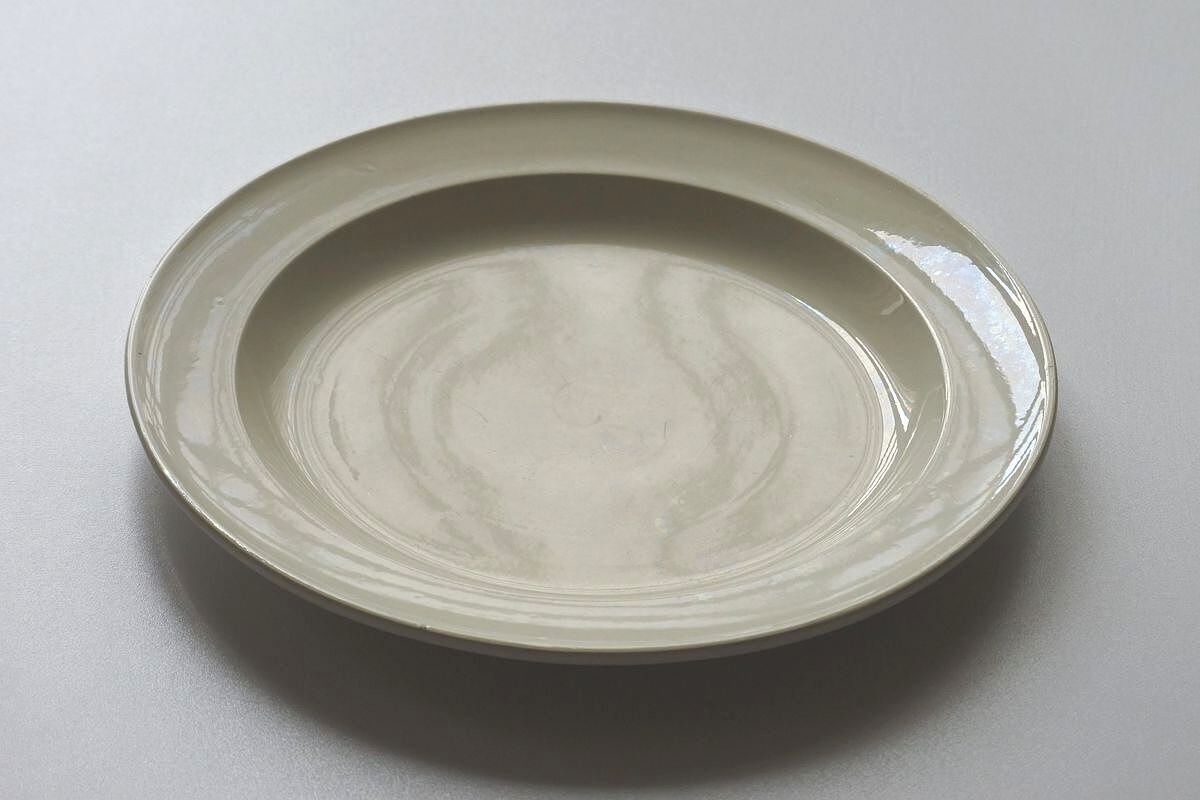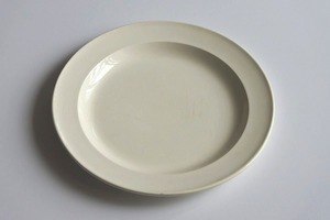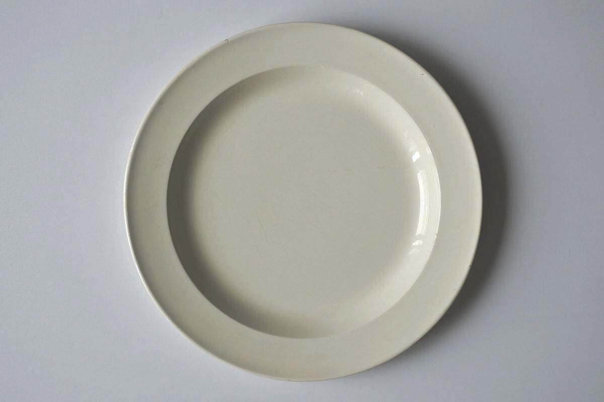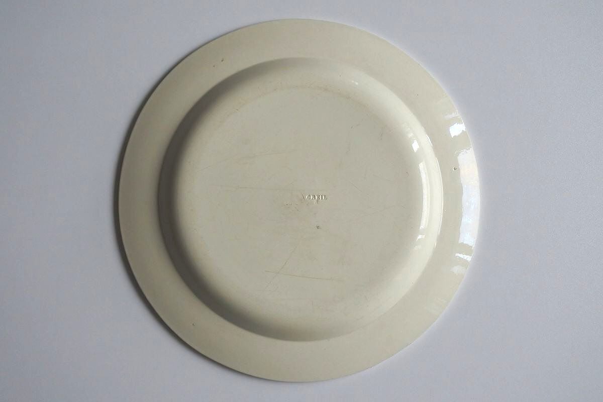 Crei(クレイユ)窯の刻印がある、シンプルな平リム皿。Montereu(モントロー)窯と合併する以前、1800年代初期につくられたファインアンスフィーヌと呼ばれる陶器です。やわらかな象牙色と錫釉のマットな艶感が魅力。フルーツやパンを載せておくだけで絵になりそうです。パリの北部郊外にあったクレイユ窯は、19世紀、イギリスの職人を経営参加させたことで発展したと言われています。Wedgwood(ウェッジウッド)のクリームウェアやクイーンズウェアなど、当時人気のあった同質のイギリス陶器を模しているのが特徴のひとつ。モントロー窯と合併後は生産量も増え、アンティーク陶器の代表的な窯元のひとつとして名を残しています。