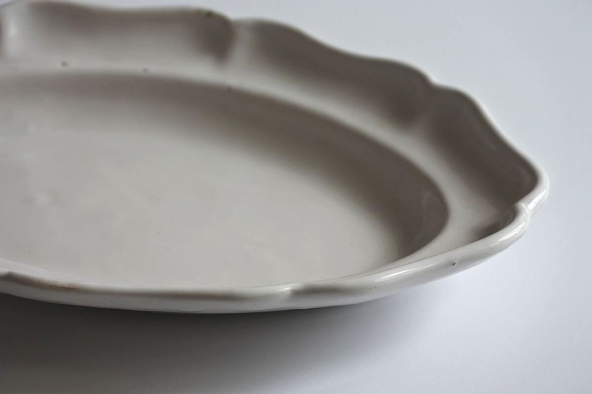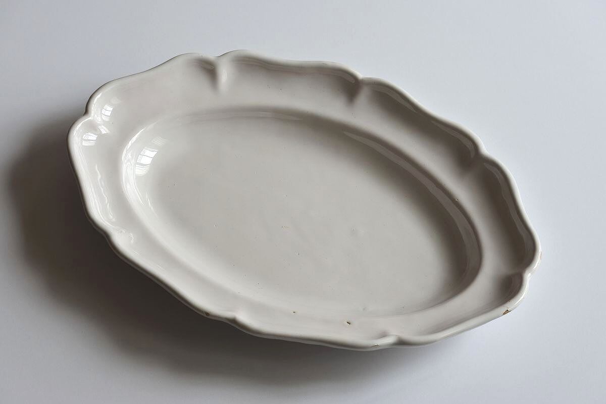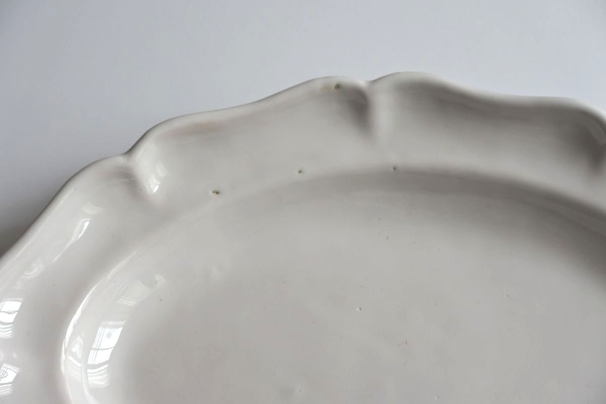 シャープな花リムがフェミニンな雰囲気の、南仏の白釉皿。裏側に×印がある18世紀のムスティエです。プロヴァンス地方にあるムスティエは中世から続く小さな焼きものの村ですが、17世紀半ばイタリアの修道士によってもたらされた技術により、艶めく白い釉薬が魅力的な陶器の窯元として広く知られるようになりました。花リムのフォルムは当時高価だった銀食器を模したものだそうです。上品な甘さとクラシカルさが魅力の一枚。フルーツやパン、焼き菓子を並べても良さそうです。