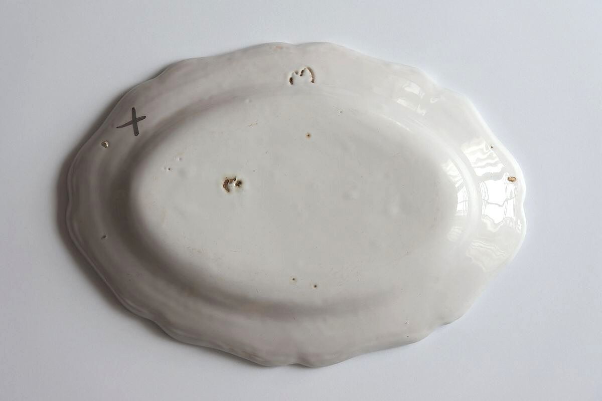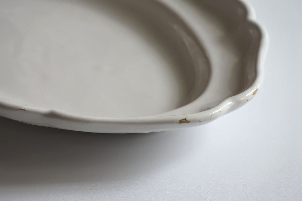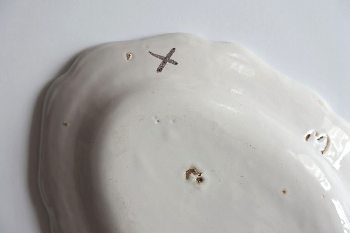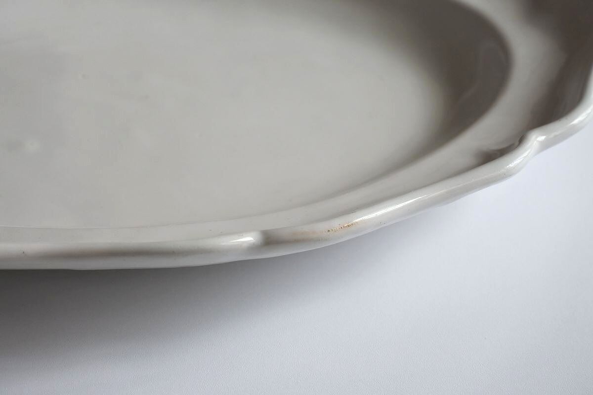 シャープな花リムがフェミニンな雰囲気の、南仏の白釉皿。裏側に×印がある18世紀のムスティエです。プロヴァンス地方にあるムスティエは中世から続く小さな焼きものの村ですが、17世紀半ばイタリアの修道士によってもたらされた技術により、艶めく白い釉薬が魅力的な陶器の窯元として広く知られるようになりました。花リムのフォルムは当時高価だった銀食器を模したものだそうです。上品な甘さとクラシカルさが魅力の一枚。フルーツやパン、焼き菓子を並べても良さそうです。