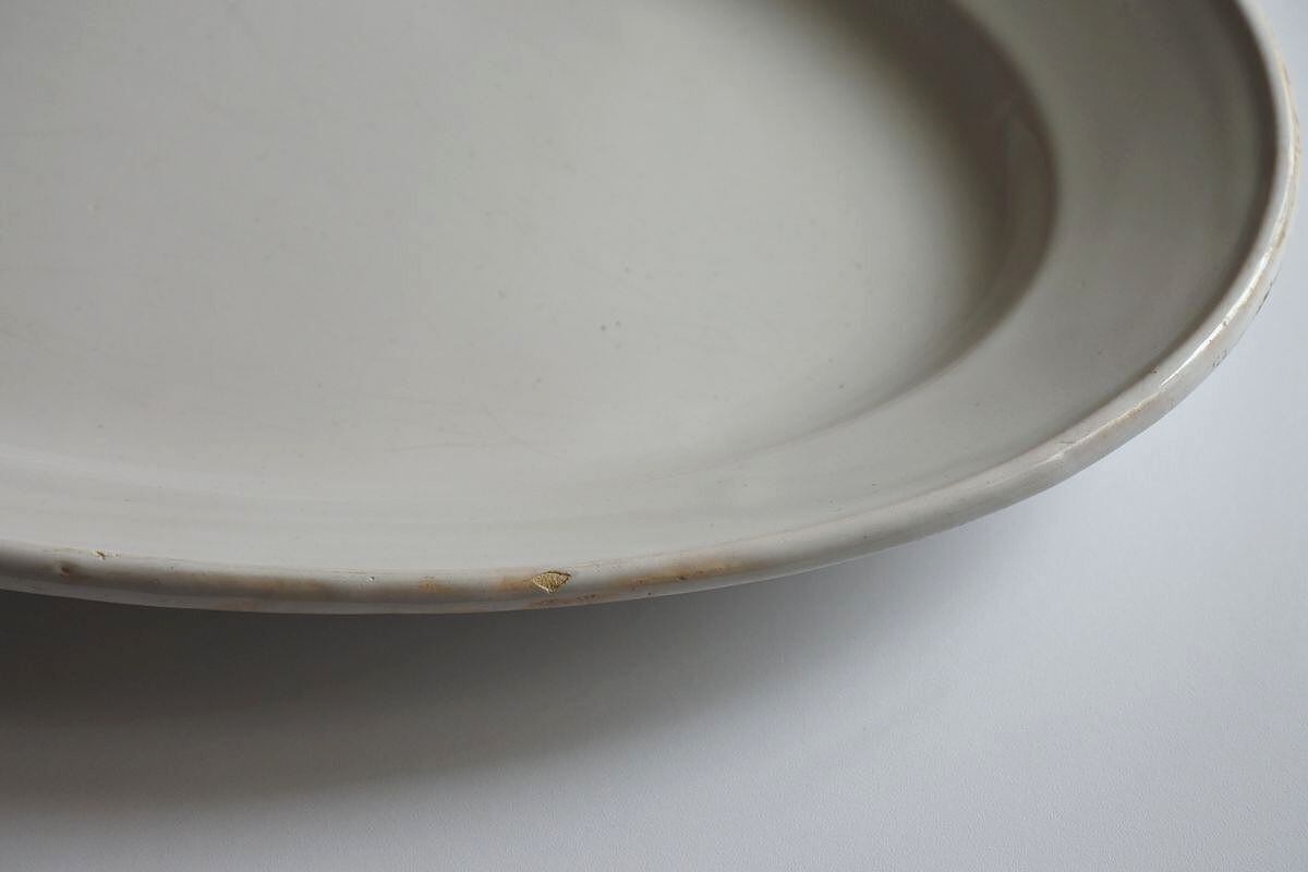 細面のマスキュリンなオーバル皿。質感や胎土の色味、指で弾いた時の金属音などから、南仏のムスティエ窯か近郊で焼かれていた同質のお皿だと思われます。シンプルなフォルムですが、厚い釉薬が全体に丸みを感じさせ、素朴でやわらかな印象。リムのはっきりした輪郭がフレームとしての効果を発揮し、大皿ながら何をのせてもまとまりやすく絵になるのも魅力です。カトラリー跡や所々釉薬の剥がれなど見られますので、古いものの味わいとして楽しんで下さるかたにおすすめします。