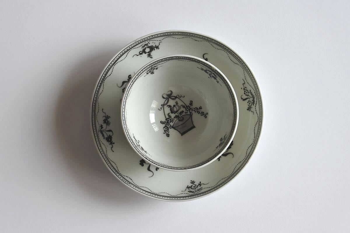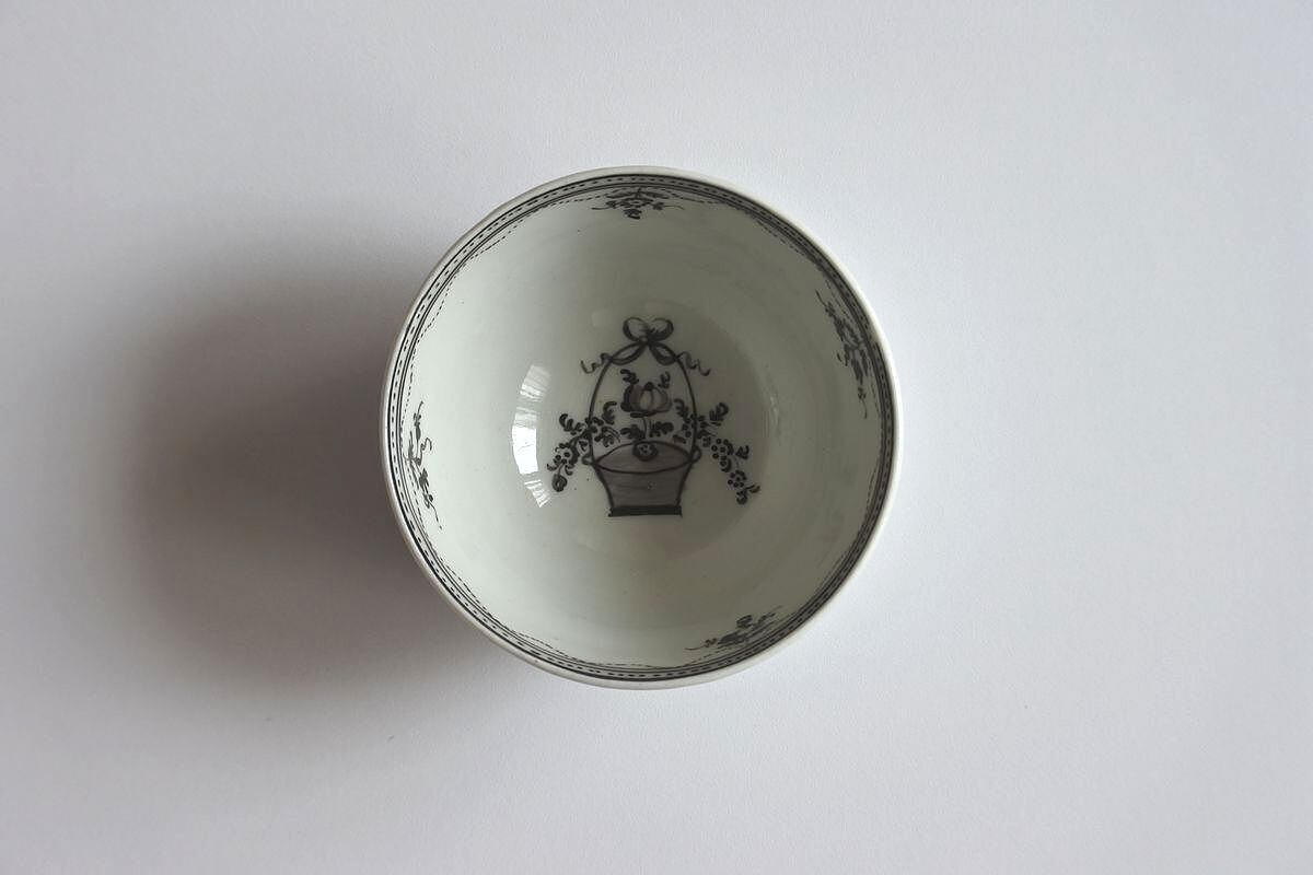 19th C. English Monochrome Tea Bowl and Saucer, Hand Painted Flower Basket C