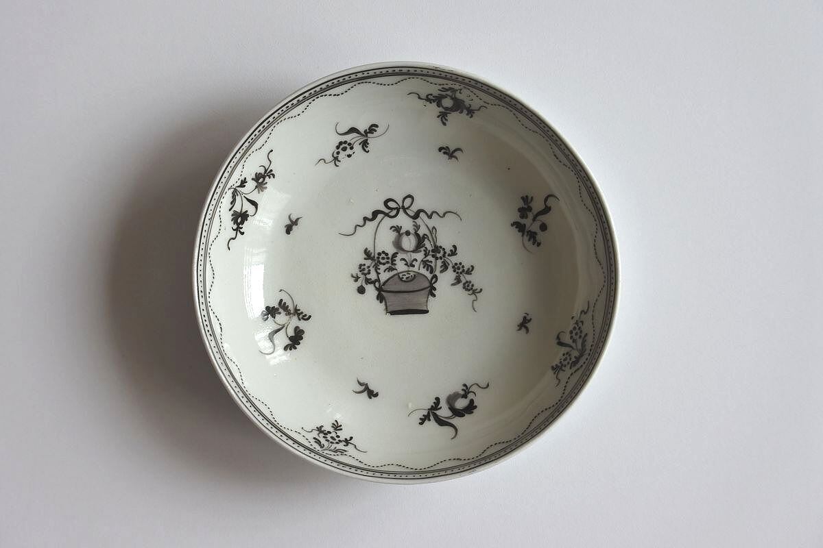 古い時代のボウルは赤や黄などカラフルな絵付けのものが多いですが、モノクロの花かごが可愛らしくもシックな印象。19世紀半ば、ヴィクトリア女王が夫を亡くされた後常に喪服を身に着けるようになったことで、陶磁器にも黒やブルーグレーなど単色の絵付けが好まれた時期があるそうです。その頃につくられたものかもしれません。いずれにせよ古陶磁に変わりはなく、ひとつひとつ手描きの味わいの異なる絵付けや、フォルムの歪み、灰色がかった乳白色の肌合いなども魅力です。