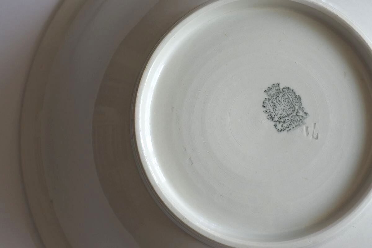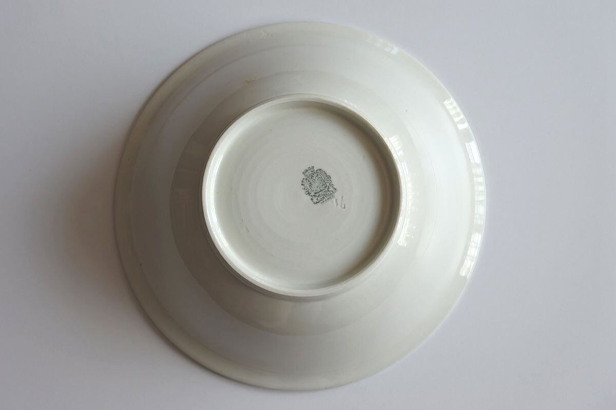 シンプルなフォルムの深鉢。Badonvuller(ヴァドンヴィレ)窯の窯印があります。程よいサイズ感で、白の色合いも質感もやわらか。フルーツを入れたり、草花を生けても絵になりそうです。ヴァドンヴィレ窯の始まりは19世紀終わり。名窯の多いフランス北東部ロレーヌ地方の小さな街に、古窯のペクソンヌから分かれるようなかたちで工房がつくられました。陶器の原材料に恵まれた土地ではなかったそうですが発展し、1990年頃まで生産を続けました。せっかくなので以前ご紹介したペクソンヌ窯の浅リム皿と並べてみました。