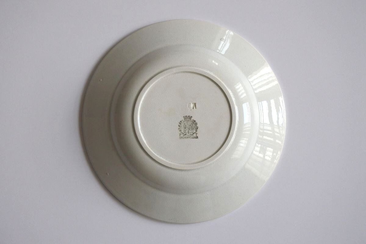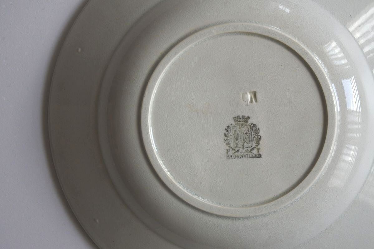 Badonviller(ヴァドンヴィレ)窯の浅リム皿。深鉢と同じ1900年代初め頃のものです。プレーンな白に細かい貫入、淡い染みも見られ味わいのある一枚。厚みのあるやわらかな質感も魅力です。特別なものではありませんが、古い時代の静物画を眺めるような楽しみがあります。