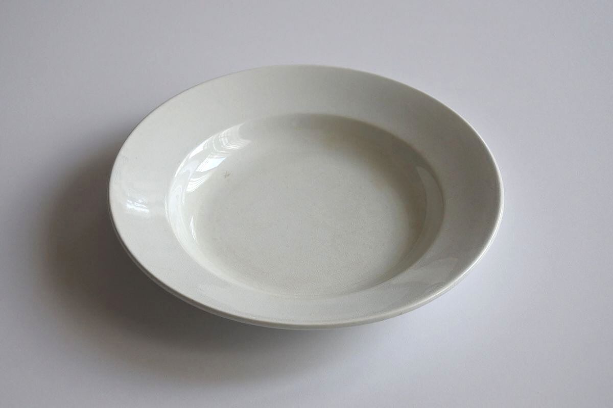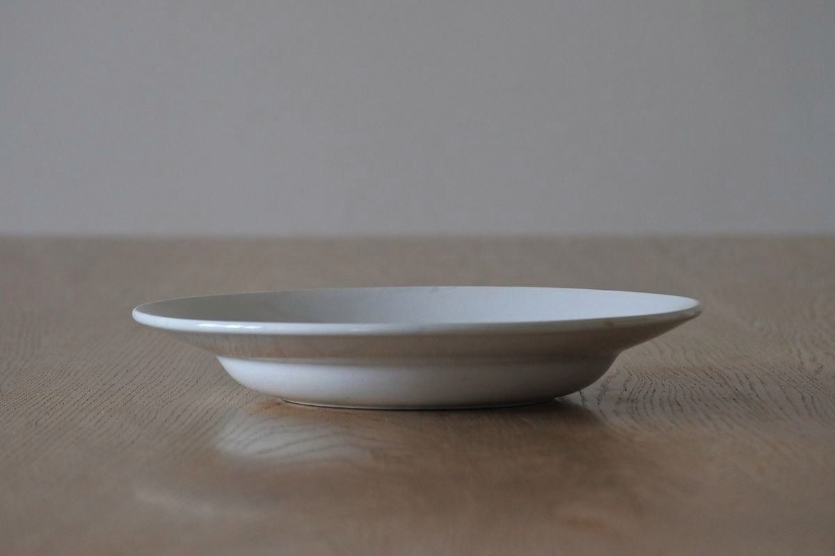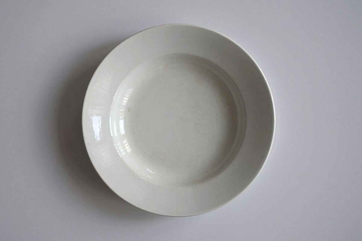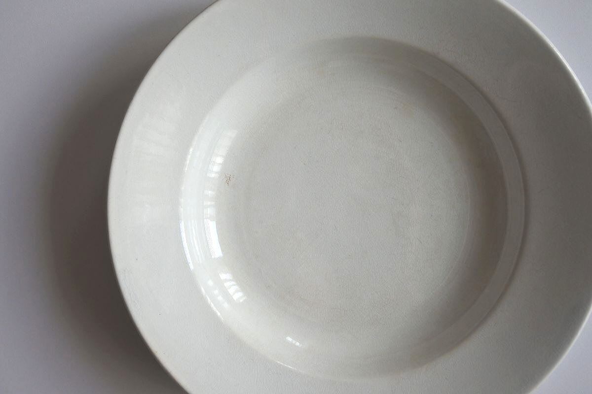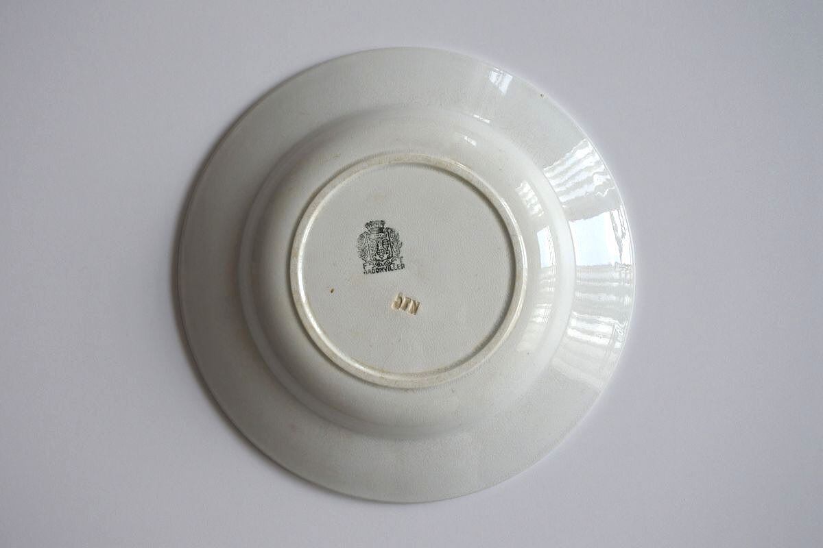 Badonviller(ヴァドンヴィレ)窯の浅リム皿。深鉢と同じ1900年代初め頃のものです。プレーンな白に細かい貫入、淡い染みも見られ、味わいのある一枚。厚みのあるやわらかな質感も魅力です。特別なものではありませんが、古い時代の静物画を眺めるような楽しみがあります。
