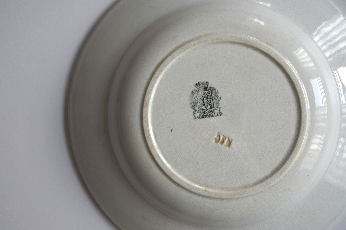 大きな欠けや割れなし。Theophile Fenal Badonviller の窯印あり。全体に細かい貫入があります。所々染みあり。釉薬のムラあり。黒点、異物(窯焼き中に生じたと思われる)あり。カトラリー跡など使用感はあまり見られません。劣化があるので古いものの味わいを楽しんでくださる方におすすめします。