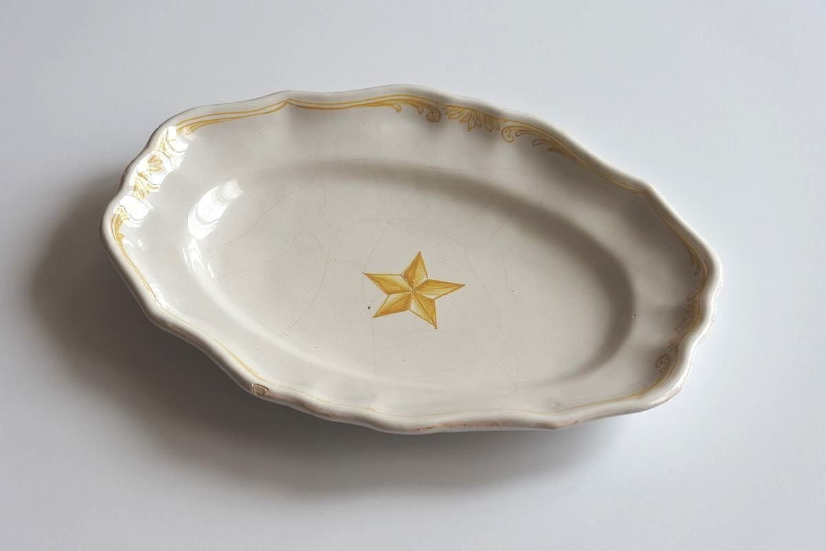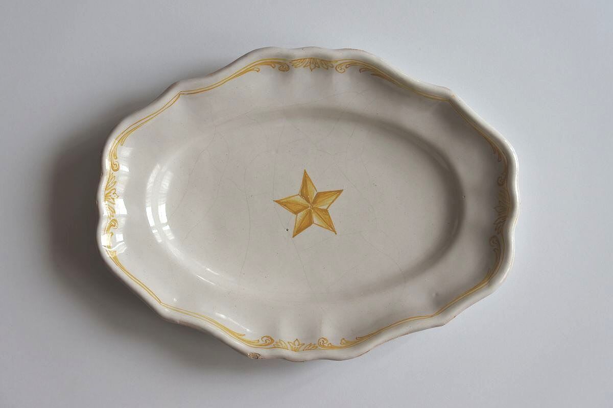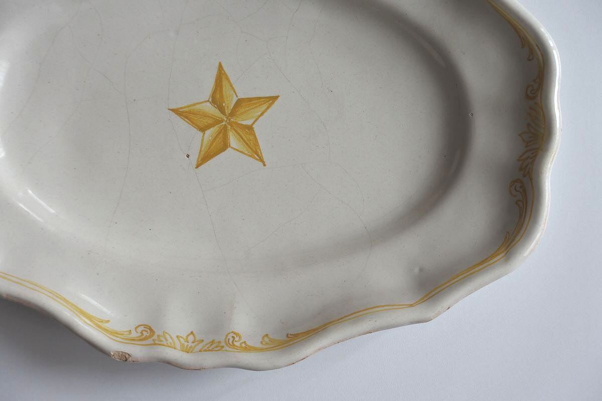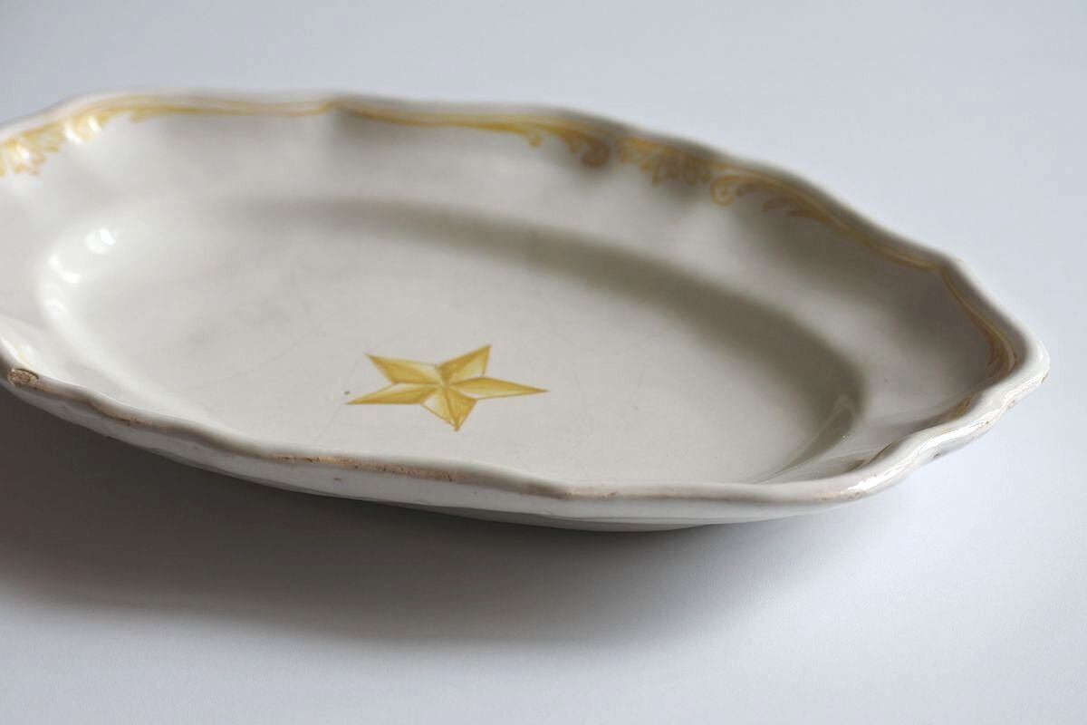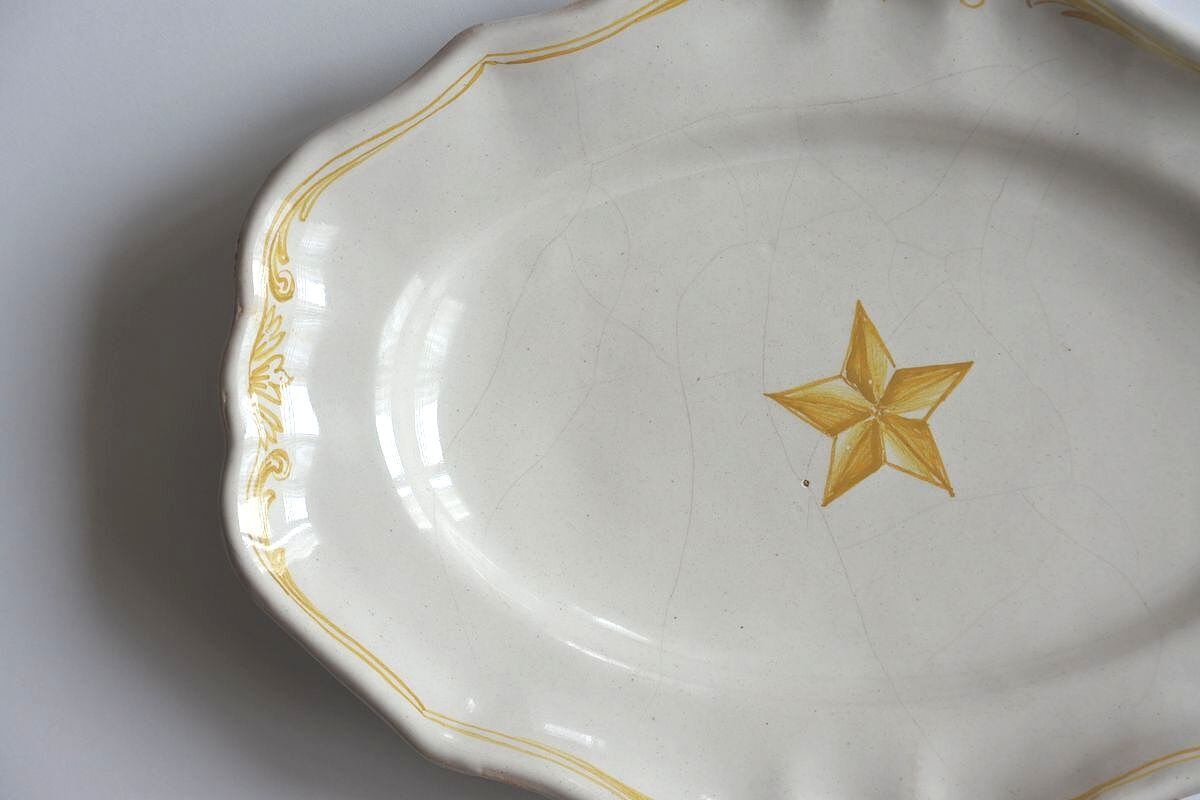 星型の絵付けが目をひく、小さいサイズの花リムオーバル。窯印はありませんが、ムスティエ、バラージュなどプロヴァンス地方で焼かれたファイアンス皿です。厚みのある白釉がボリュームを感じさせながら、素地に馴染み落ち着いた肌合い。大きく走った貫入のラインや、明る過ぎない黄色の色合いも雰囲気があります。現代的なデザインと古い時代の陶器の質感の組み合わせが魅力的。ディスプレイしても映えますし、菓子やフルーツの盛り皿として使われても楽しめそうです。