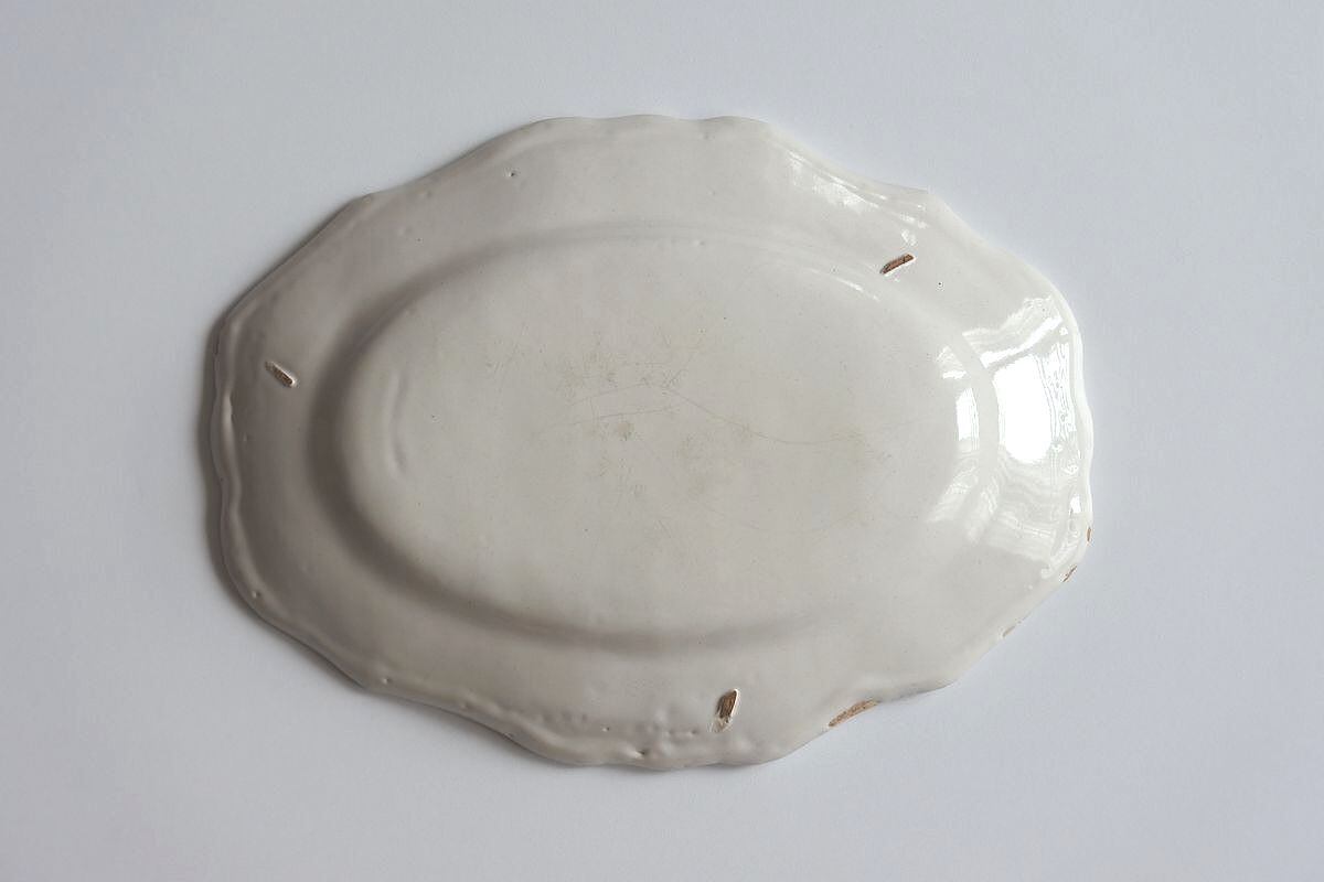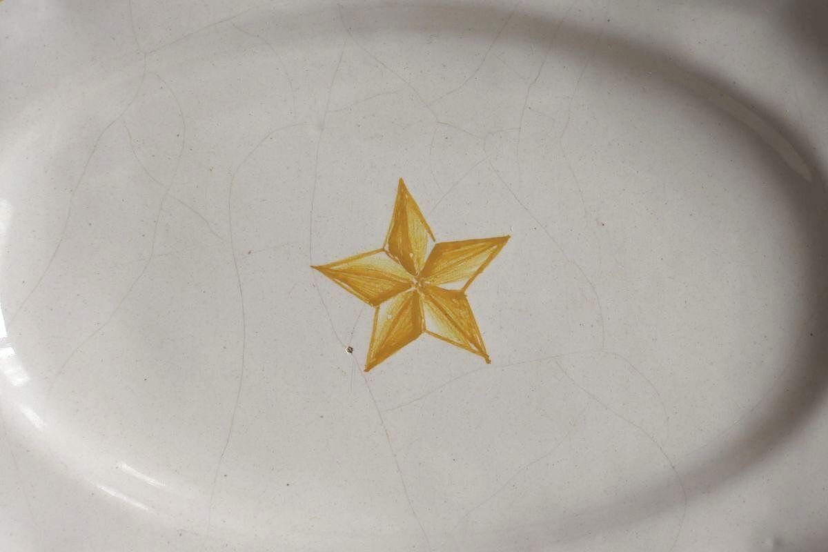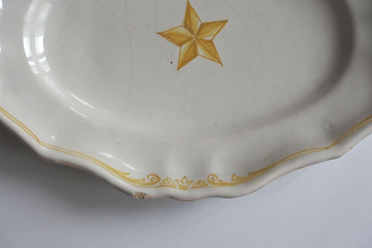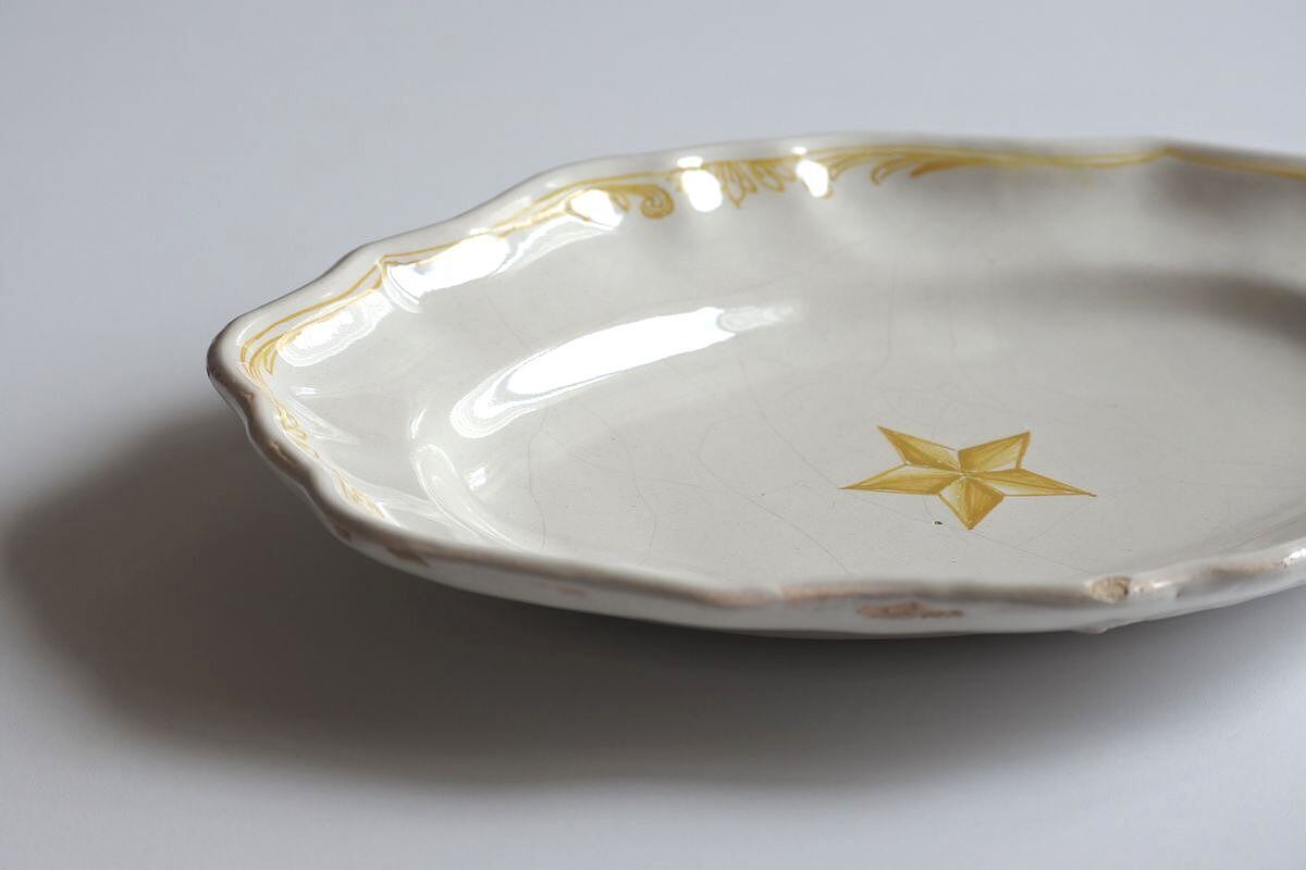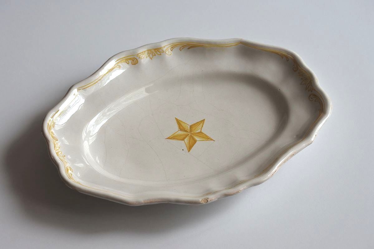 星型の絵付けが目をひく、小さいサイズの花リムオーバル。窯印はありませんが、ムスティエ、バラージュなどプロヴァンス地方で焼かれたファイアンス皿です。厚みのある白釉がボリュームを感じさせながら、素地に馴染み落ち着いた肌合い。大きく走った貫入のラインや、明る過ぎない黄色の色合いも雰囲気があります。現代的なデザインと古い時代の陶器の質感の組み合わせが魅力的。ディスプレイしても映えますし、菓子やフルーツの盛り皿として使われても楽しめそうです。