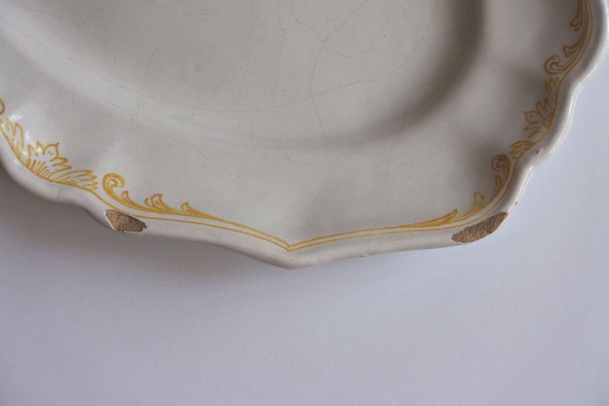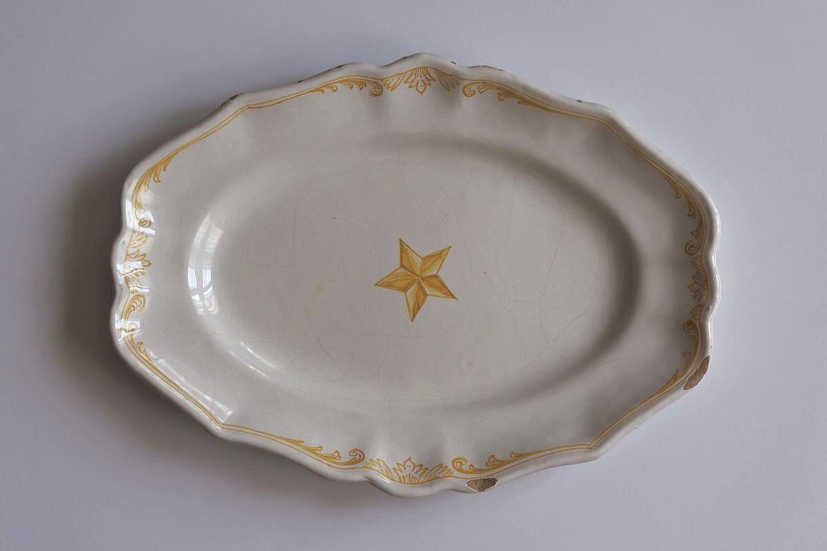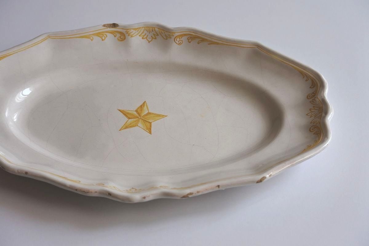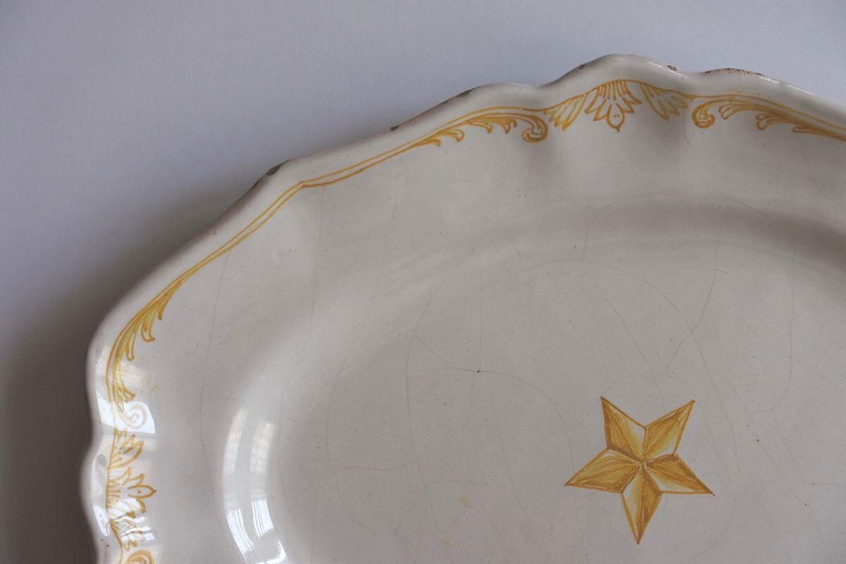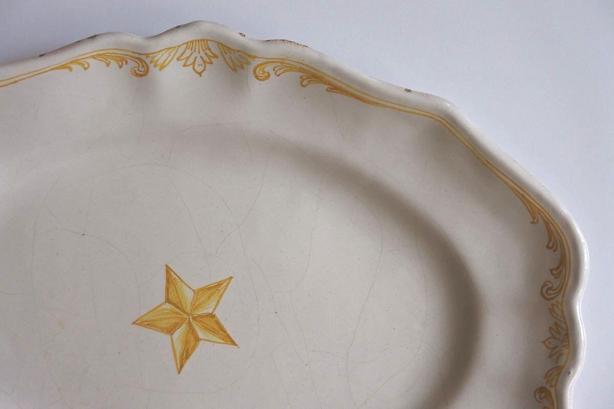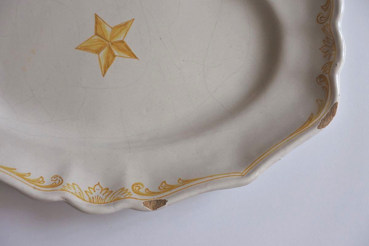 星型の絵付けが目をひく、花リムオーバル。窯印はありませんが、ムスティエ、バラージュなどプロヴァンス地方で焼かれたファイアンス皿です。厚みのある白釉が素地に馴染み、ボリュームを感じさせながらしっとり落ち着いた肌合い。大きく走った貫入のラインや、明る過ぎない黄色のニュアンスも雰囲気があります。現代的なデザインと古い時代の陶器の質感の組み合わせが魅力的。欠けがあるので、枯れた味わいや風合いを楽しんでくださる方におすすめします。