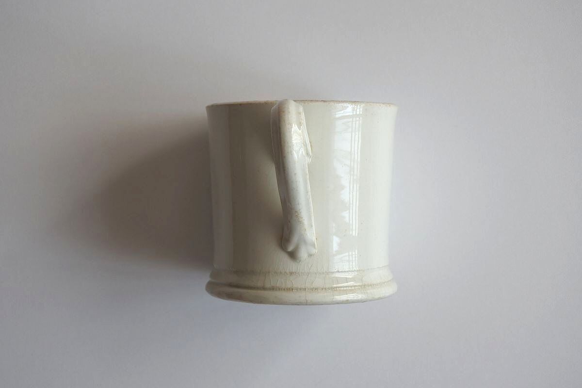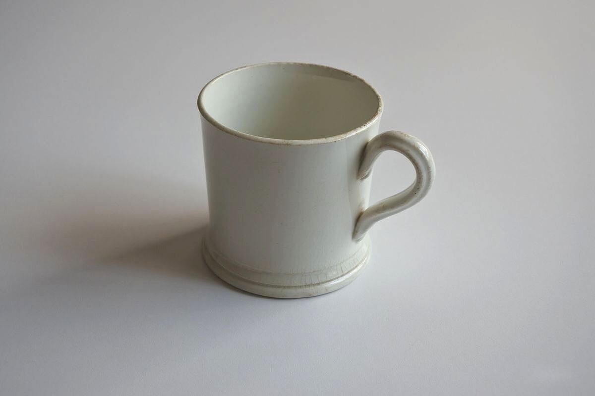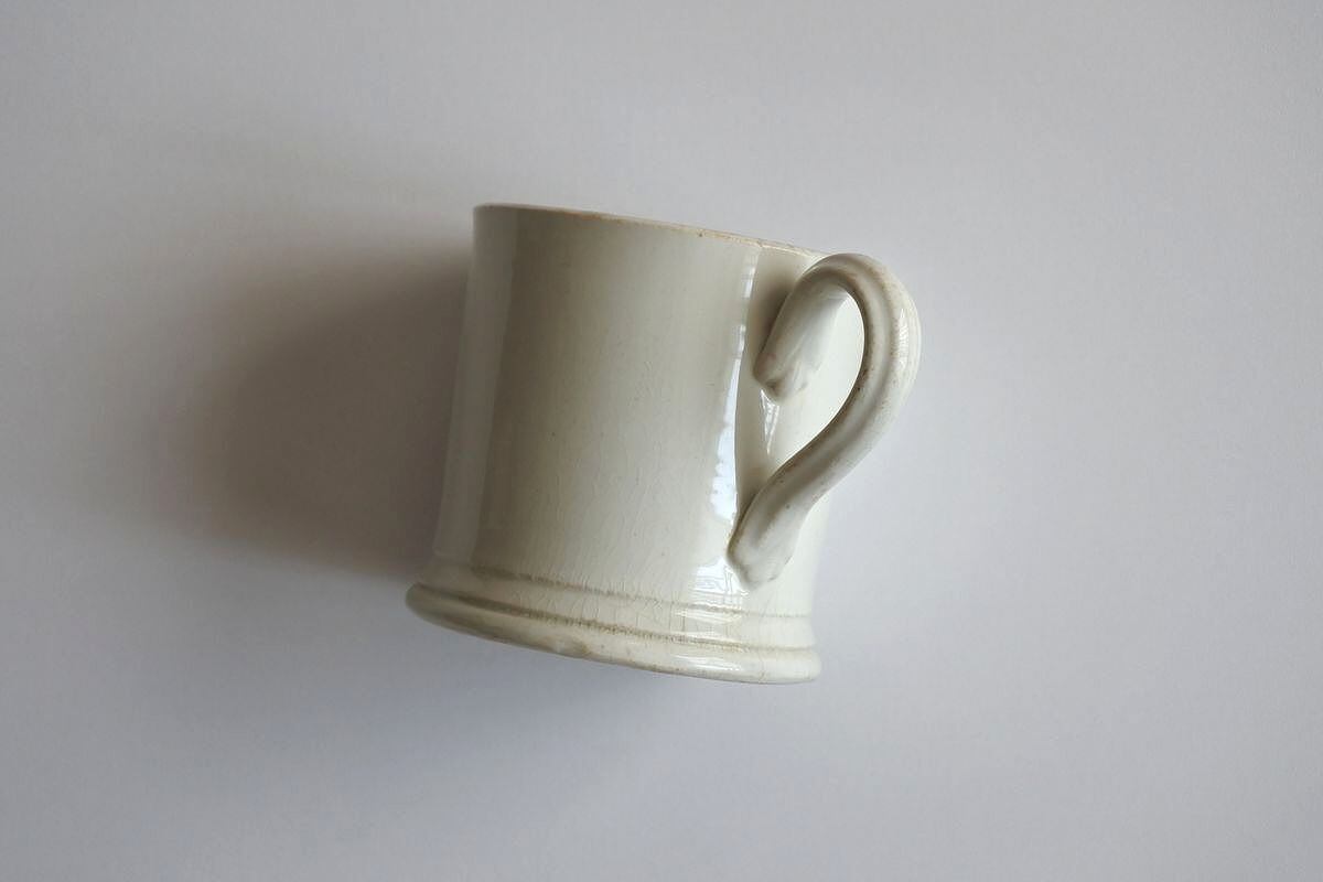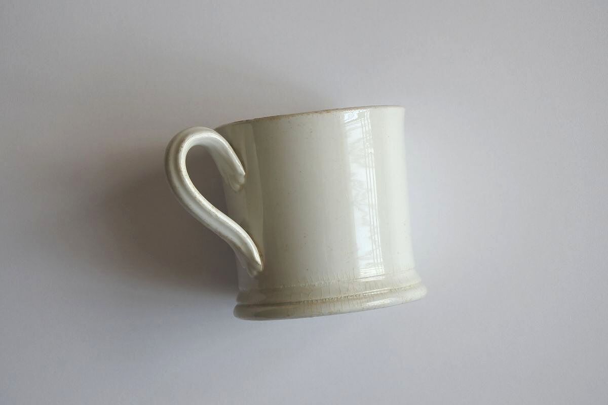 シンプルなデザインのマグ。18世紀の終わり頃から19世紀半ばにかけ、人気を呼んだパールウェアです。釉薬の改良を重ねることで、それまで主流だったクリームウェアのやわらかな乳白色を、より白に近づけることに成功しました。古い時代の陶器の質感、上品な艶、それぞれ異なるフォルムの歪みも魅力的です。シェービング用のしっかりしたサイズ。イギリスらしいマスキュリンさが漂います。