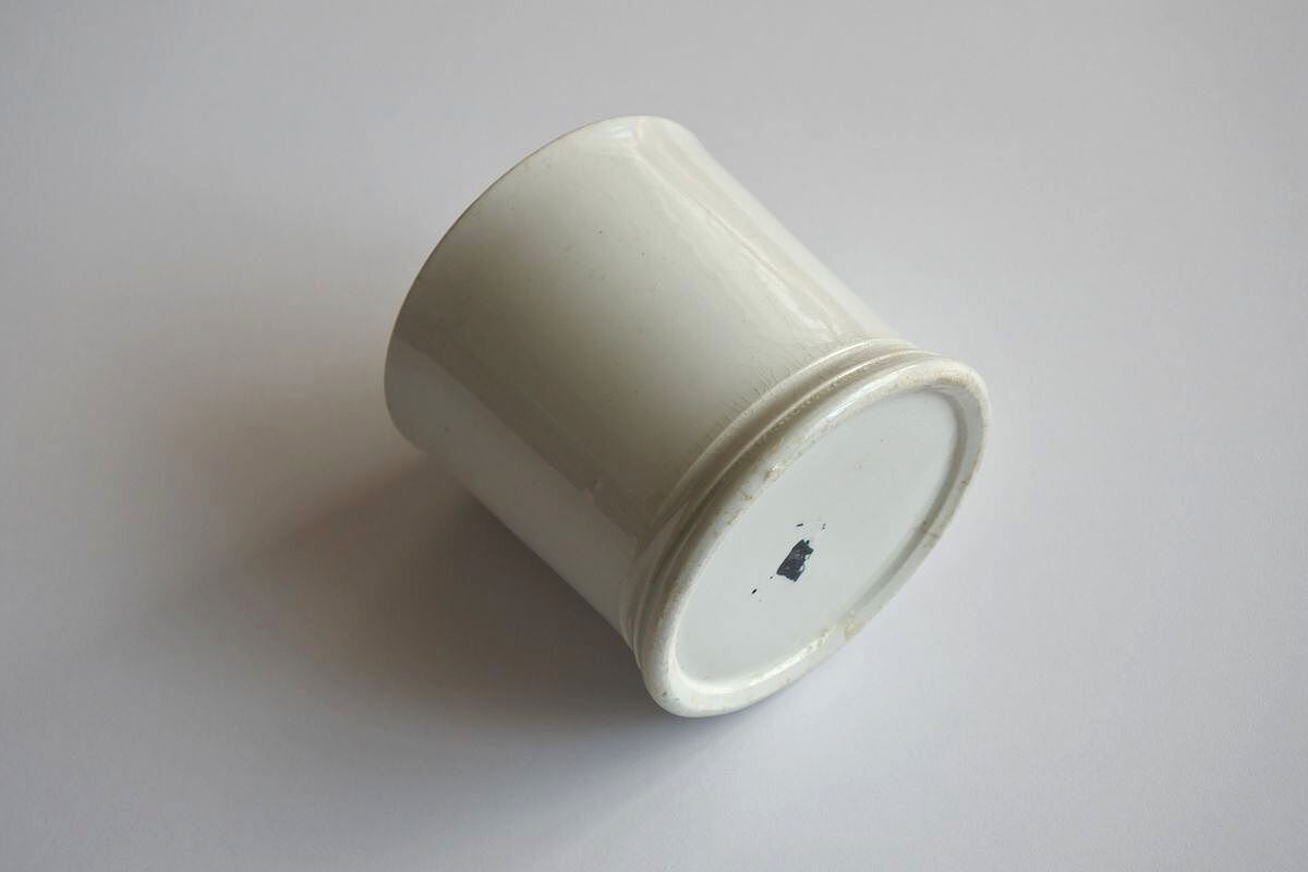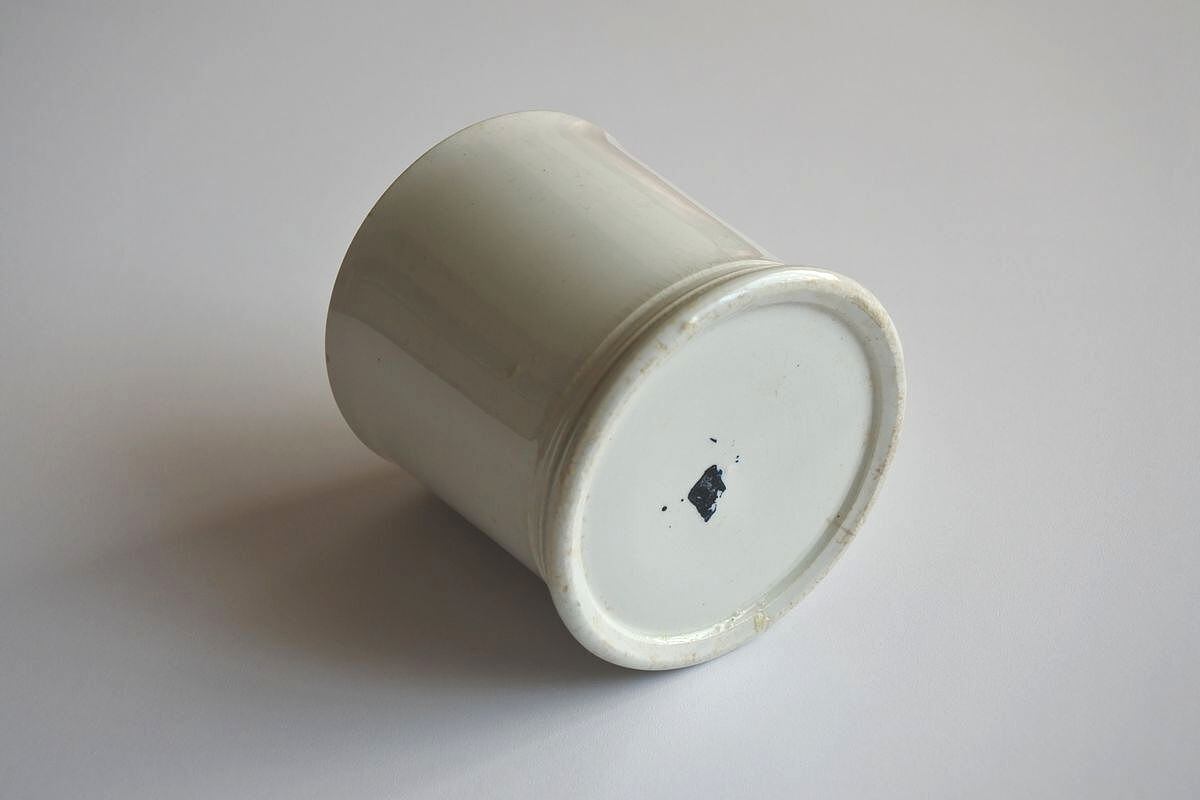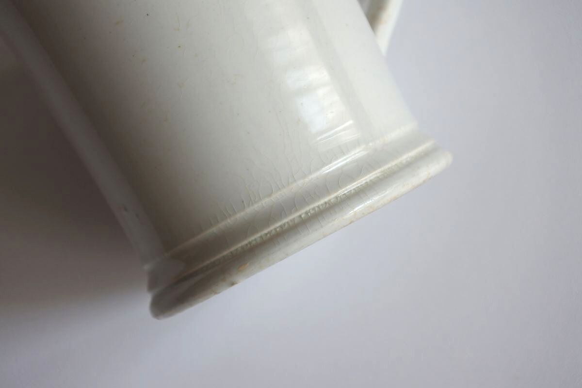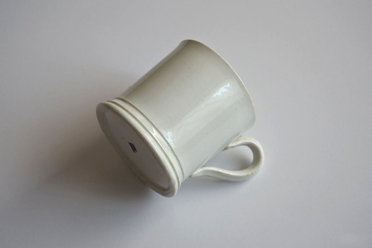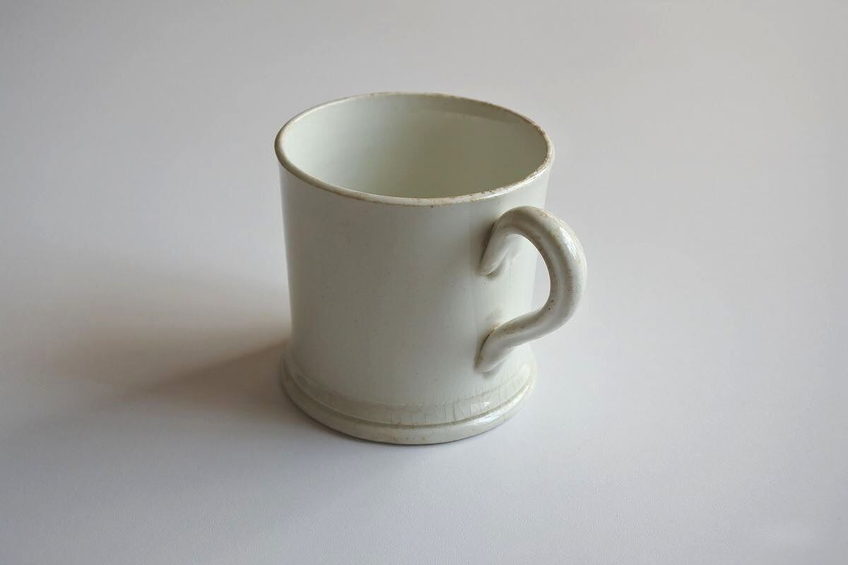 シンプルなデザインのマグ。18世紀の終わり頃から19世紀半ばにかけ、人気を呼んだパールウェアです。釉薬の改良を重ねることで、それまで主流だったクリームウェアのやわらかな乳白色を、より白に近づけることに成功しました。古い時代の陶器の質感、上品な艶、それぞれ異なるフォルムの歪みも魅力的です。シェービング用のしっかりしたサイズ。イギリスらしいマスキュリンさが漂います。