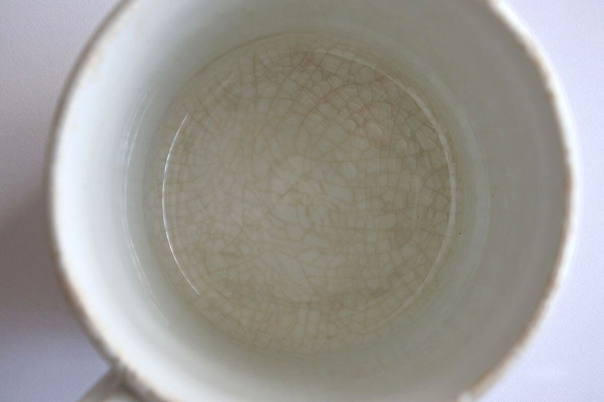 大きな割れや欠けなし。見込みに貫入あり(写真8)。リムに釉薬の剥がれあり。ハンドルの釉薬が薄くなり胎土の色味が出ているところあり。ボディに異物(窯焼きの際生じたと思われる)あり。小さな染み、下部に貫入あり(写真7)。高台に釉薬の剥がれあり。黒い汚れあり(写真4~6)。古いものの味わいとして楽しんでいただける方におすすめします。