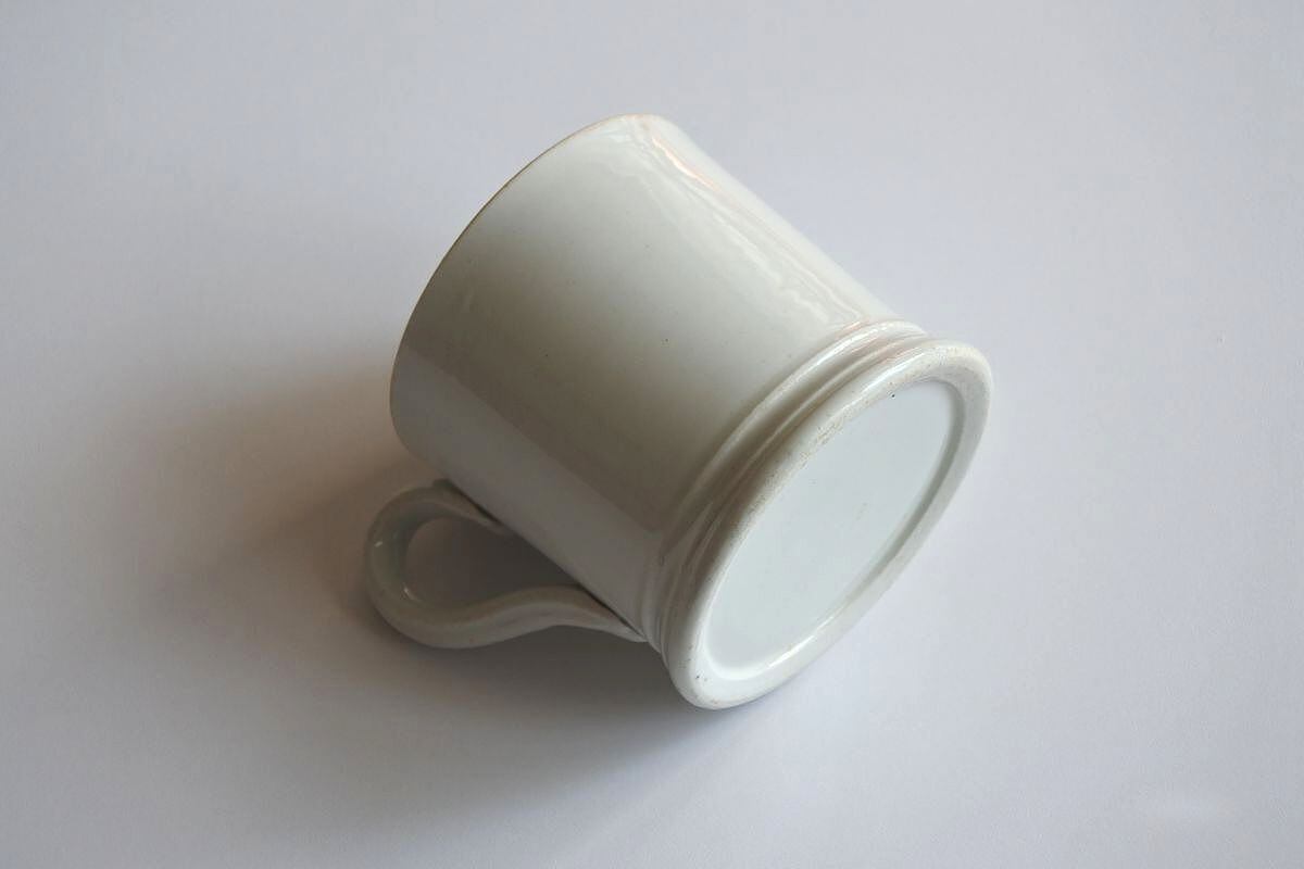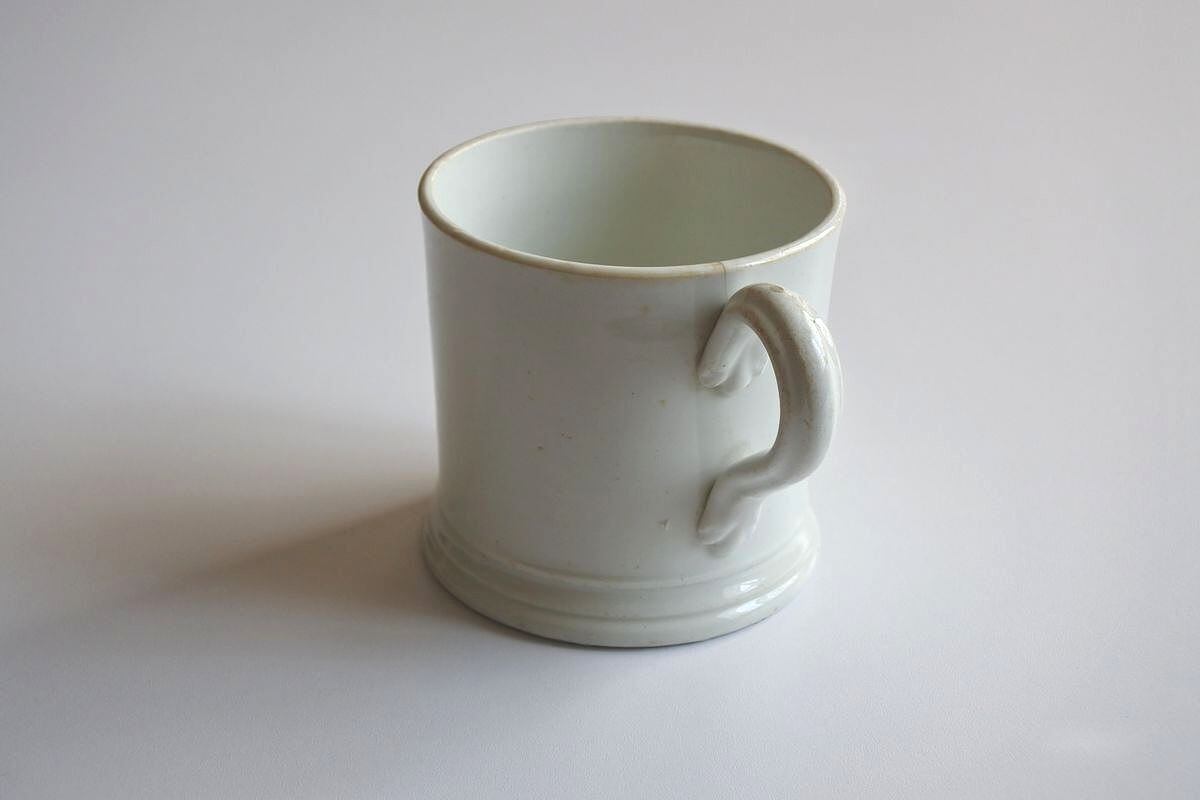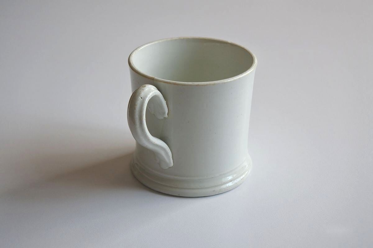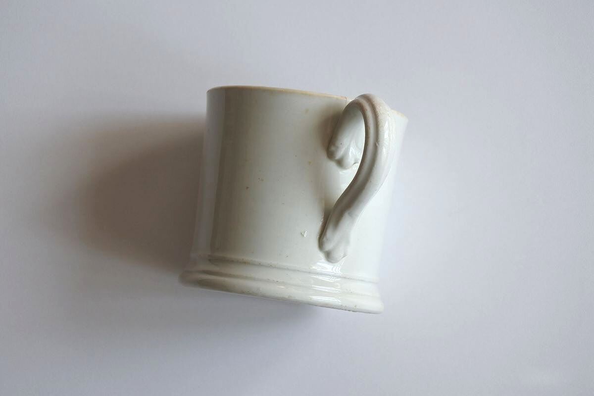 シンプルなデザインのマグ。18世紀の終わり頃から19世紀半ばにかけ、人気を呼んだパールウェアです。釉薬の改良を重ねることで、それまで主流だったクリームウェアのやわらかな乳白色を、より白に近づけることに成功しました。古い時代の陶器の質感、上品な艶、それぞれ異なるフォルムの歪みも魅力的です。シェービング用のしっかりしたサイズ。イギリスらしいマスキュリンさが漂います。