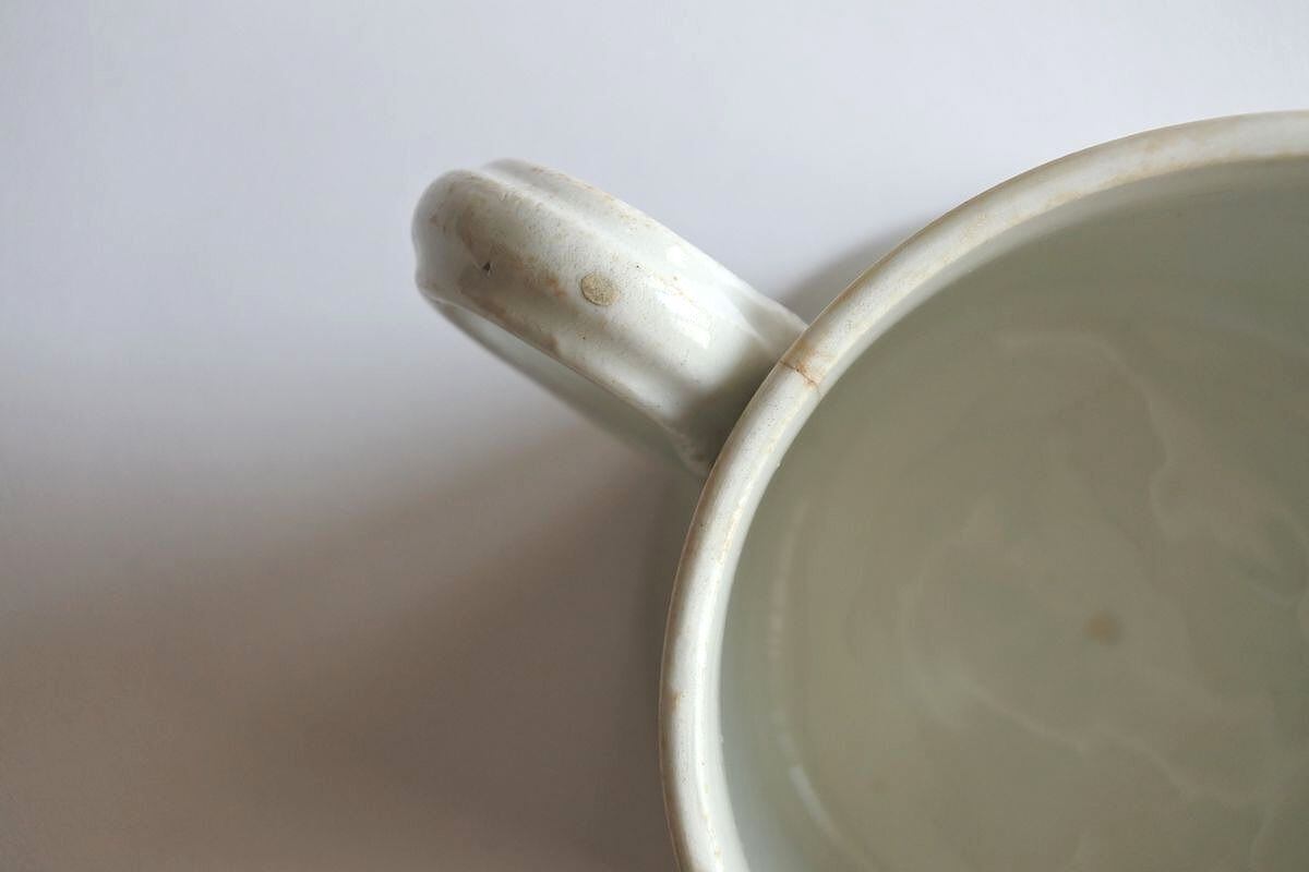 大きな割れや欠けなし。内側に異物(窯焼きの際生じたと思われる)、クラックあり(写真5)。リムに釉薬の剥がれ、染みあり(写真4)。ハンドルに釉薬の剥がれ、胎土の色味が出ているところあり。ボディに異物(窯焼きの際生じたと思われる)、小さな染みあり。高台に釉薬の剥がれあり。古いものの味わいとして楽しんでいただける方におすすめします。