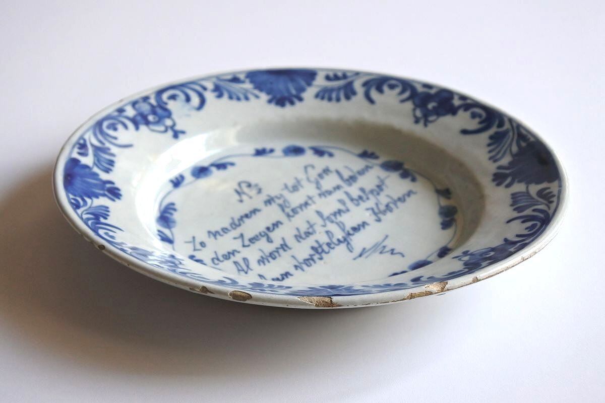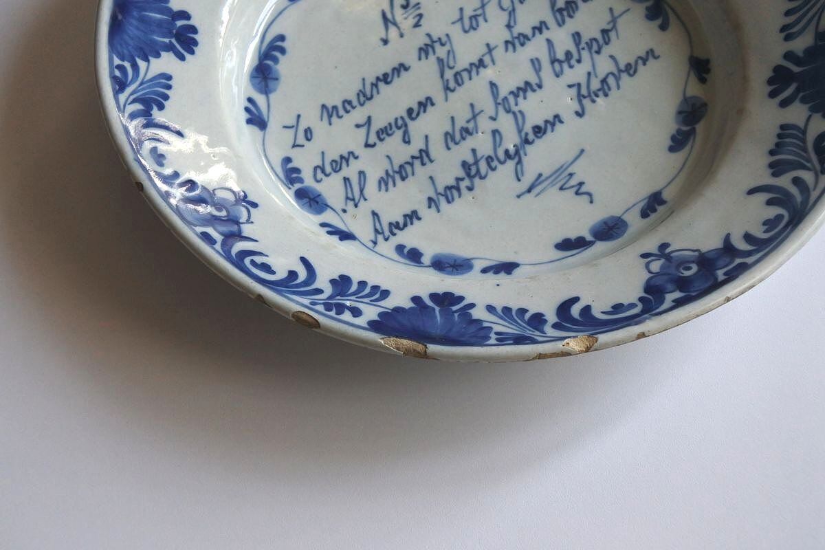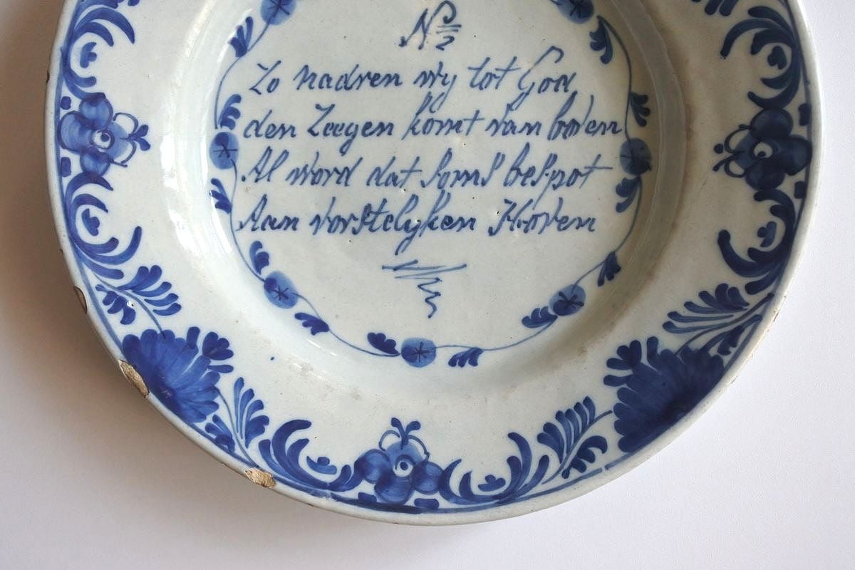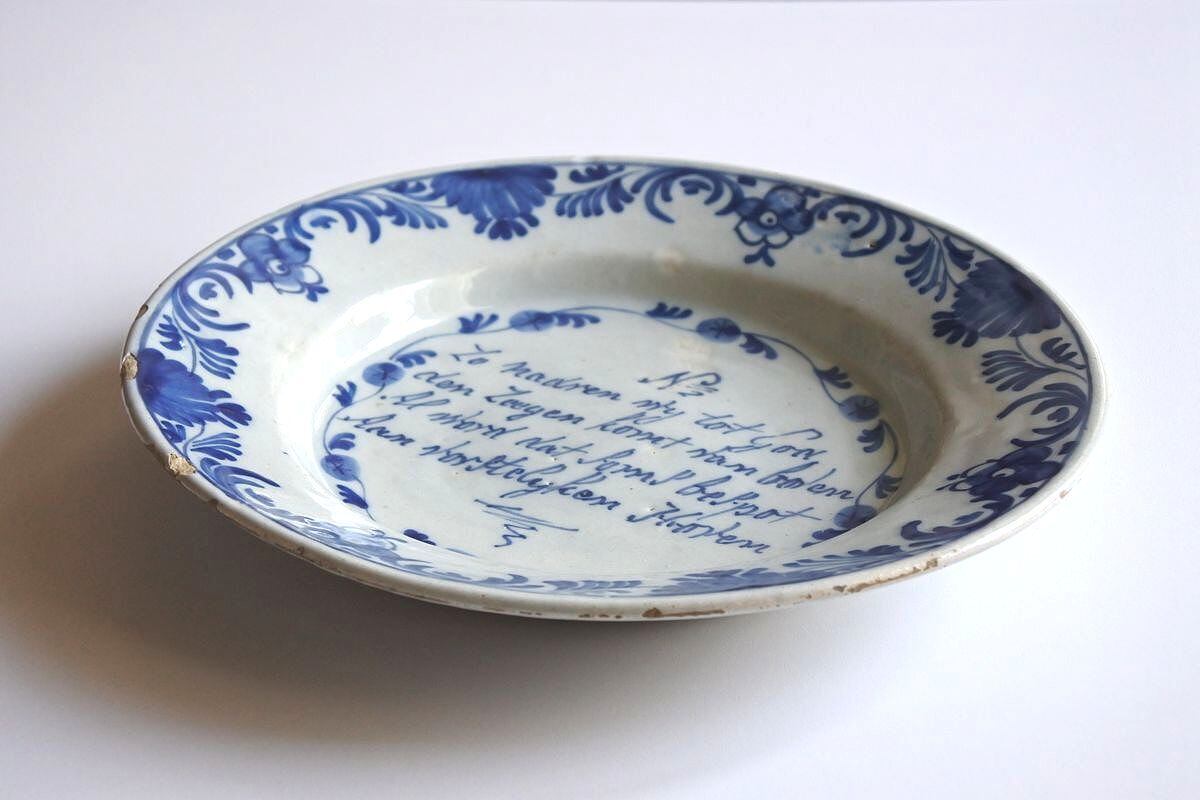 イングリッシュデルフトとは16世紀半ばから18世紀後半にかけてイギリスで焼かれていた錫釉の陶器。オランダのデルフトとほぼ同質のものですが、よりシンプルな技術で焼かれており、都会的で洗練されたオランダのデルフト陶器に比べると、素朴で牧歌的だとされています。ご紹介しているお皿は、カリグラフィックな絵付けが魅力。出典は不明ですが祈りの言葉がつづられています。装飾品としてディスプレイするのに好まれたデザインのひとつだそう。文字を取り囲むように描かれた草花のパターンが大らかなタッチで、全体的に朗らかな雰囲気。インテリアオブジェとして、イギリス風の長閑な味わいを楽しめそうです。