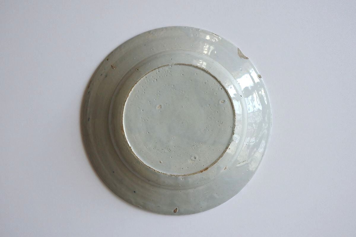 リムに欠けや釉薬の剥がれあり。釉薬が薄くなり素地が見える部分あり。擦れによる汚れあり。染付が滲んでいる箇所あり。異物や穴あき(窯焼きの際生じたと思われる)あり。裏側に欠け、釉薬の剥がれあり。目跡(器を重ねて焼いた際の跡)あり。異物や穴あき(窯焼きの際生じたと思われる)あり。色とびあり。古いものの味わいとして楽しんでいただける方におすすめします。以下は翻訳です。