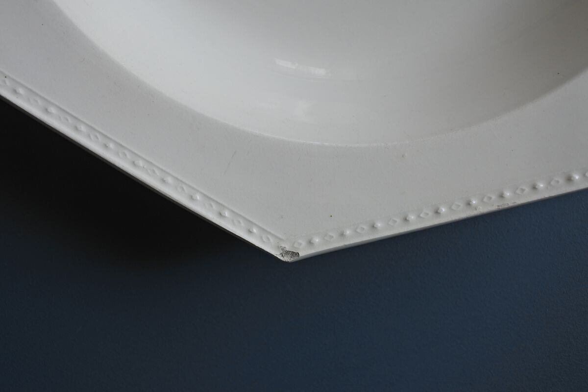 大きな割れやひびなし。CREILと思われる窯印あり。表面に釉薬の凹凸、異物(窯焼きの際に生じたと思われる)あり。リムに小さなチップ(写真6)、釉薬の剥がれあり。裏面に目跡(器を重ねて焼いた際の跡)、釉薬の凹凸、小さな傷あり。