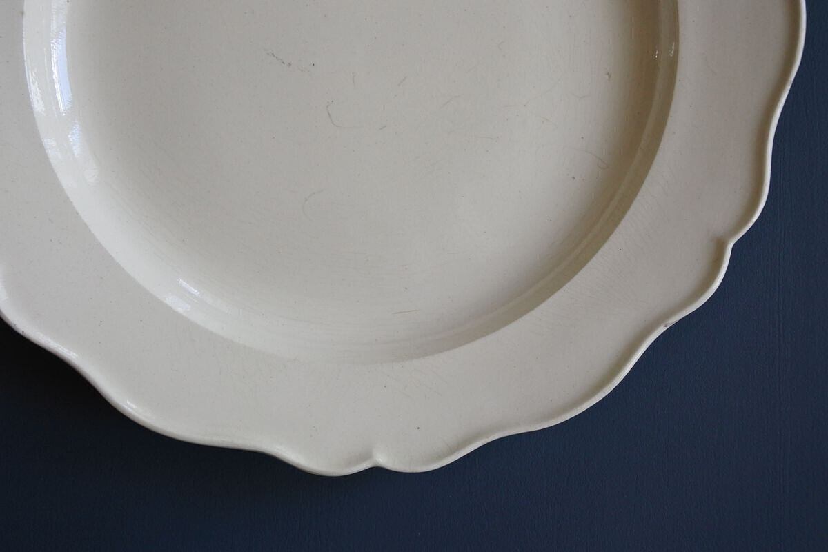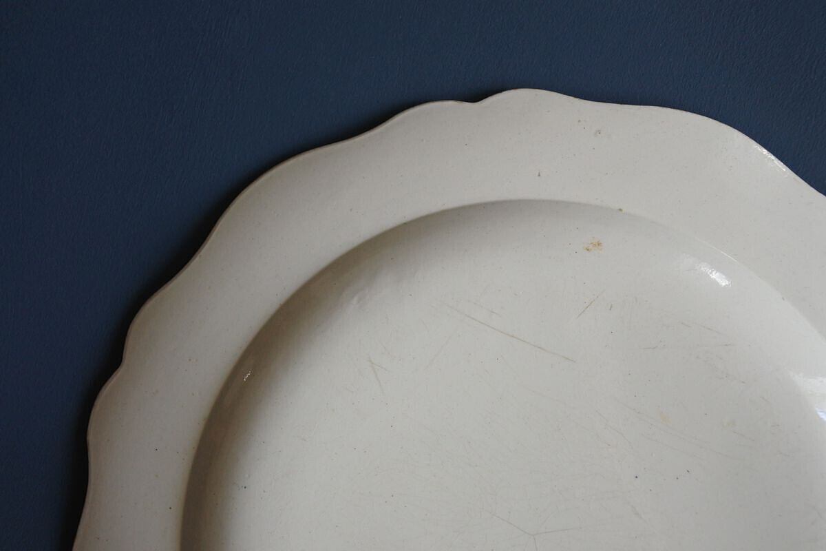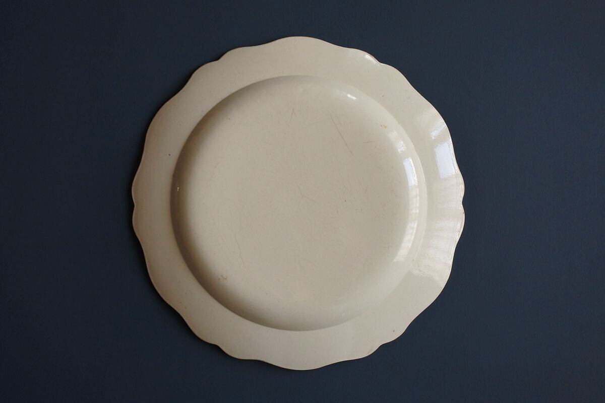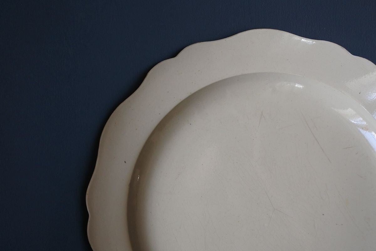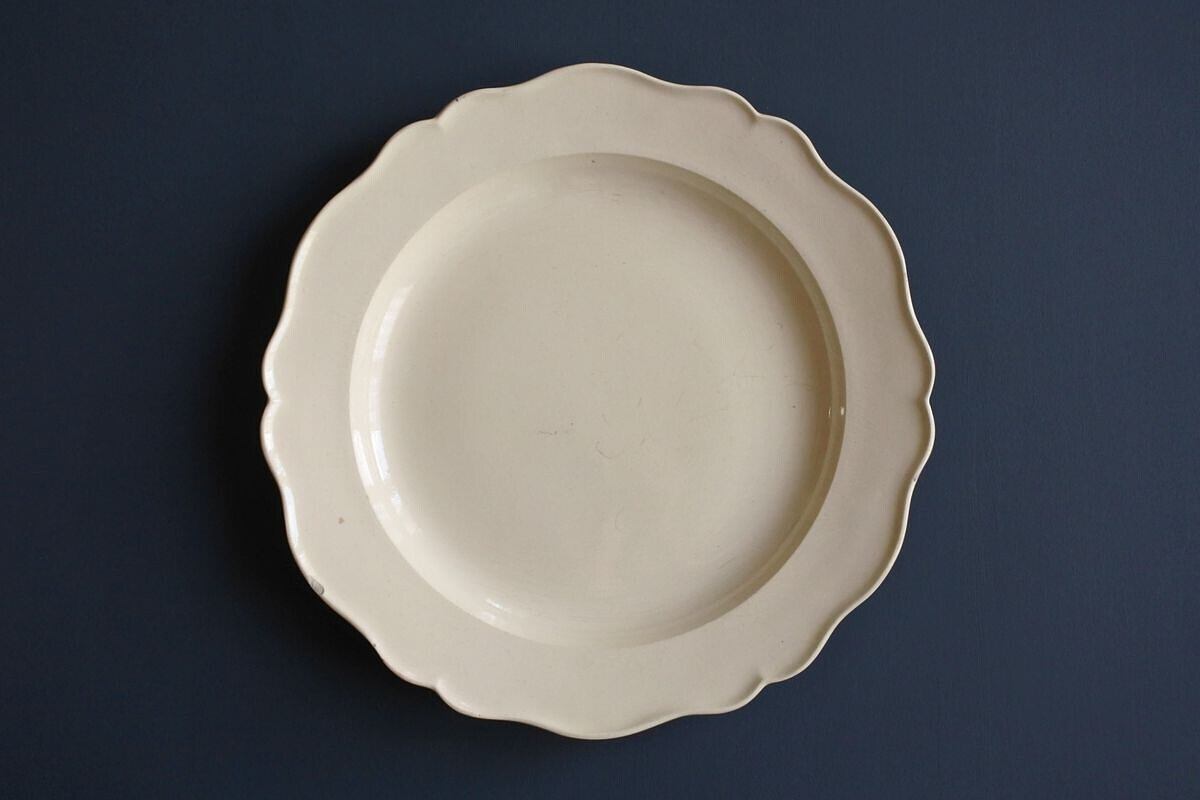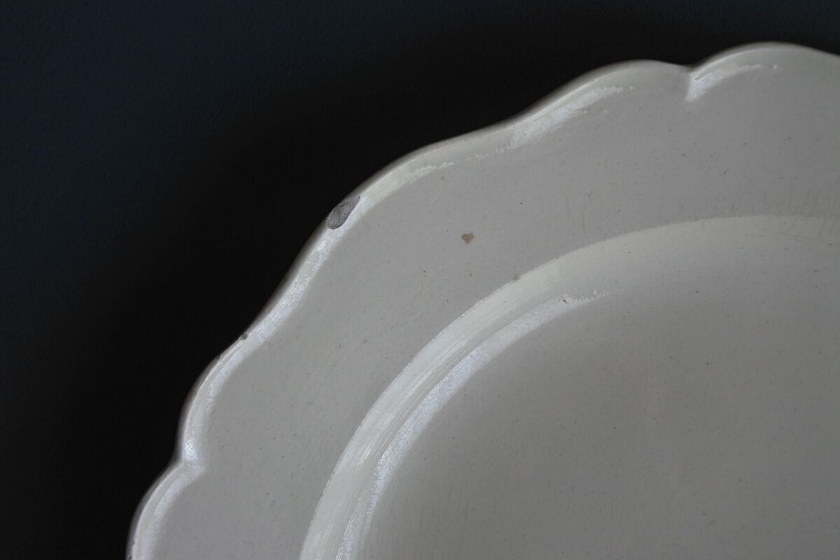 象牙色のマットな質感と艶めきが魅力的な、ファイアンスフィーヌと呼ばれる古い時代の陶器。窯印はありませんが、19世紀初め頃のものと思われます。やわらかな花リムが優しく上品な雰囲気。目につくチップが一か所あります。金継ぎなどで補修されても個性が生まれていいように思います。小さなカトラリー跡や貫入なども見られますので、古いものの味わいとして楽しんでくださる方におすすめします。