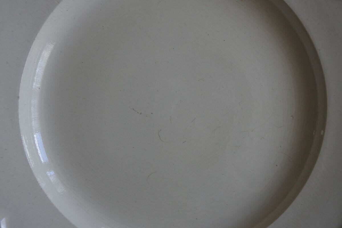 大きな割れやひびなし。表面に小さなカトラリー跡、貫入、釉薬の剥がれあり。リムにチップあり(写真6)。裏面に黒点(窯焼きの際に生じたと思われる)、傷や貫入、小さな汚れ、釉薬のムラあり。