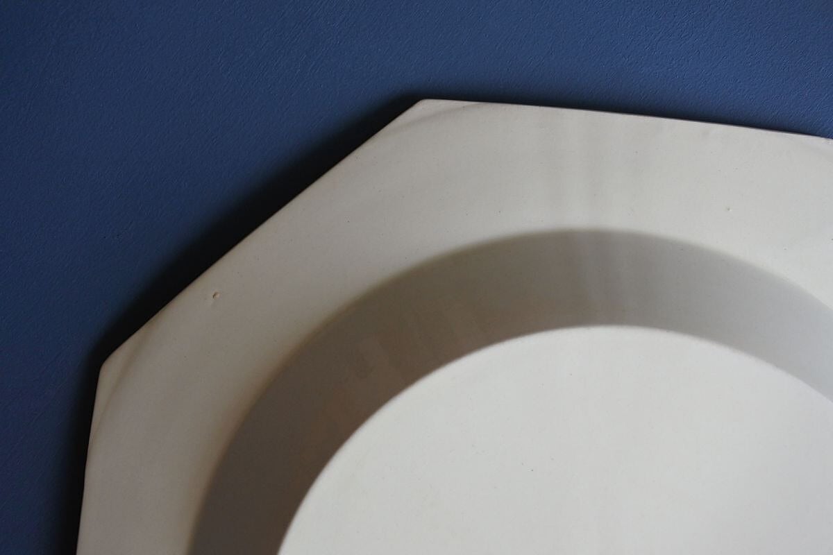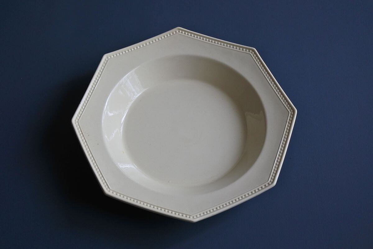 Montereau(モントロー)の刻印のある、1920年頃のオクトゴナル深皿です。19世紀のファイアンスフィーヌを思わせる、黄味がかったアイボリーのような色合い。質感は異なりますが、当時の新しい技術で古いものを模した面白さがあり、さらにまた長い時間を経て、軽やかさのなかにもクラシカルな雰囲気を漂わせています。深鉢としても使えそうな存在感のあるしっかりしたサイズ。さまざまな楽しみ方ができそうです。