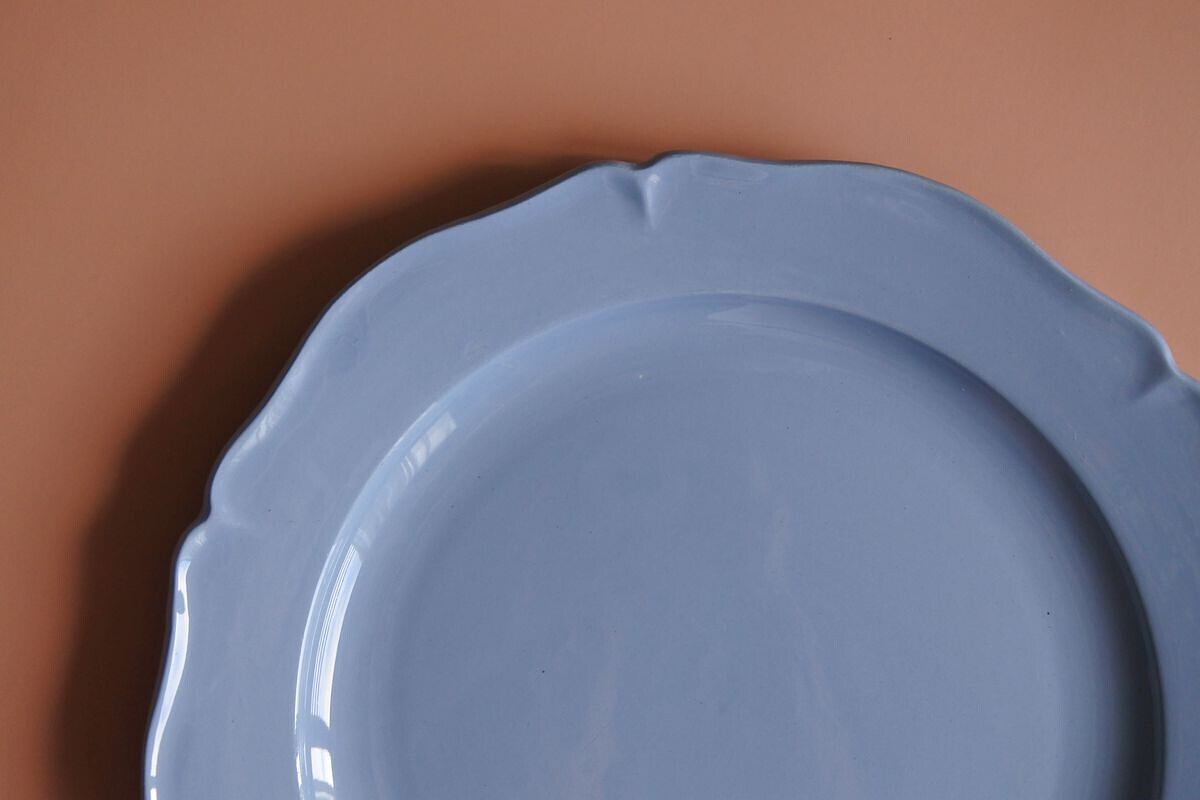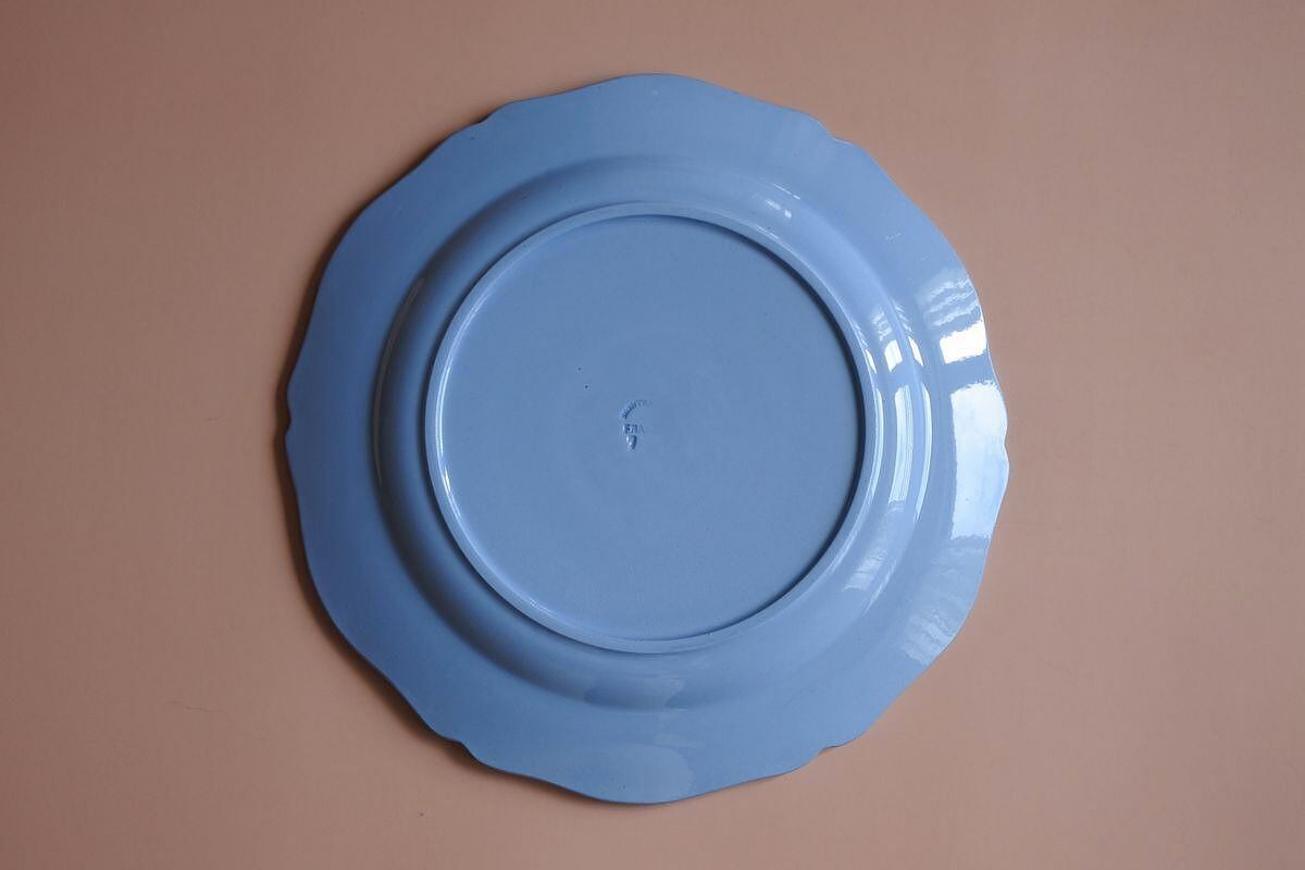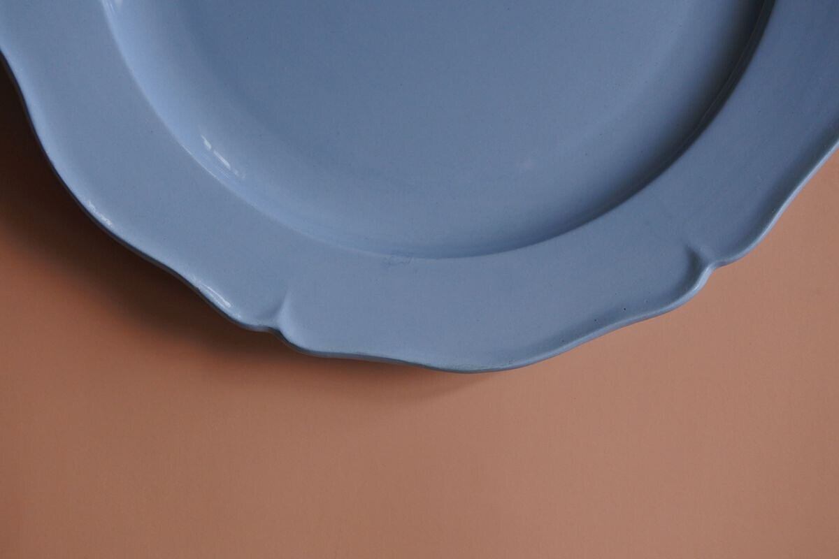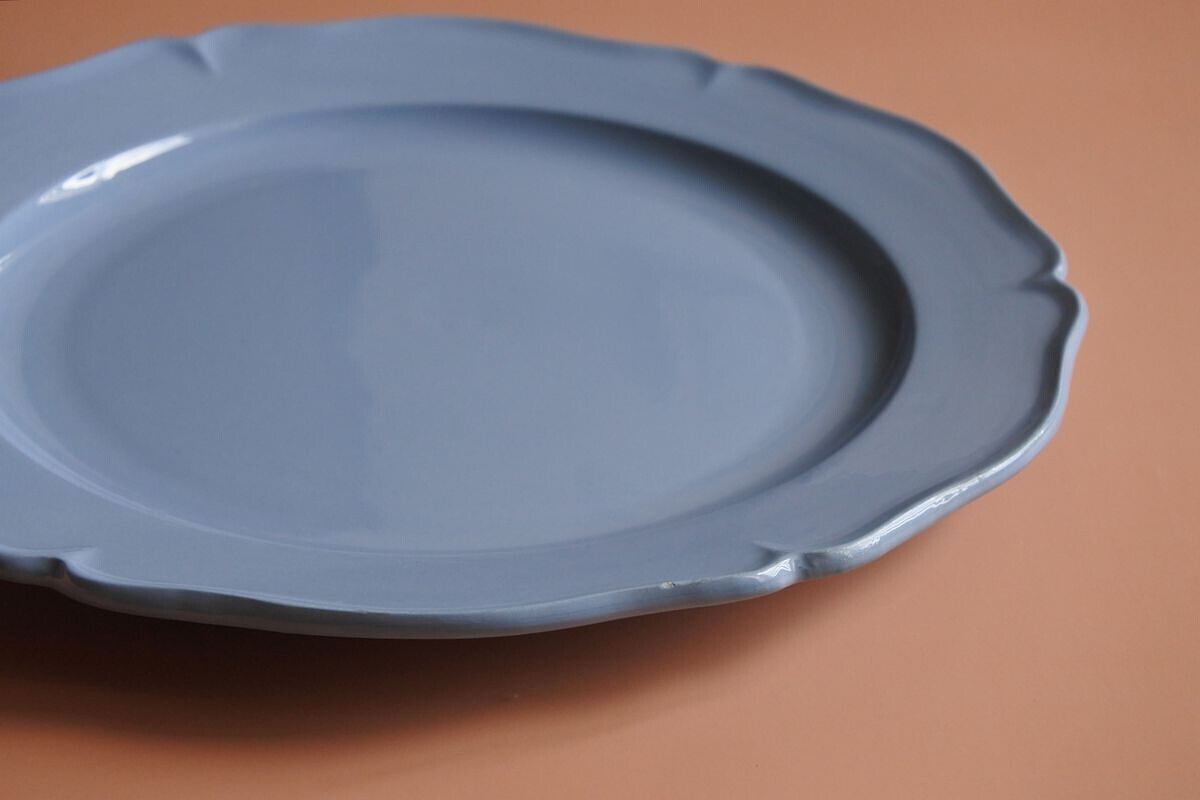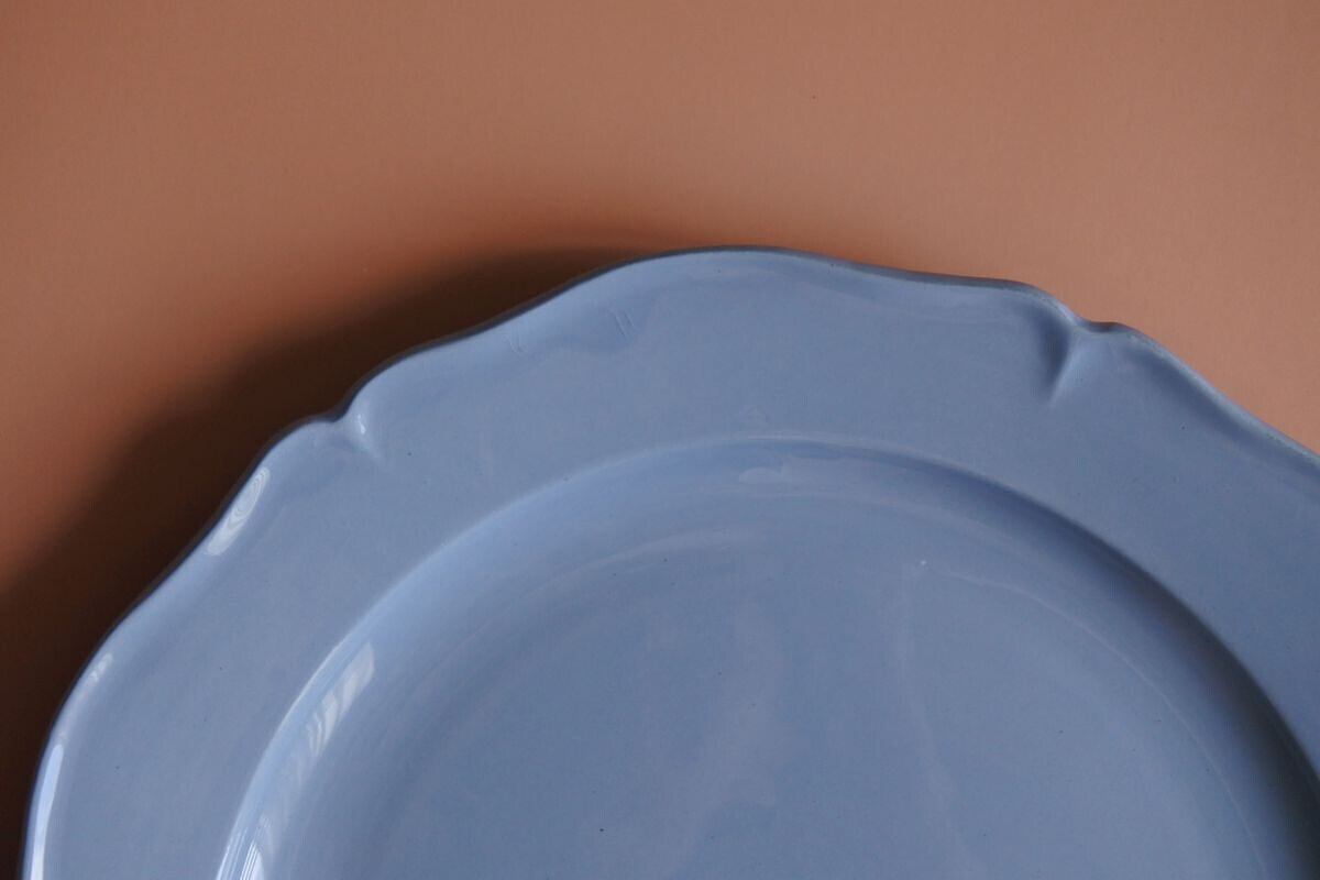 Montereau(モントロー)の刻印のある、1920年頃の花リム平皿です。フランスらしいニュアンスを感じさせるブルー。控えめな花リムが程よい甘さをプラスしています。フルーツたっぷりのホールタルトなどのせても映えそうです。19世紀の質感とは異なりますが、当時の新しい技術で古いものを模した面白さがあり、さらにまた長い時間を経て、軽やかさのなかに落ち着いた雰囲気を漂わせています。