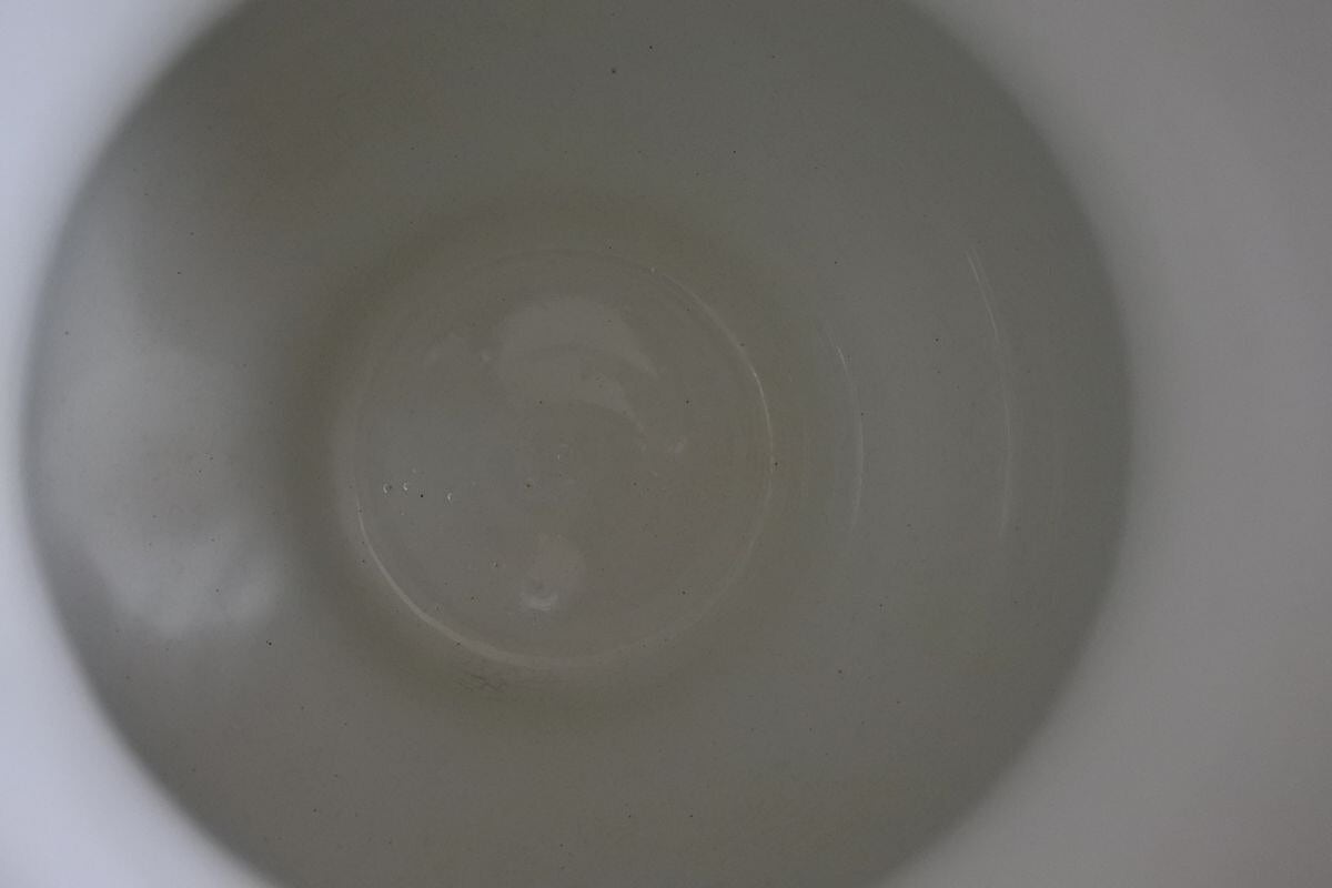 大きな割れや欠けなし。全体に細かな貫入が見られます。ボディ外側と内側に小さな黒点(窯焼きの際生じたと思われる)あり。底の高台に擦れによる汚れあり。小さな異物(窯焼きの際に生じたと思われる)あり。無傷ではありませんが比較的きれいな品です。