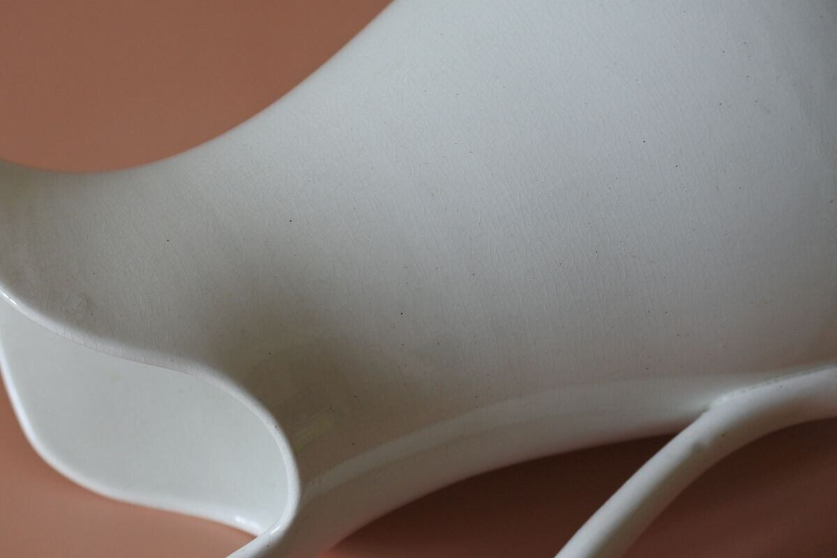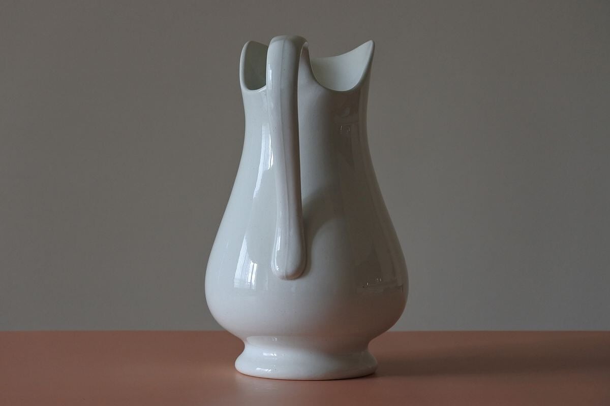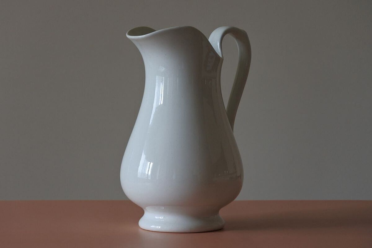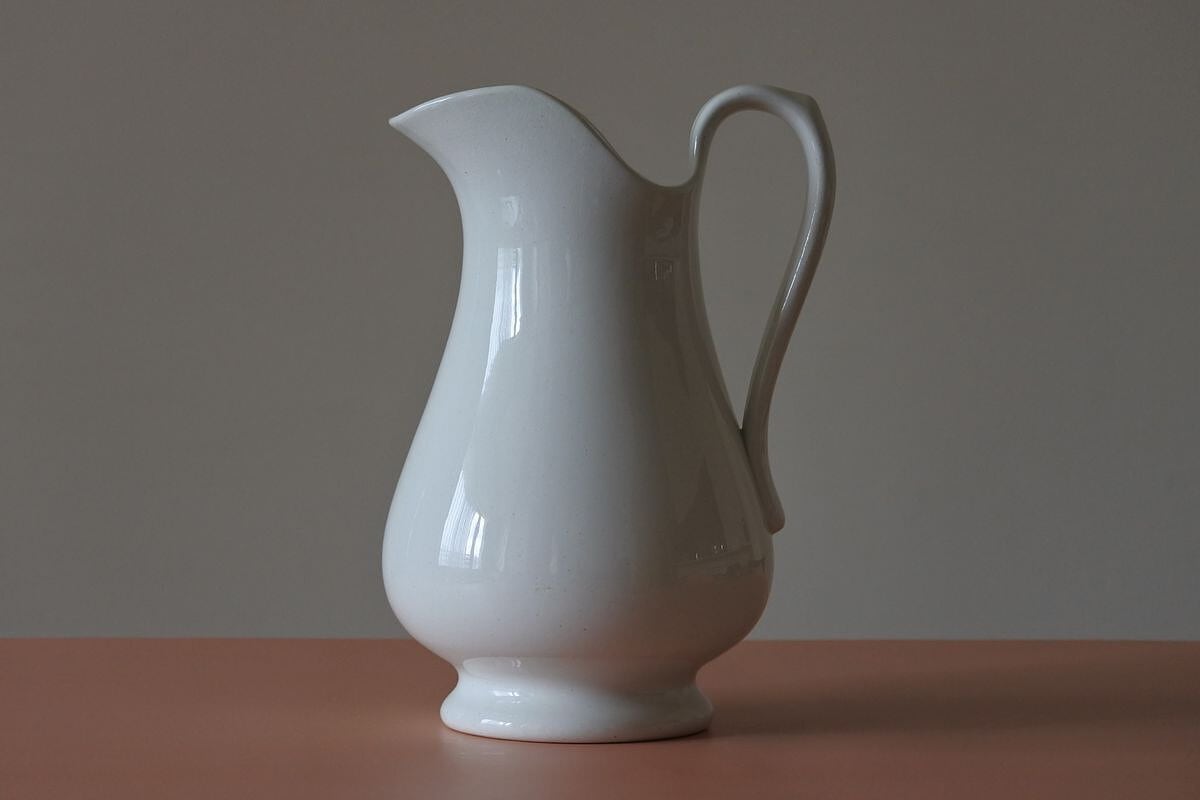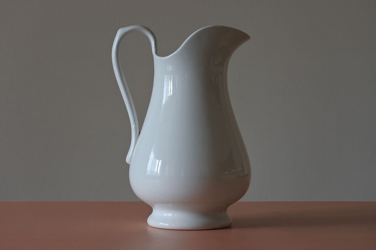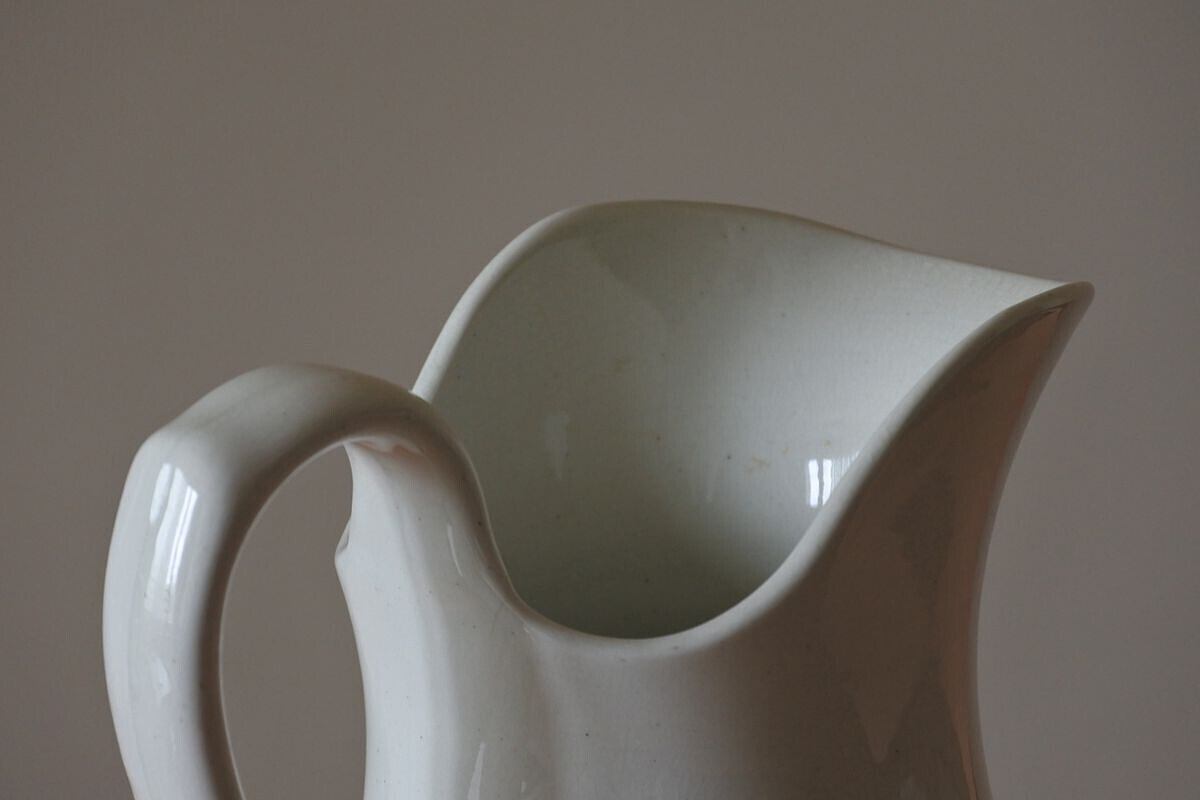シンプルでゆったりしたフォルムの水差し。高さがあり、控えめですがエレガントな雰囲気。オランダで人気の高い Maastricht (マーストリヒト窯)Petrus Ragout (ペトルス・レグー社)の窯印があります。設立は19世紀の初め。ガラス工場としてスタートし、数年後、地元向けに実用的な陶器の生産を始めますが、イギリスから専門家を招くなどして徐々に品質を高めていきました。紹介している品は、国内外に広く知られるようになった19世紀終わり頃のもの。花器として使えば、やわらかな肌合いや落ち着きのある白さが、優しく草花を引き立ててくれそうです。紫陽花やダリアなど大振りな花をひとついけても、季節の草花を賑やかにいけても絵になりそう。