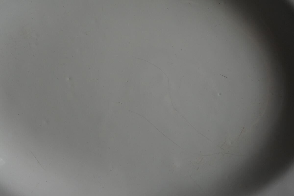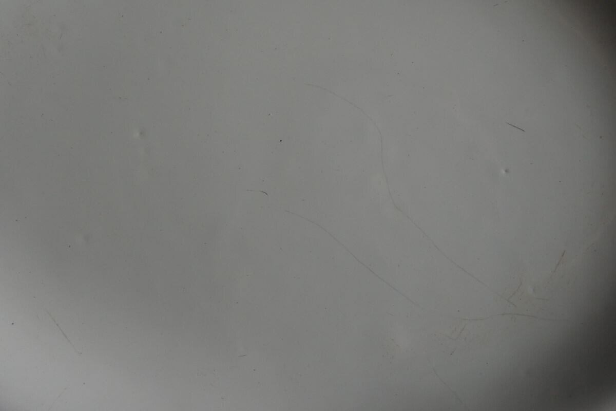 大きな割れや欠けなし。見込みにカトラリーでついたような傷跡が見られます(写真4・5・6)。全体に釉薬のムラ、異物や気泡(窯焼きの際生じたと思われる)あり。裏側に目跡(器を重ねて焼いた際の跡)(写真8・9・10)あり。高台部分に擦れによる傷、汚れあり。少しガタつきがあります。