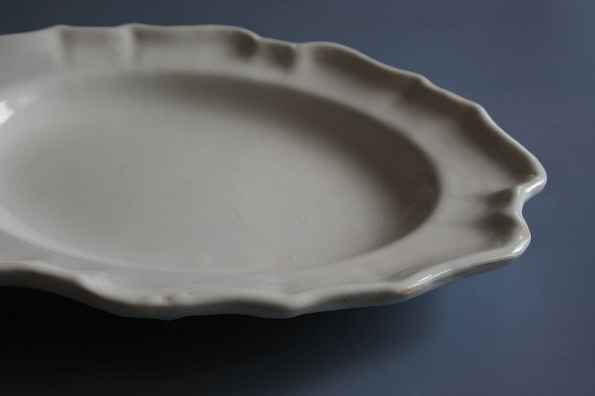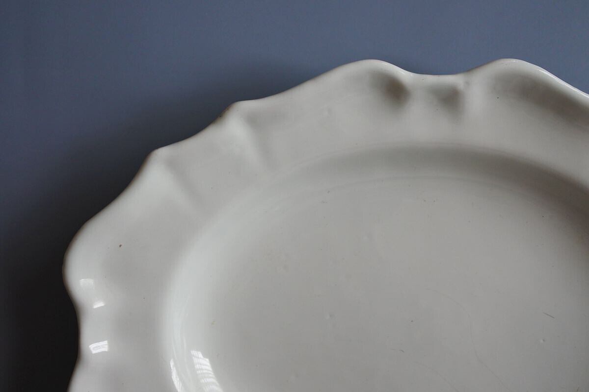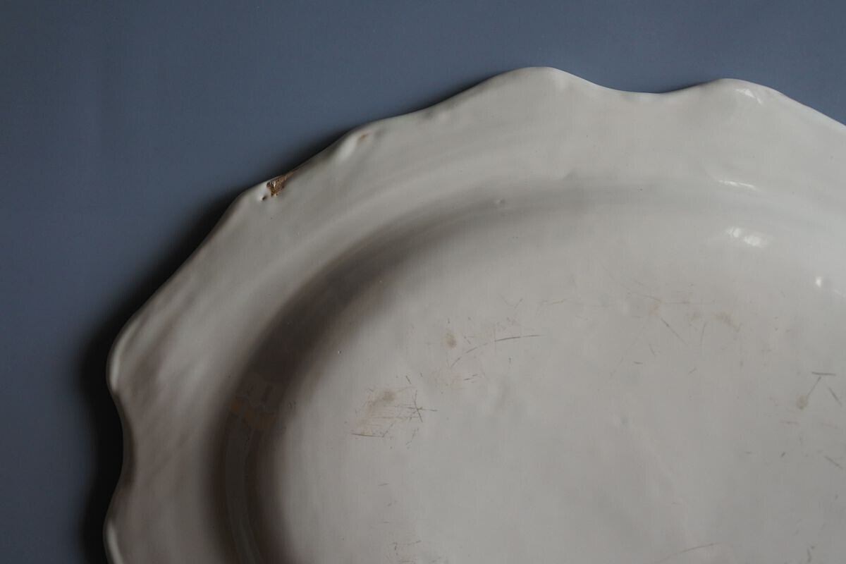 ふわりとした印象の白釉皿。しっかりした厚みがあり、光の当たり具合で薄っすらブルーがかって見えます。×印はありませんが、ムスティエ窯か、近郊で焼かれていた同質の皿だと思われます。プロヴァンス地方にあるムスティエは中世から続く小さな焼きものの村ですが、17世紀半ばイタリアの修道士によってもたらされた技術により、艶めく白い釉薬が魅力的な陶器の窯元として広く知られるようになりました。見込みにカトラリーでついたような跡が幾つか見られますが、欠けや割れ、釉薬の剥がれなどはありません。優雅な花リムが、テーブルに華やかさを添えてくれそうです。
