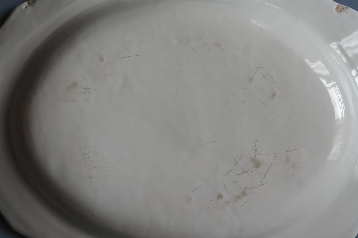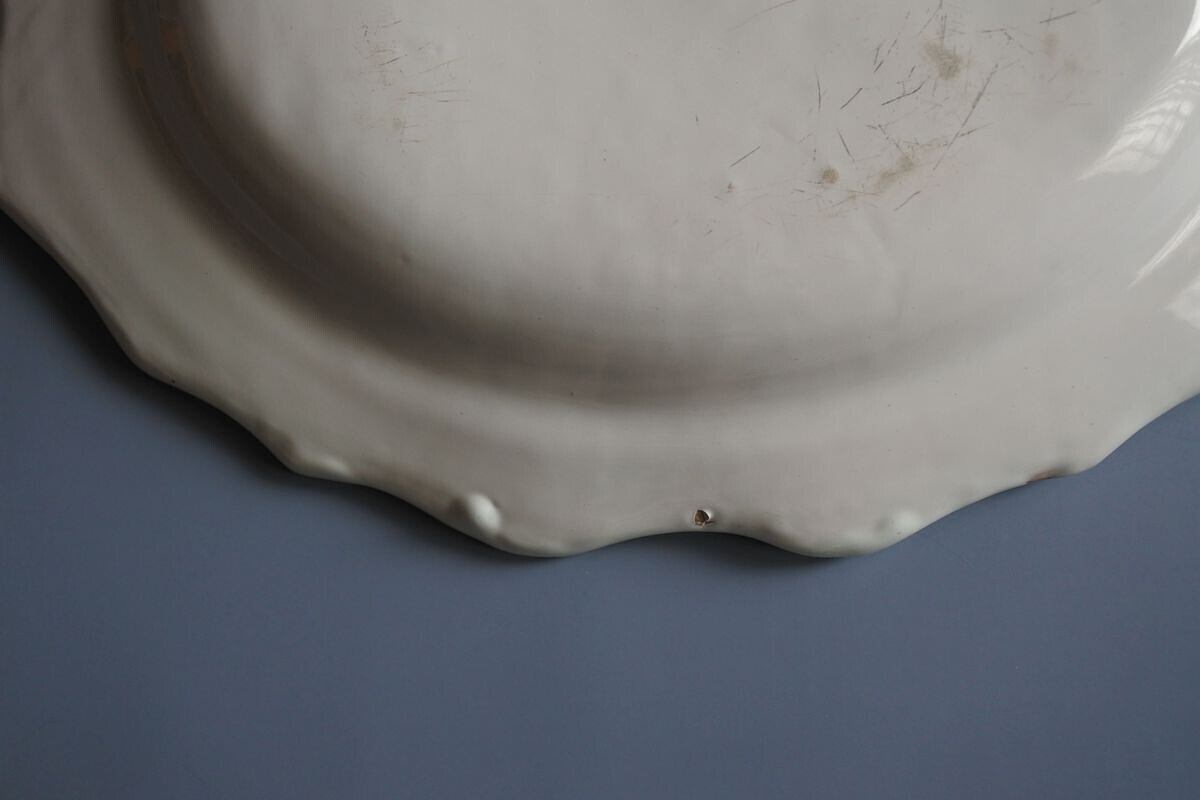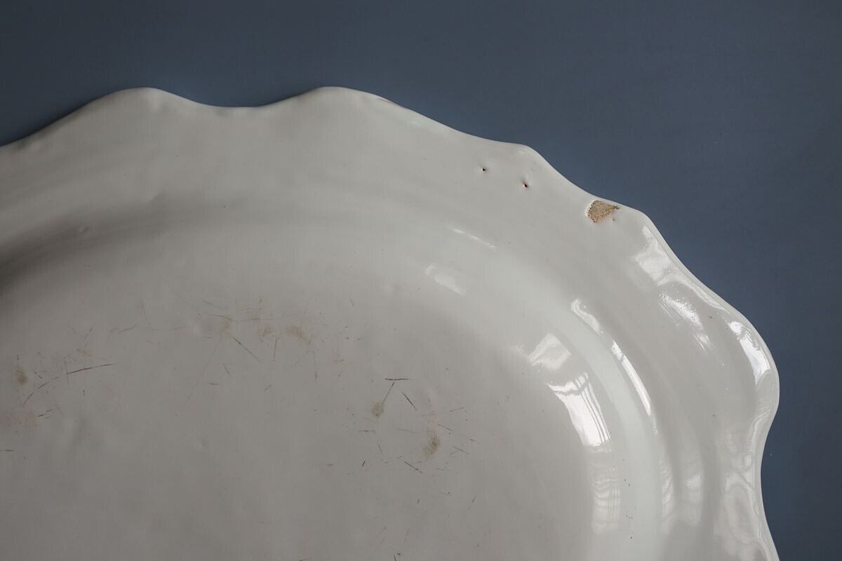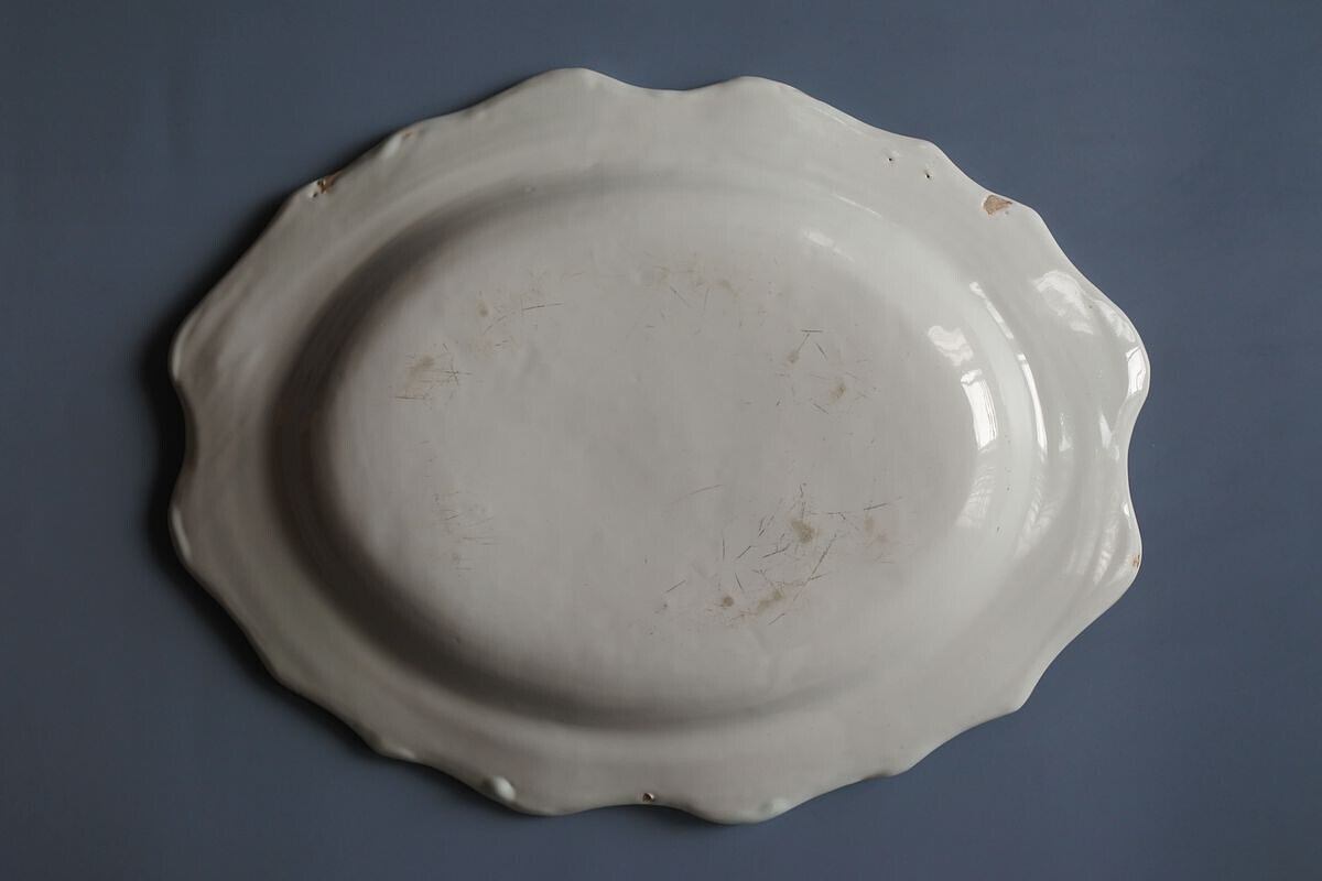 ふわりとした印象の白釉皿。しっかりした厚みがあり、光の当たり具合で薄っすらブルーがかって見えます。×印はありませんが、ムスティエ窯か、近郊で焼かれていた同質の皿だと思われます。プロヴァンス地方にあるムスティエは中世から続く小さな焼きものの村ですが、17世紀半ばイタリアの修道士によってもたらされた技術により、艶めく白い釉薬が魅力的な陶器の窯元として広く知られるようになりました。見込みにカトラリーでついたような跡が幾つか見られますが、欠けや割れ、釉薬の剥がれなどはありません。優雅な花リムが、テーブルに華やかさを添えてくれそうです。