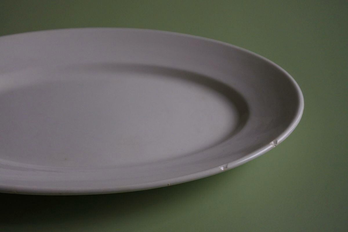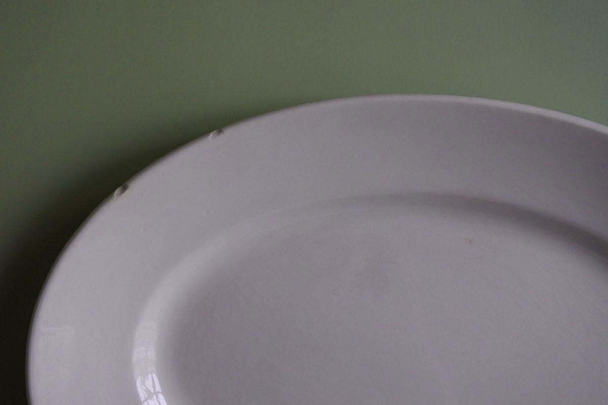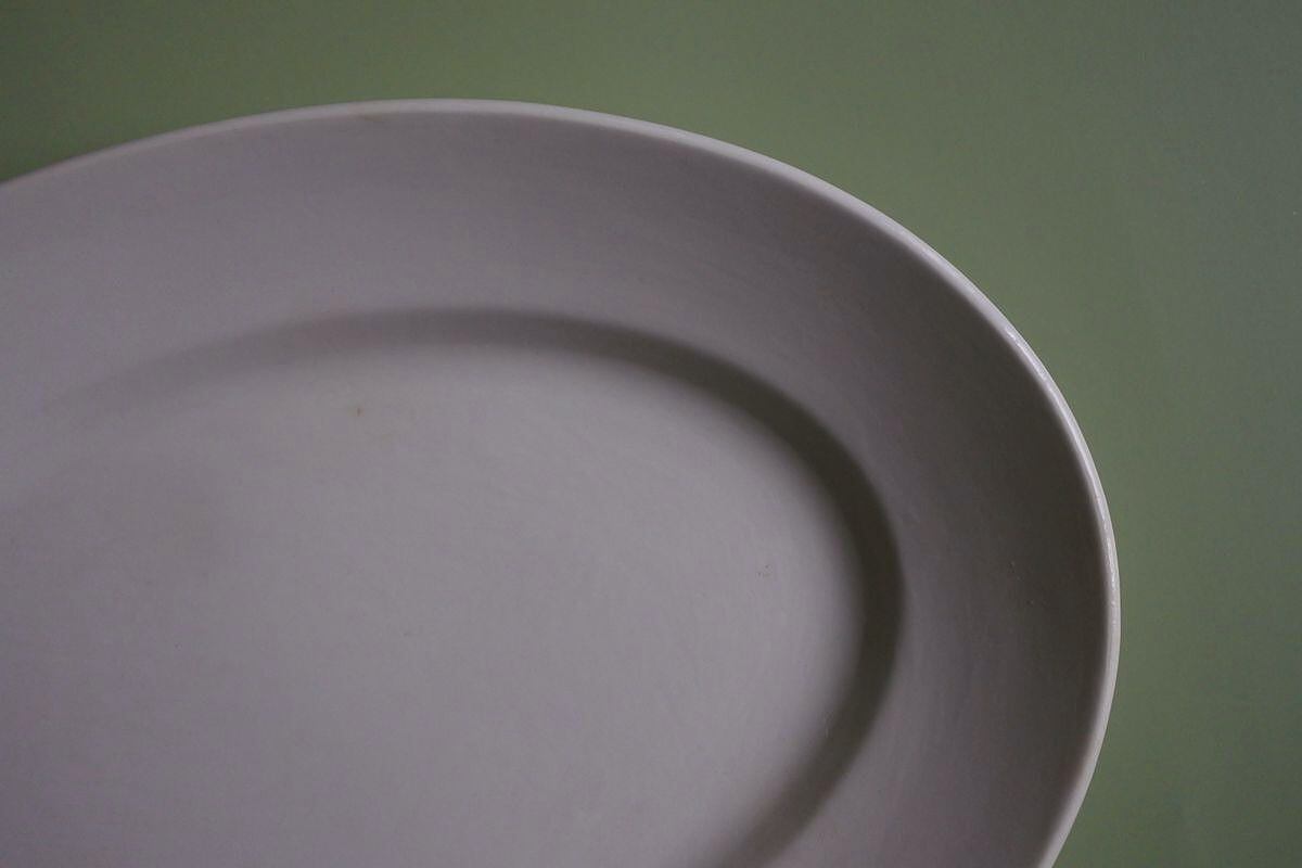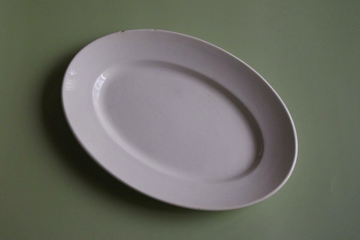 プレーンなオーバル皿。Digoin &Serreguemines(ディゴワン&サルグミンヌ)の1920~1950年頃に使用されていた窯印があります。シンプルですが、厚みのあるマットな釉薬の質感が、古い時代の陶器ならではの柔らかさや温かみを感じさせます。手頃なサイズで、パンやフルーツ、普段のお料理を引き立ててくれそうです。リムに生地の凹凸が2か所見られますが、目立った劣化のない比較的きれいな品です。
