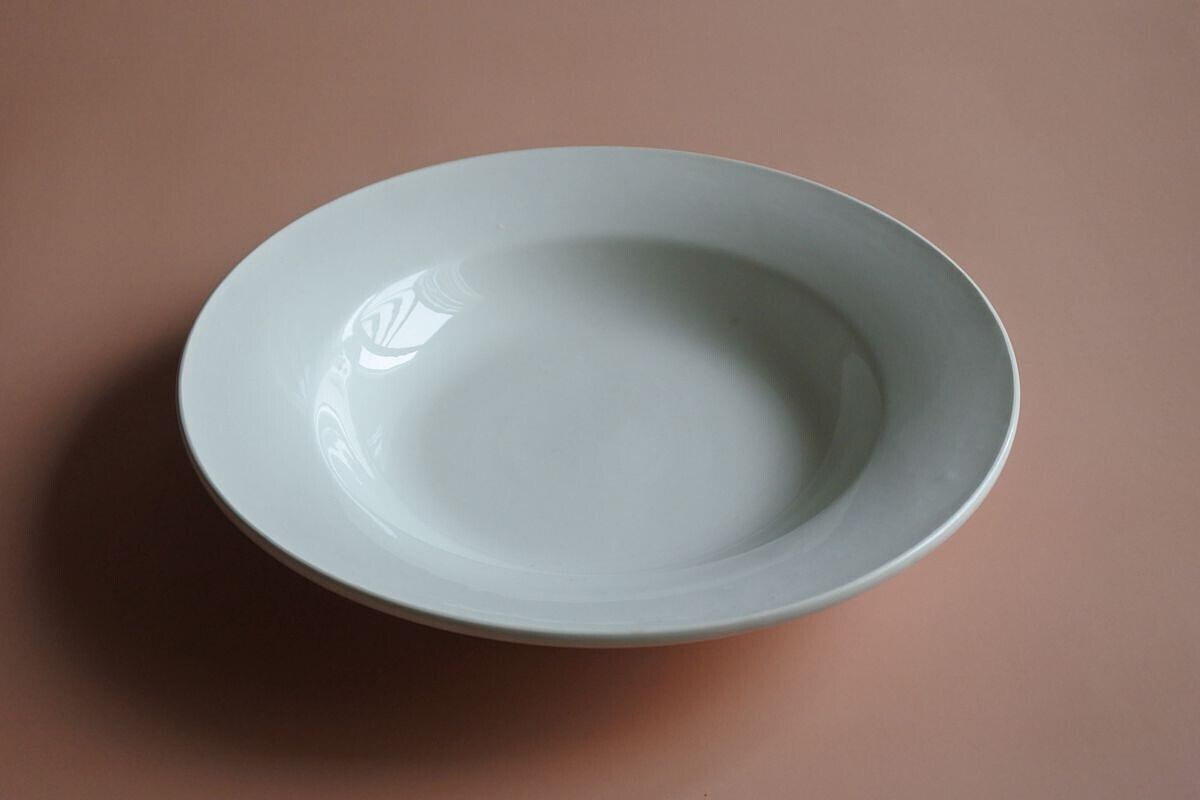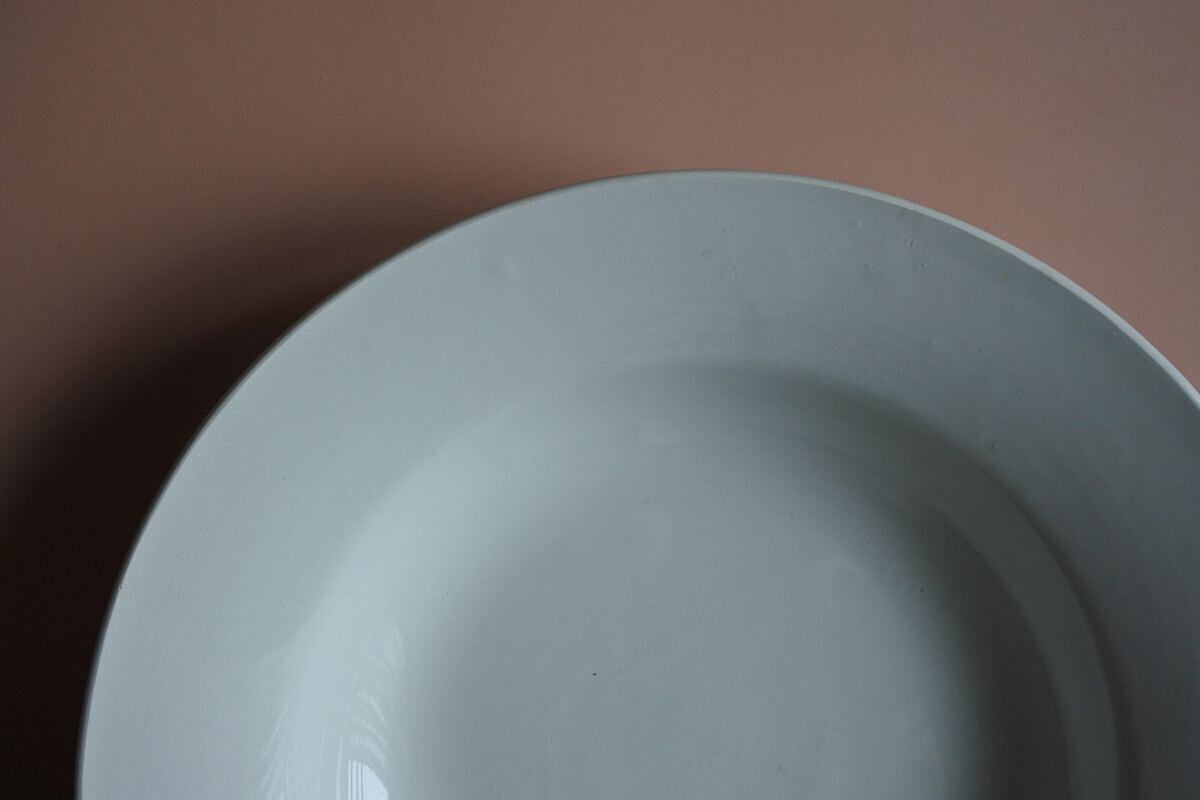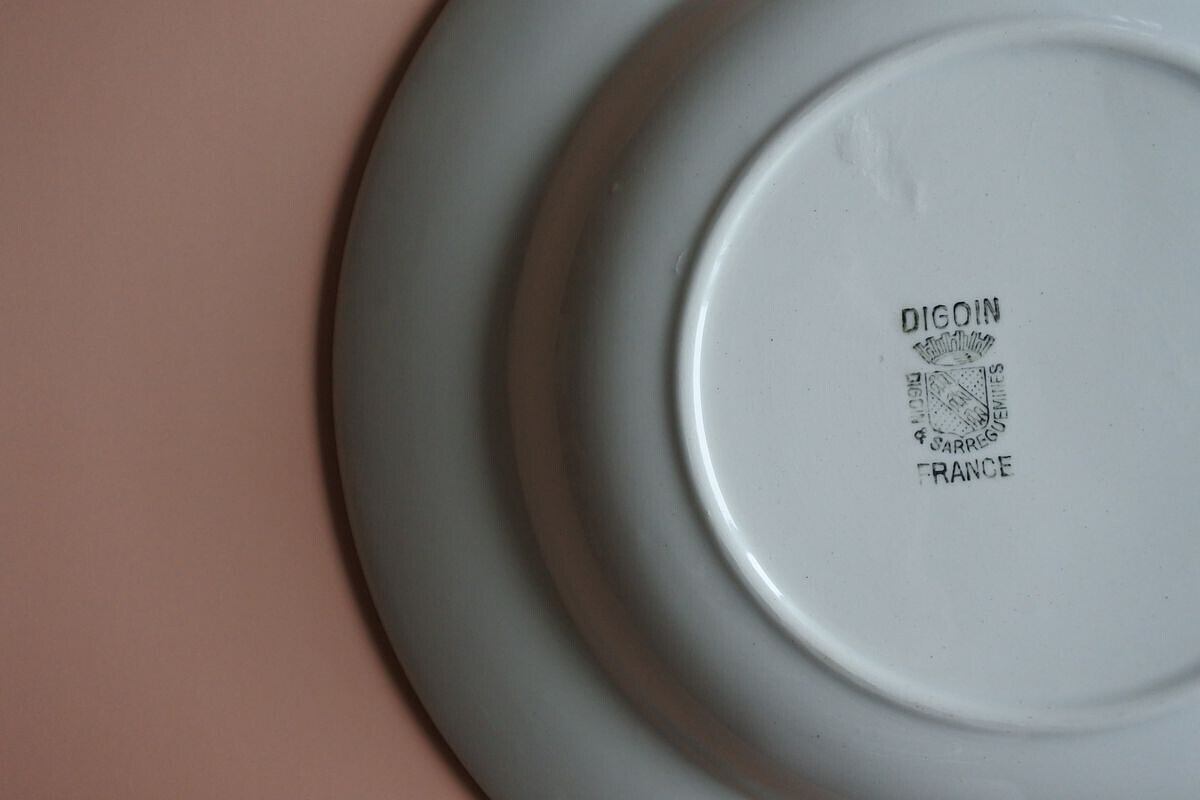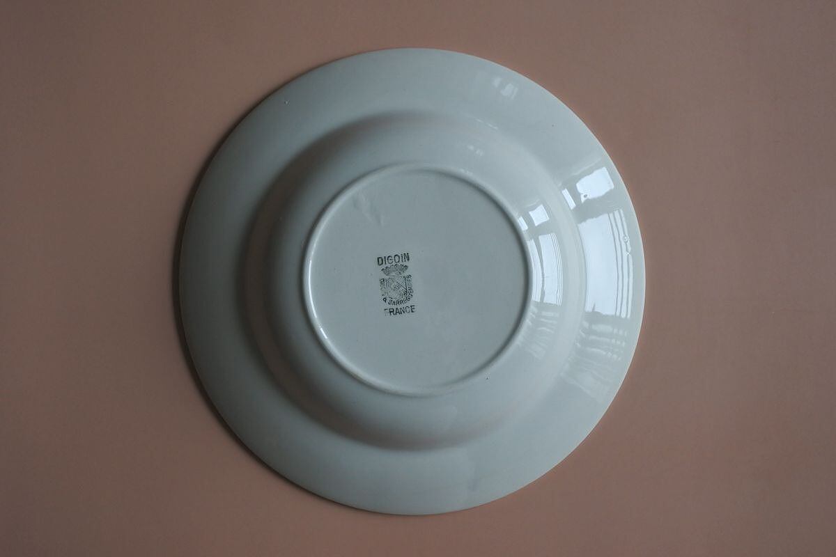 ぽってりした厚みのあるスープ皿。Digoin Serreguemines(ディゴワン&サルグミンヌ)の1920~1950年頃に使用されていた窯印があります。シンプルなフォルムですが、マットな釉薬の質感が、古い時代の陶器ならではの柔らかさや温かみを感じさせます。スープだけでなく、サラダやパスタ、デザートなど普段のお料理を引き立ててくれそうです。