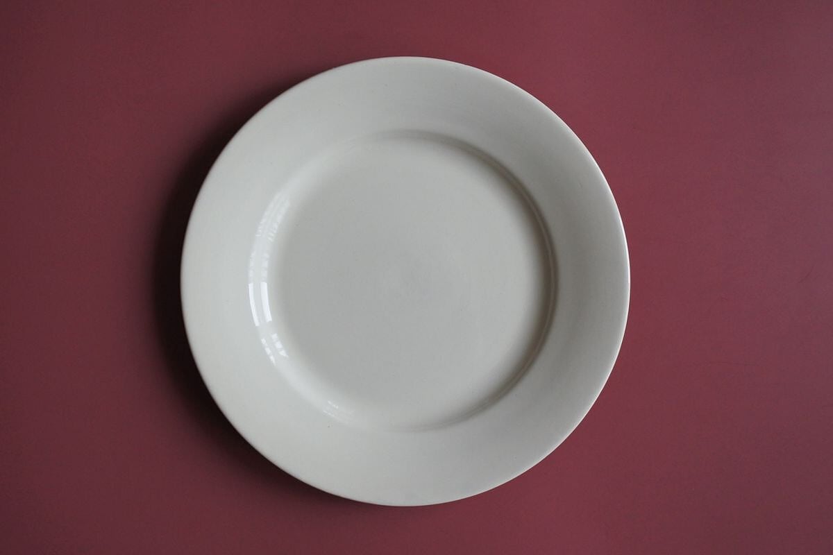 Digoin Serreguemines(ディゴワン&サルグミンヌ)の窯印のある、ぽってりしたプレーンな平リム皿。1920~1950年頃のものです。シンプルですが、マットな釉薬の質感が、古い時代の陶器ならではの柔らかさや温かみを感じさせます。同じ仕様でも、厚みや歪みなど僅かに異なるのも味わい。約23cmの手頃なサイズで、トーストやサラダ、気取らないメイン用のプレートとしても楽しめそうです。