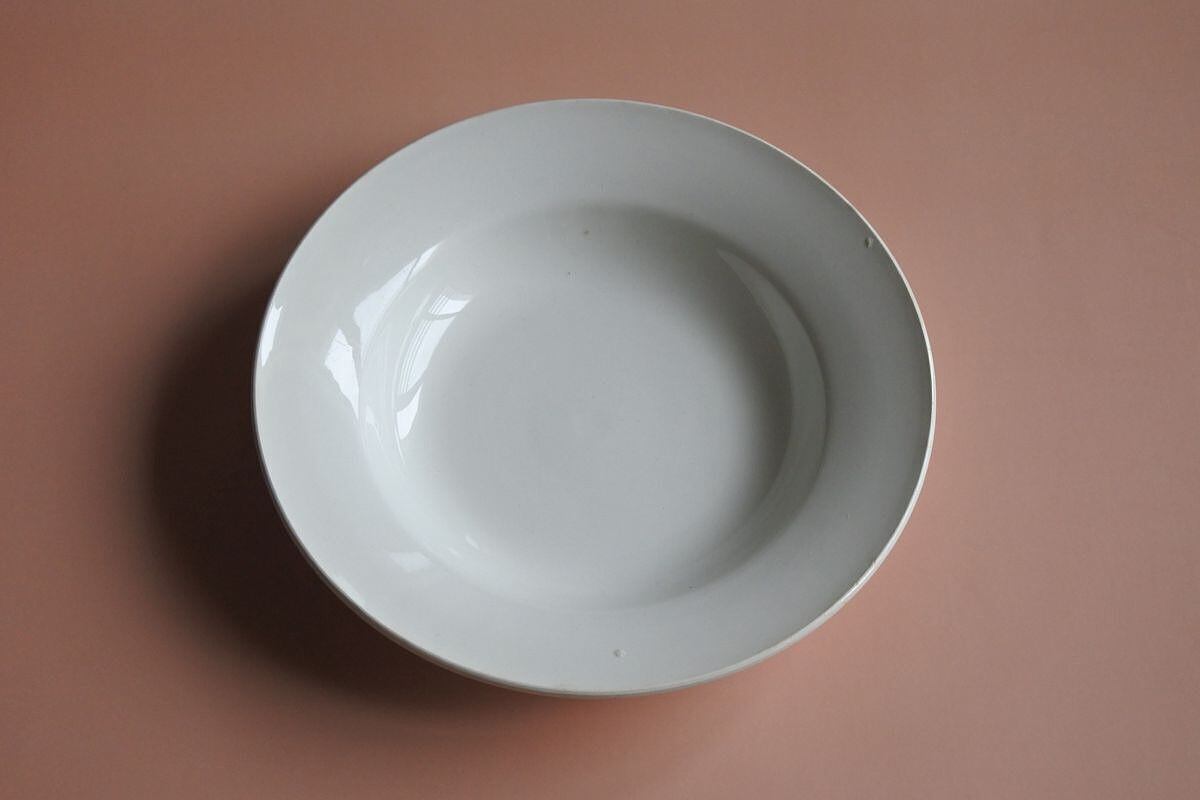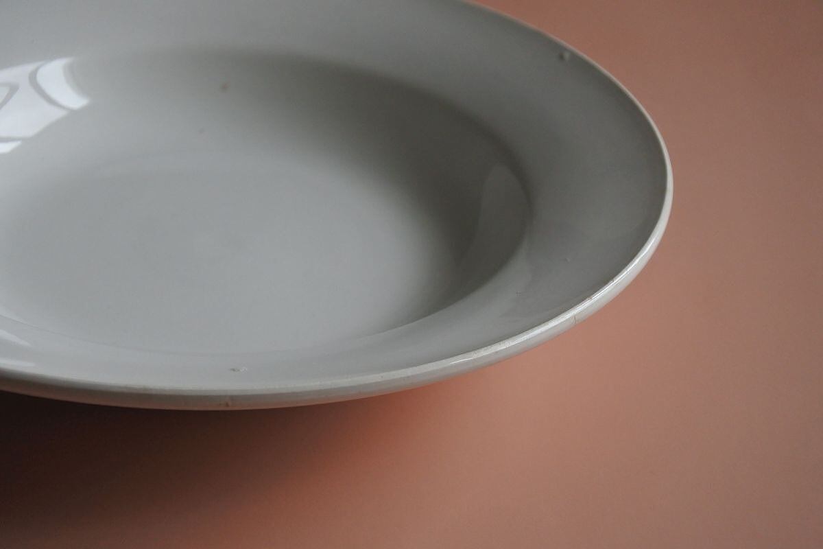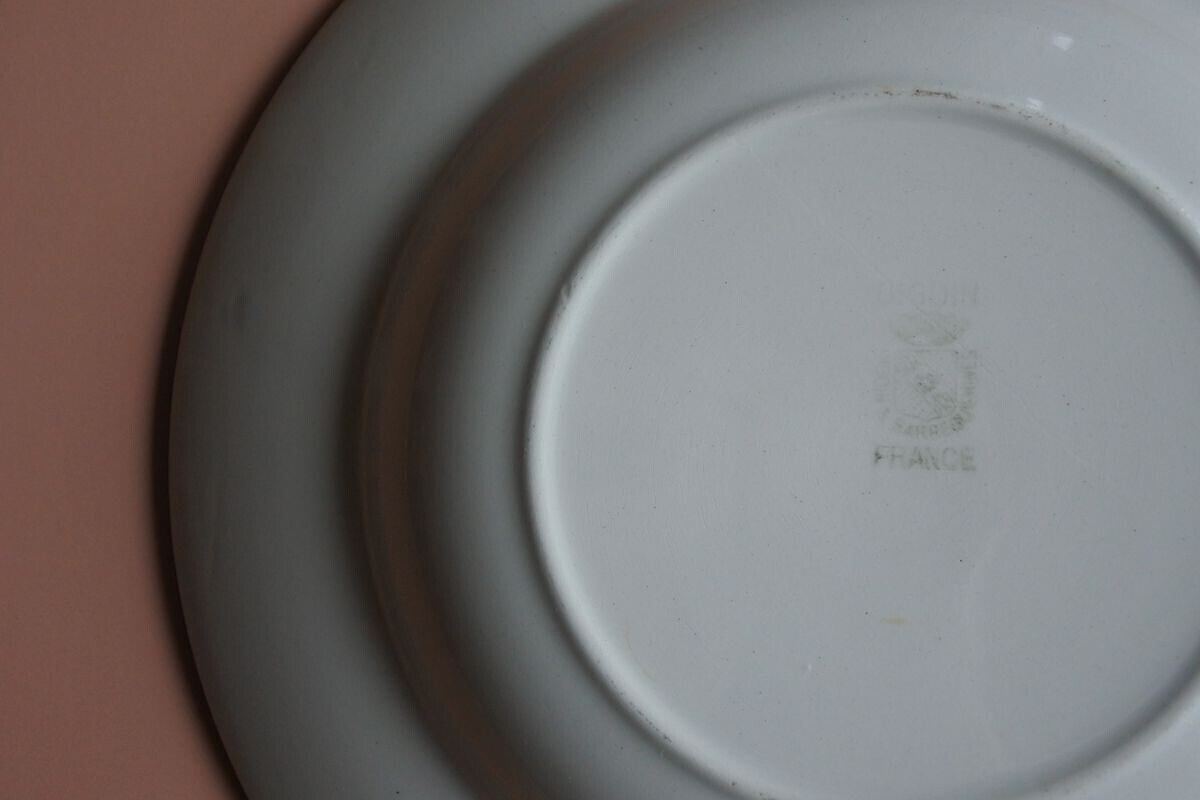 ぽってりした厚みのあるスープ皿。Digoin Serreguemines(ディゴワン&サルグミンヌ)の1920~1950年頃に使用されていた窯印があります。シンプルなフォルムですが、マットな釉薬の質感が、古い時代の陶器ならではの柔らかさや温かみを感じさせます。同じ仕様でも、厚みや歪みなど僅かに異なるのも味わい。スープだけでなく、サラダやパスタ、デザートなど普段のお料理を引き立ててくれそうです。