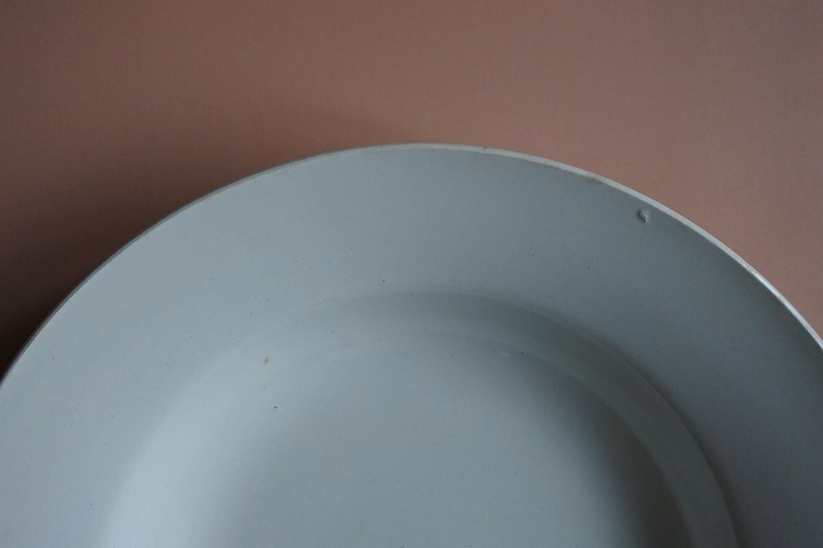 大きな割れや欠けなし。全体に釉薬のムラ、凹凸あり。小さな異物、黒点(窯焼きの際に生じたと思われる)あり。リムの異物はやや大きめです(写真4・5)。リムの縁に薄っすら色付きあり。高台に擦れによる汚れあり。無傷ではありませんが、ほとんど使用感のない品です。
