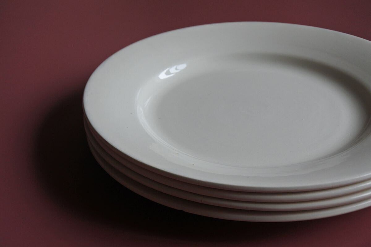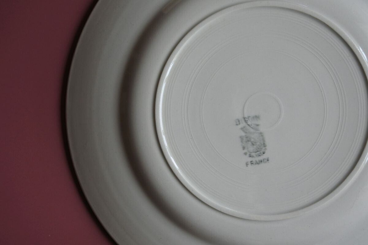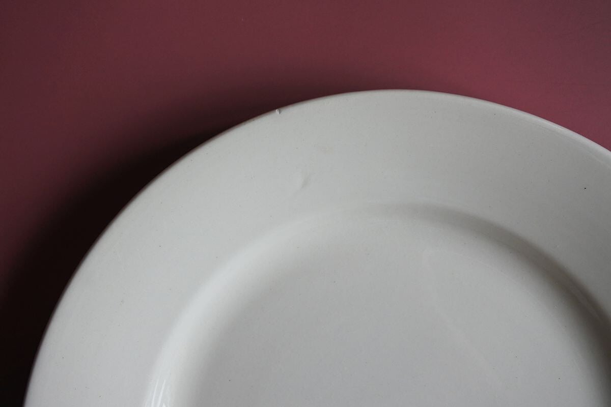 Digoin Serreguemines(ディゴワン&サルグミンヌ)の窯印のある、ぽってりしたプレーンな平リム皿。1920~1950年頃のものです。シンプルですが、マットな釉薬の質感が、古い時代の陶器ならではの柔らかさや温かみを感じさせます。同じ仕様でも、厚みや歪みなど僅かに異なるのも味わい。約23cmの使いやすいサイズで、トーストやサラダ、気取らないメイン用のプレートとしても楽しめそうです。