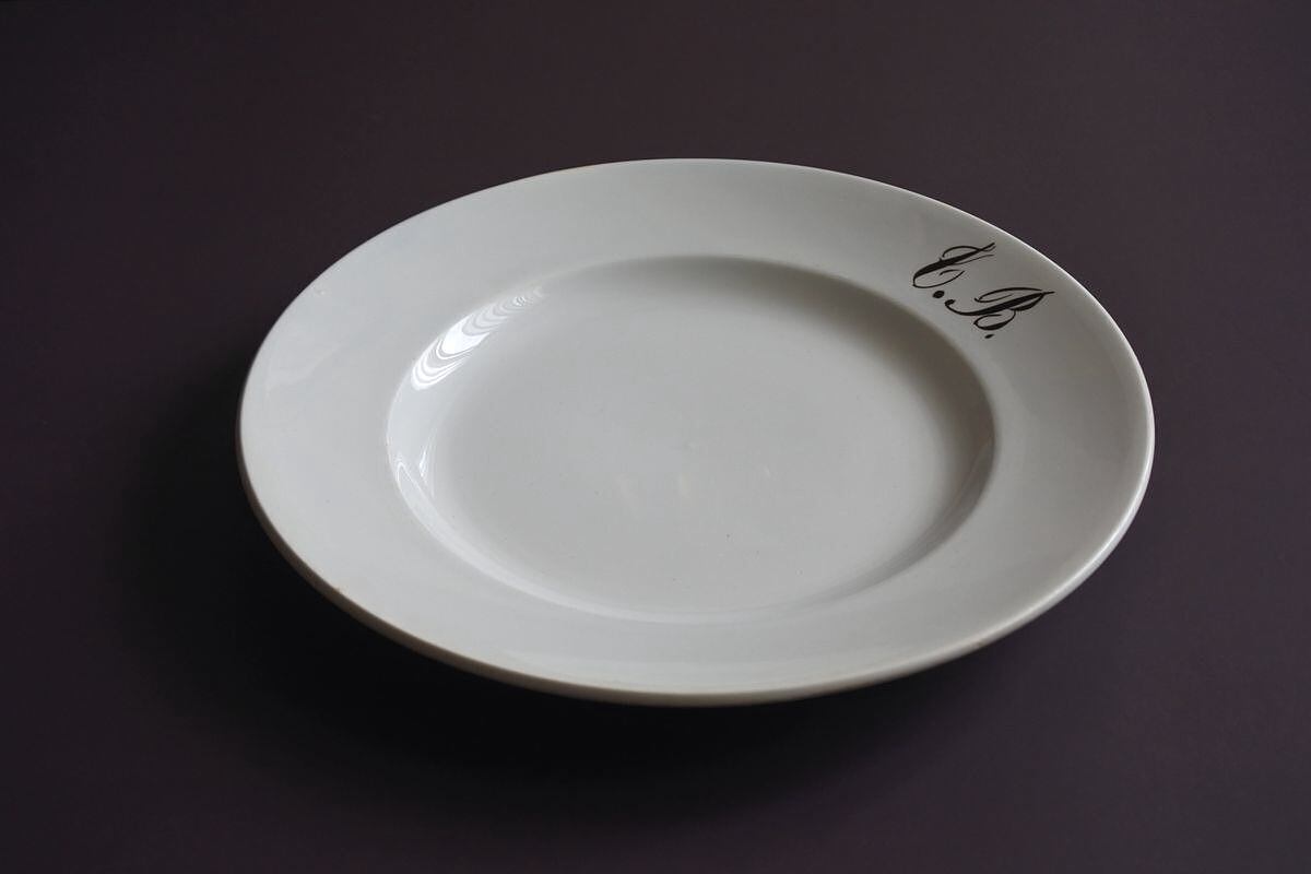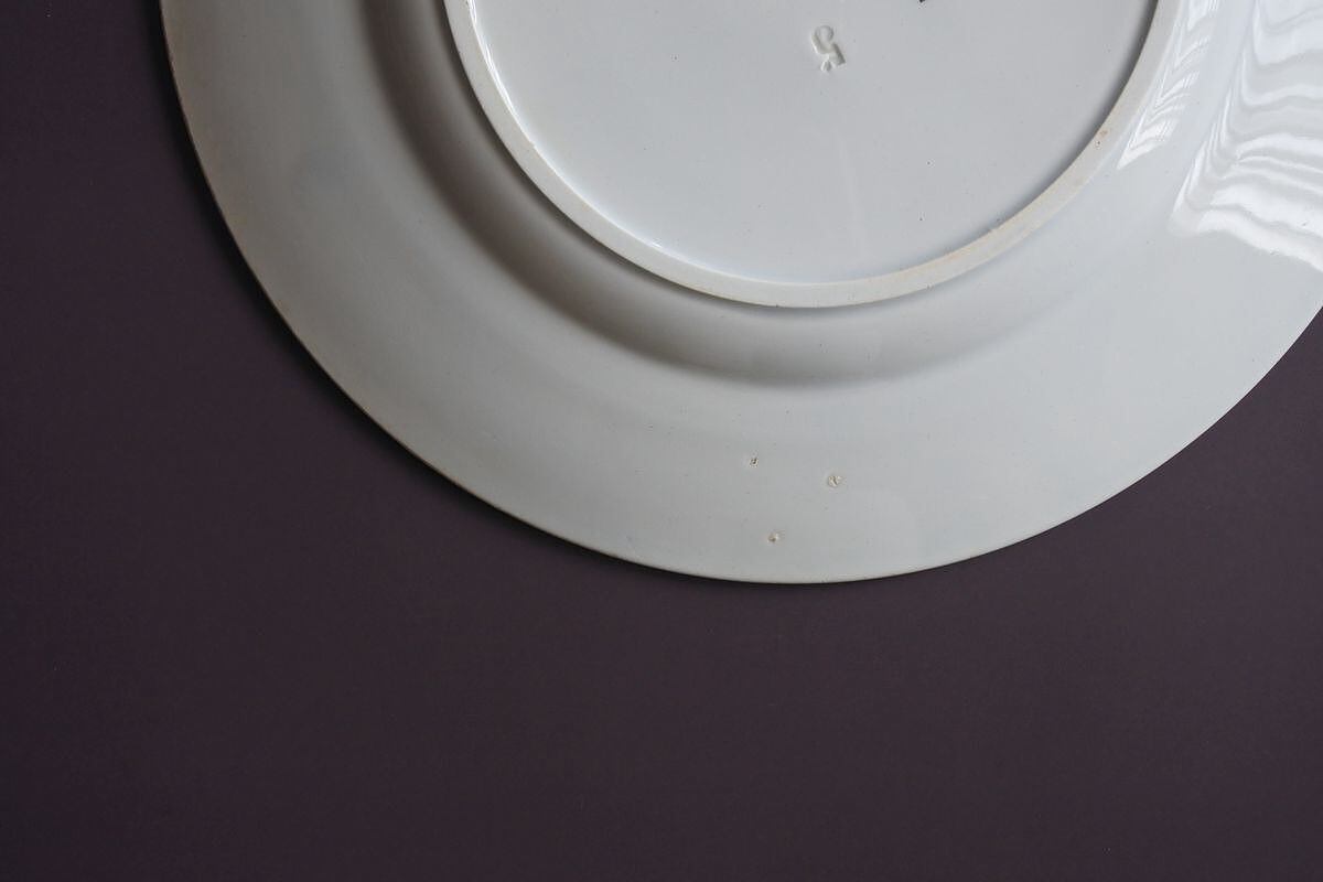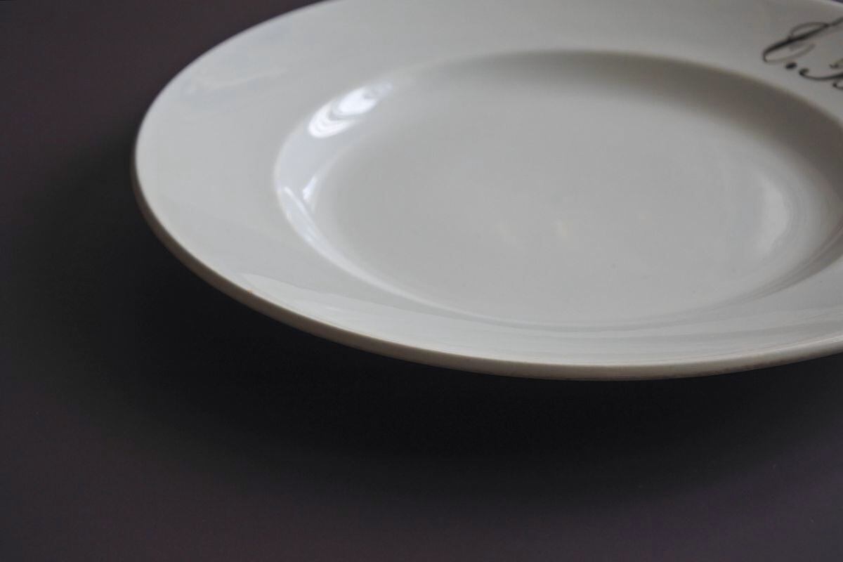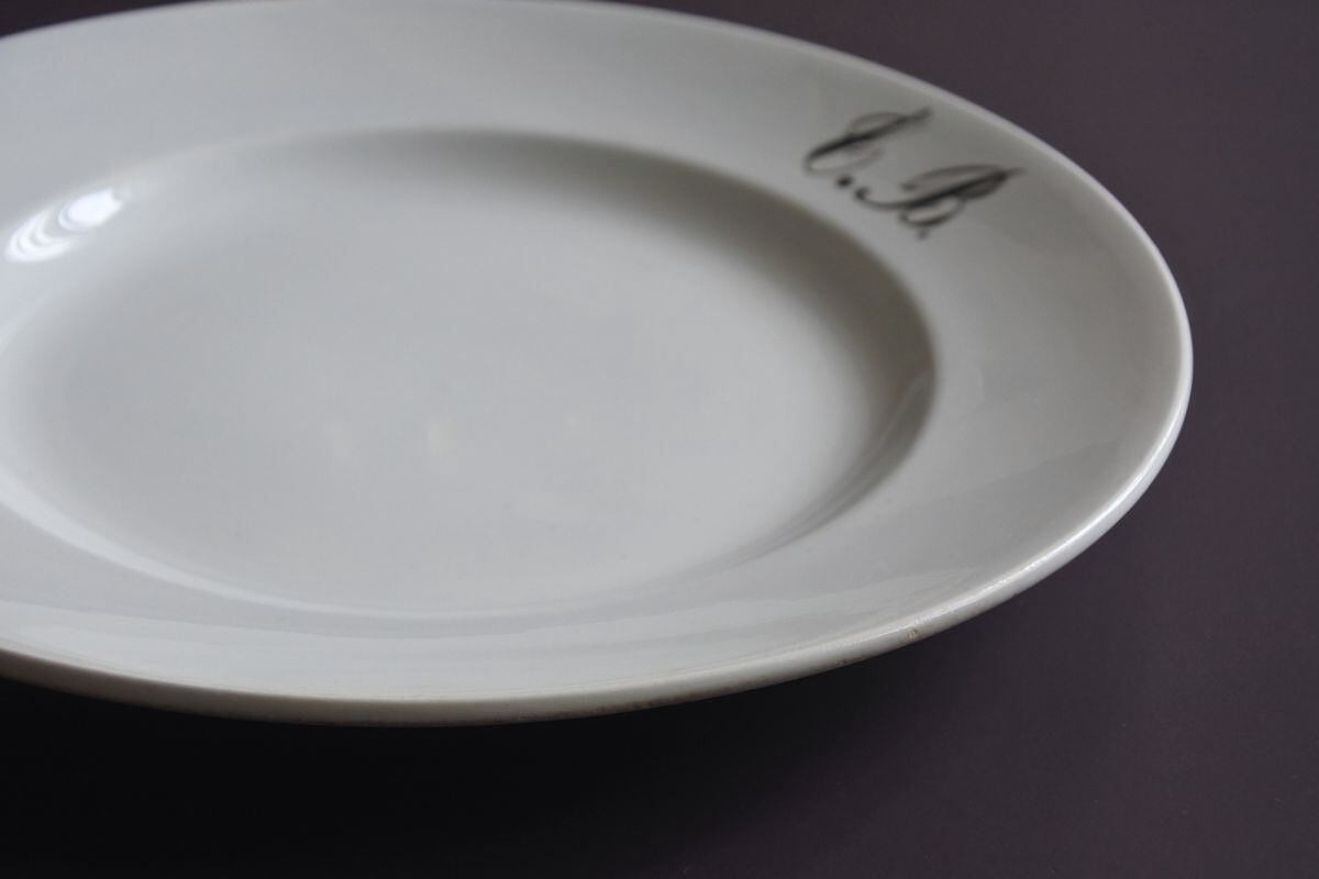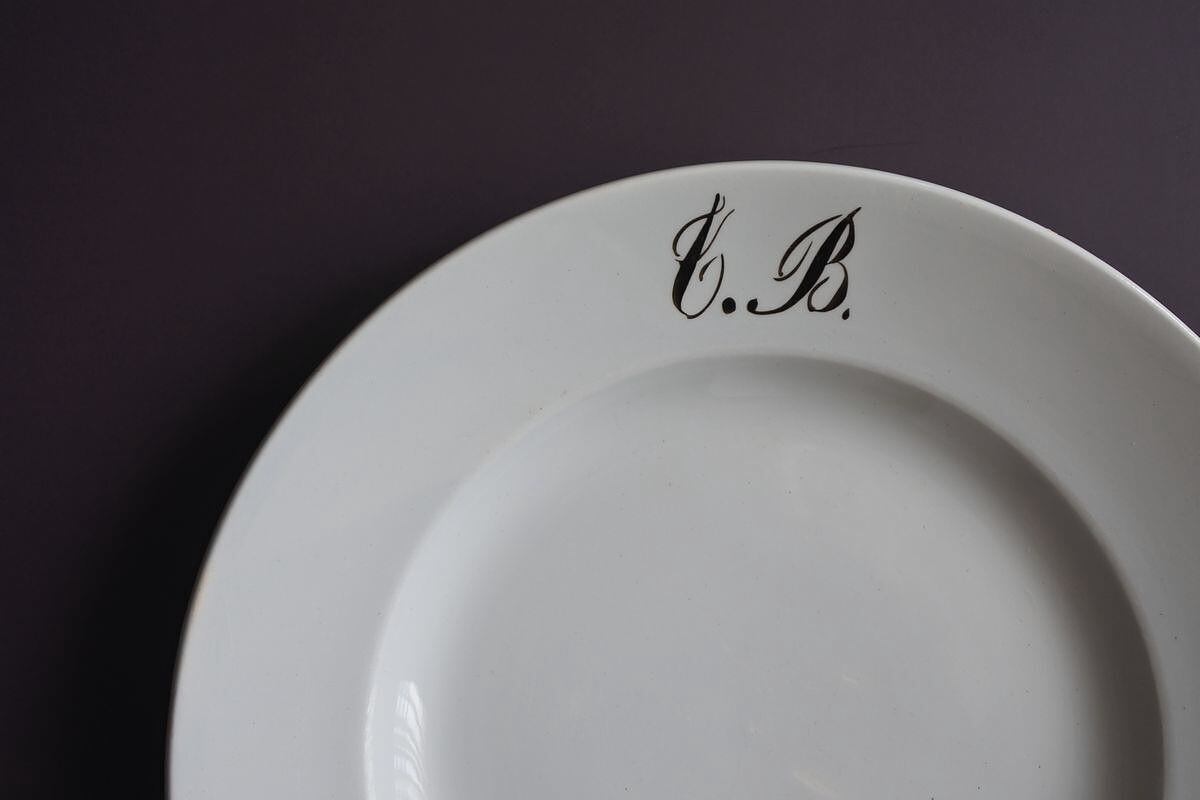 ぱりっとした白に、柔らかなタッチの黒のモノグラムが洒落た味わい。フランス北部の街で、ファイアンス焼きの工房としてスタートした Saint- Amand(サンタマン)窯の、19世紀終わり頃の平リム皿です。すっきりした印象ですが厚みがあり、釉薬の控えめな艶めきも魅力のひとつ。取り皿にも飾らないメイン用にも使えるサイズ感で、いつものお料理やデザートを、ちょっと違った表情に見せてくれそうです。