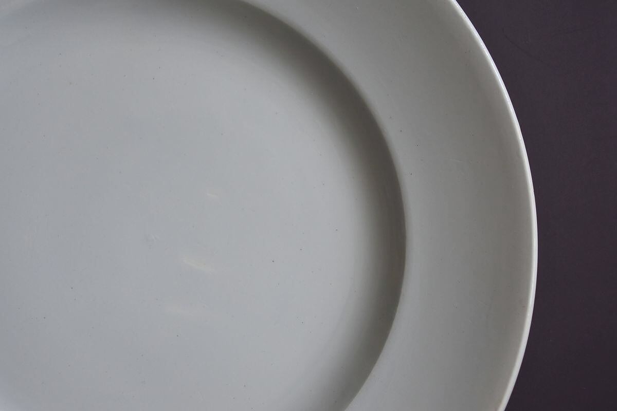 大きなひびなし。色味は白。全体に釉薬のムラがあり、所々青みがかって見えます。小さな異物、黒点(窯焼きの際に生じたと思われる)あり。表面見込みに釉薬の凹凸あり(写真4)。裏面高台に欠けあり(置いた時にガタつくなどの影響はありません)(写真5)。無傷ではなく劣化も見られますが、使用感のない品です。