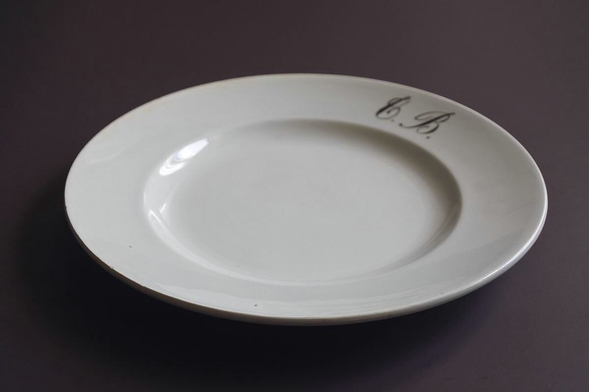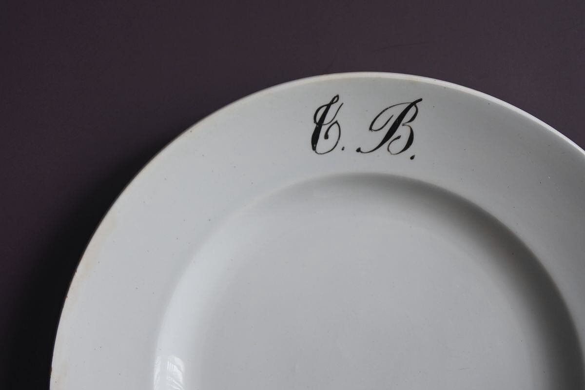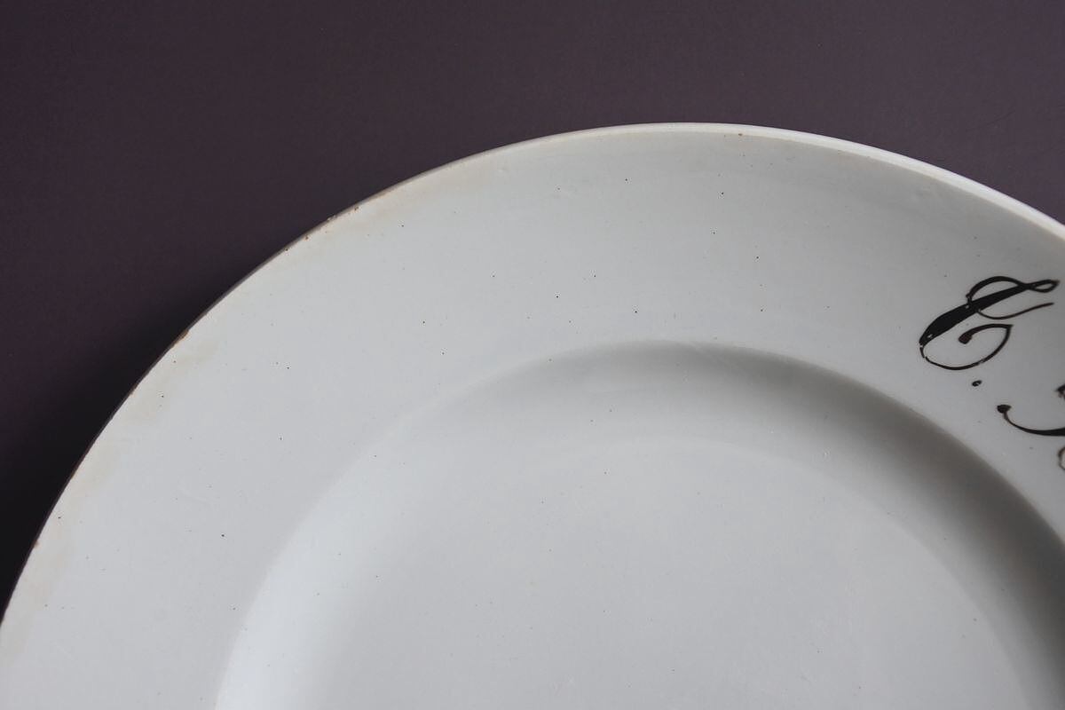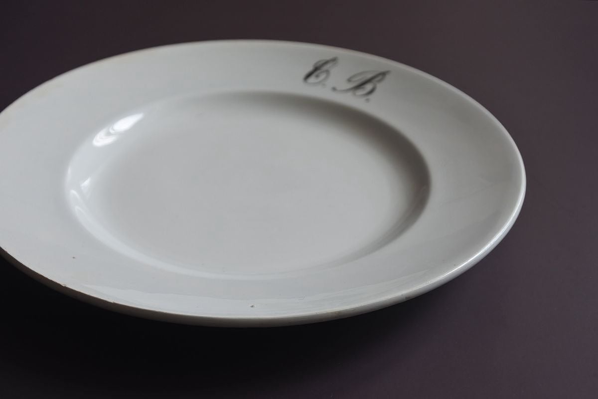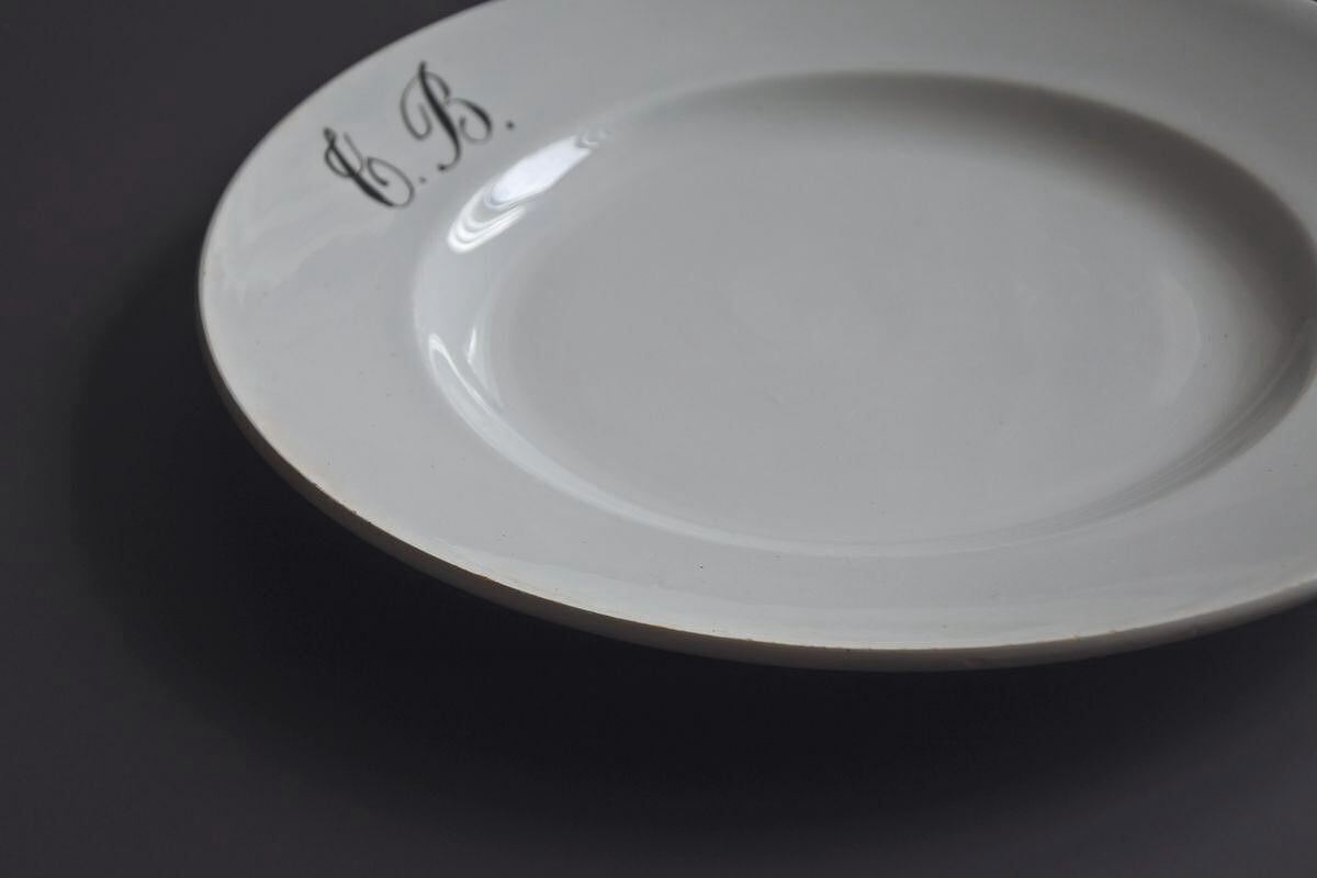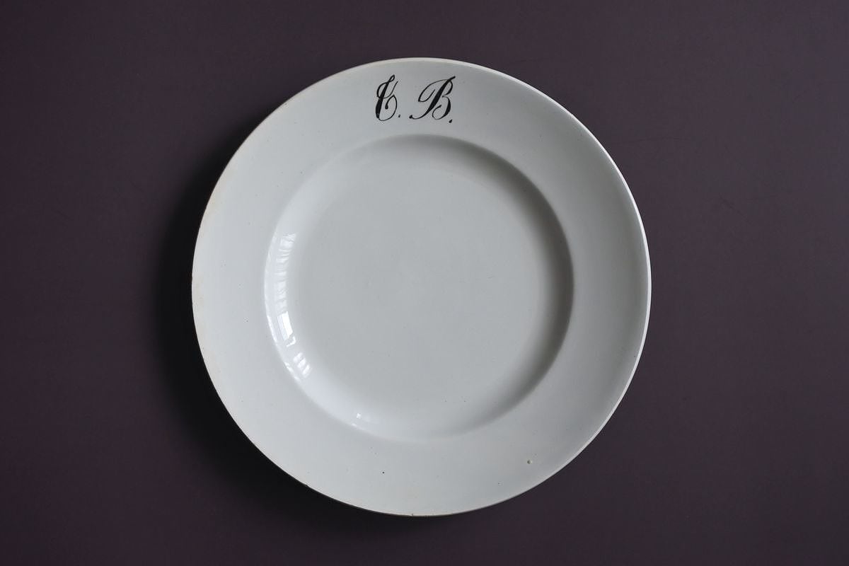 ぱりっとした白に、柔らかなタッチの黒のモノグラムが洒落た味わい。フランス北部の街で、ファイアンス焼きの工房としてスタートした Saint- Amand(サンタマン)窯の、19世紀終わり頃の平リム皿です。すっきりした印象ですが厚みがあり、釉薬の控えめな艶めきも魅力のひとつ。取り皿にも飾らないメイン用にも使えるサイズ感で、いつものお料理やデザートを、ちょっと違った表情に見せてくれそうです。