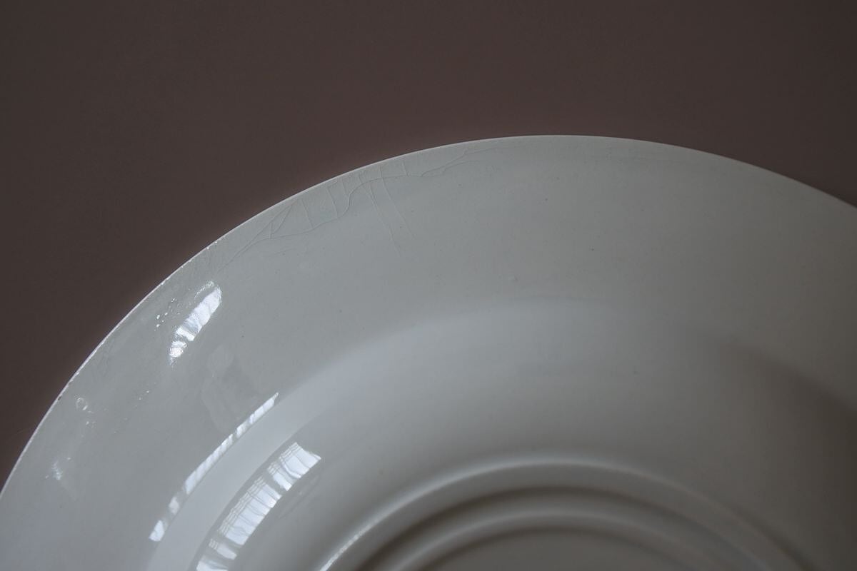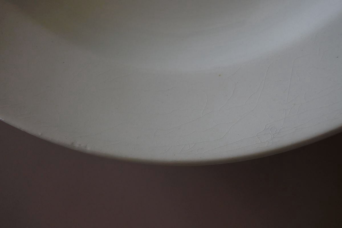 欠けなし。明るい白。あまり目立ちませんが、リムと見込みの一部に貫入が見られます(写真4・5)。釉薬のムラ、小さな異物(窯焼きの際に生じたと思われる)あり。貫入以外は劣化が少なく、使用感のないきれいな品です。
