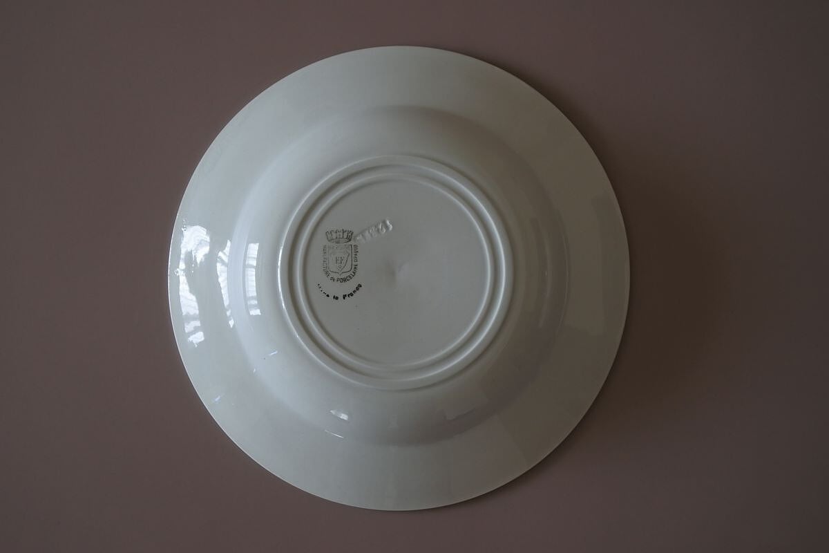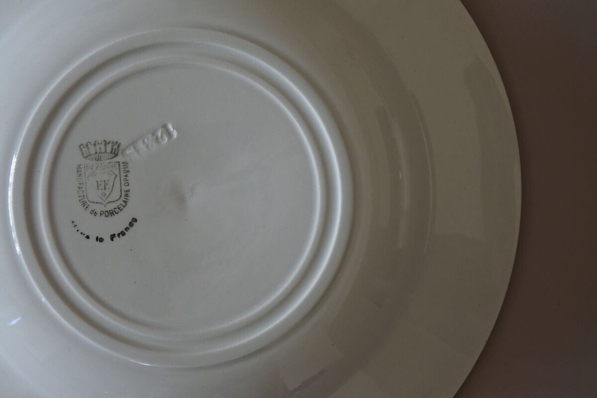 シンプルなスープ皿。フランス北東部ロレーヌ地方にあったPexonne (ペクソンヌ)窯の窯印があります。以前同じ窯のスープ皿をご紹介しましたが、こちらは少し古い時代のもの。丸みのあるフォルム、釉薬のやわらかな質感や、手にした時の軽さなどは変わりませんが、艶のあるきりっとした白さが、盛り付けるものの色味をより鮮やかに引き立ててくれそうです。