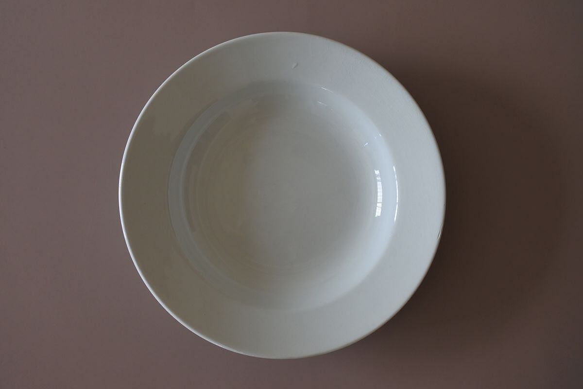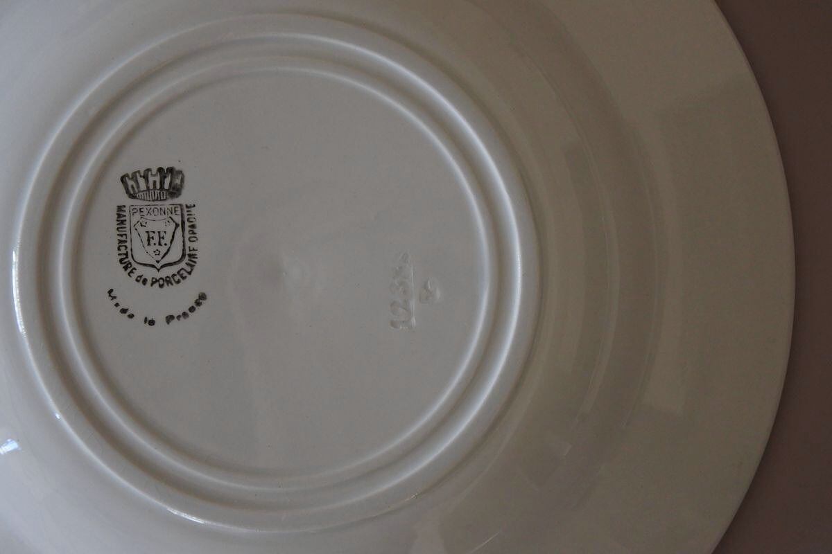 シンプルなスープ皿。フランス北東部ロレーヌ地方にあったPexonne (ペクソンヌ)窯の窯印があります。以前同じ窯のスープ皿をご紹介しましたが、こちらは少し古い時代のもの。丸みのあるフォルム、釉薬のやわらかな質感や、手にした時の軽さなどは変わりませんが、艶のあるきりっとした白さが、盛り付けるものの色味をより鮮やかに引き立ててくれそうです。