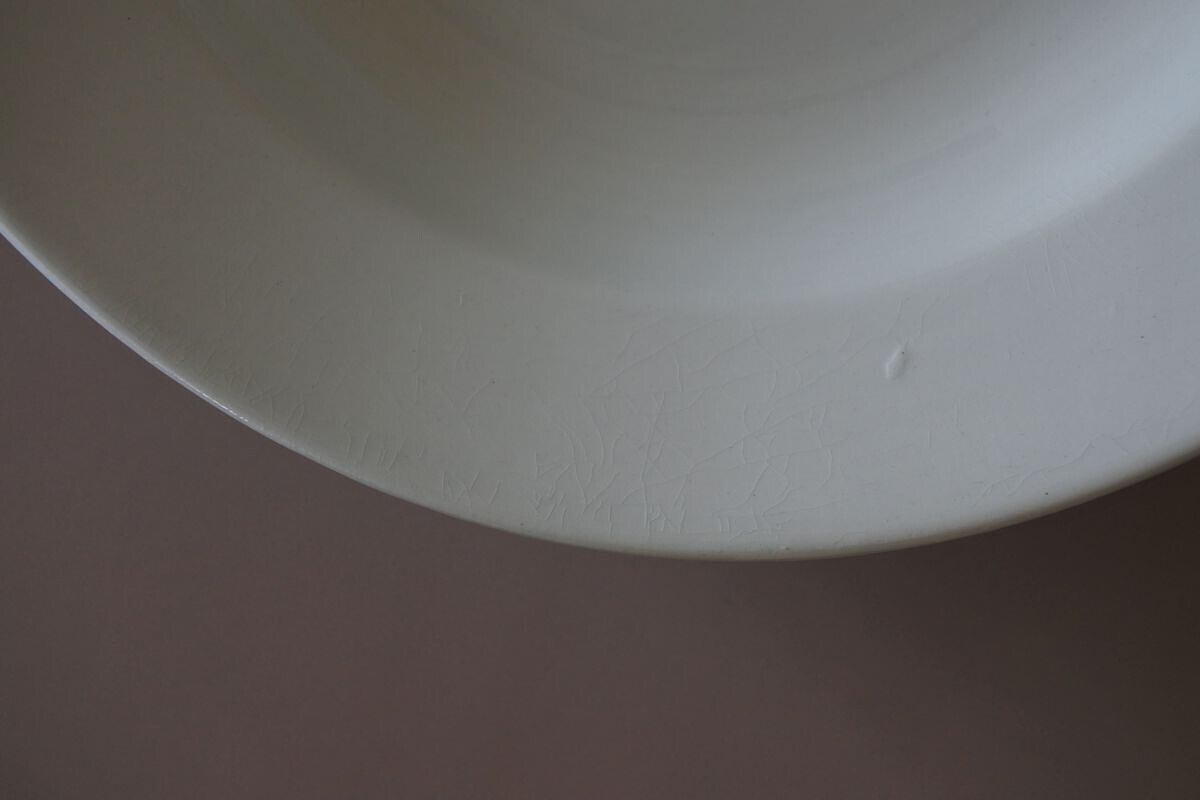 欠けなし。明るい白。あまり目立ちませんが、リムと見込みの一部に貫入が見られます(写真4・5)。釉薬のムラ、凹凸、異物(窯焼きの際に生じたと思われる)あり(写真4・5)。貫入以外は劣化が少なく、使用感のないきれいな品です。